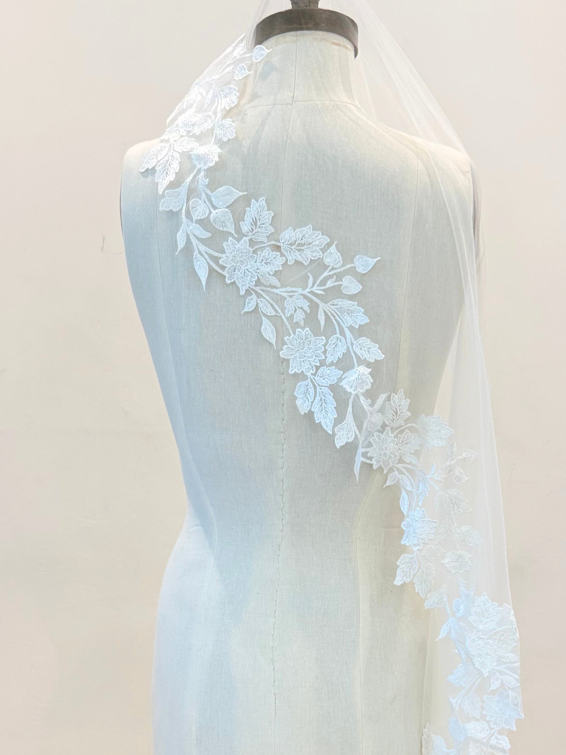 Velo con media cenefa de encaje de flores y hojas bordadas en tono ivory, con peineta