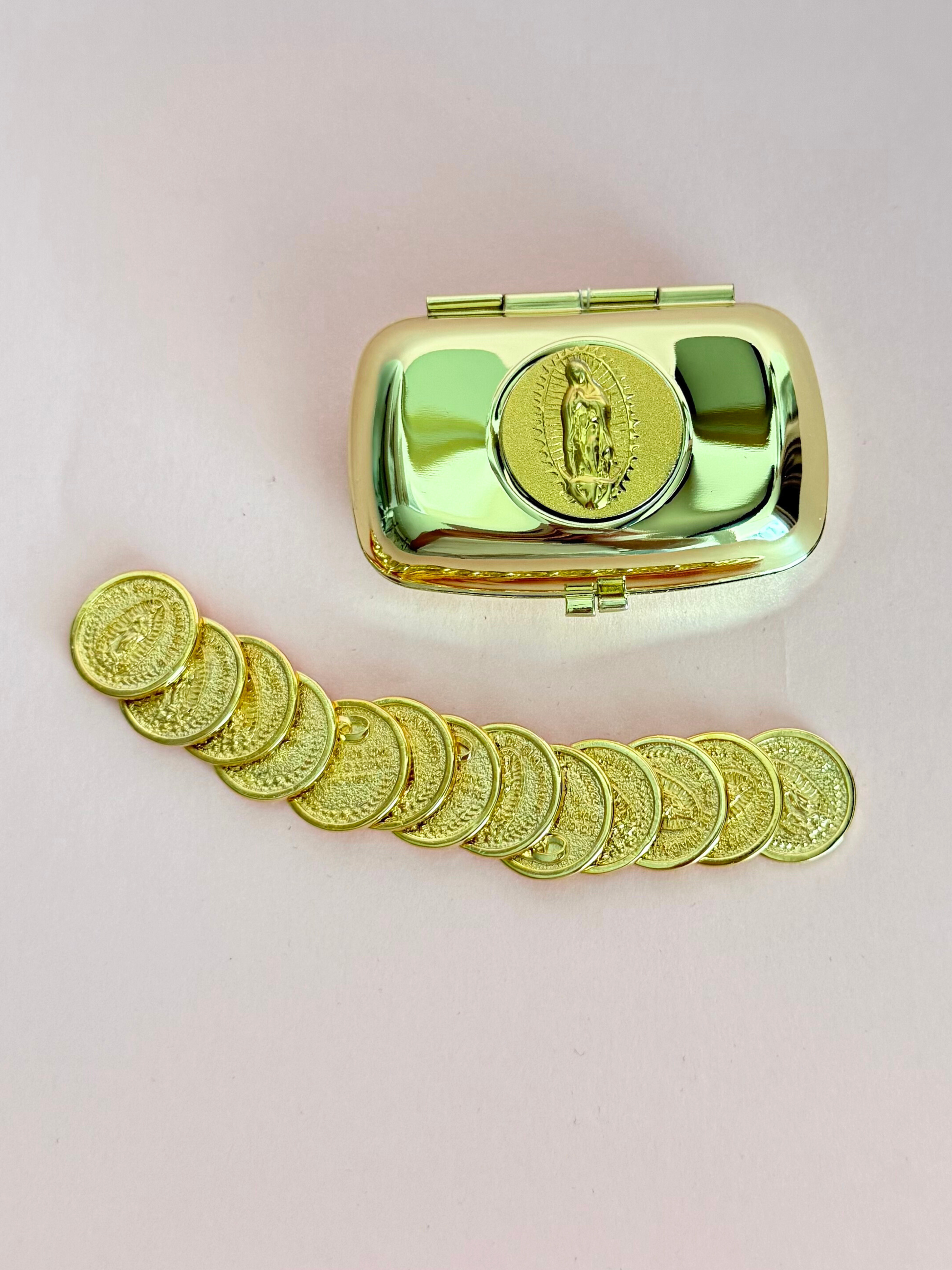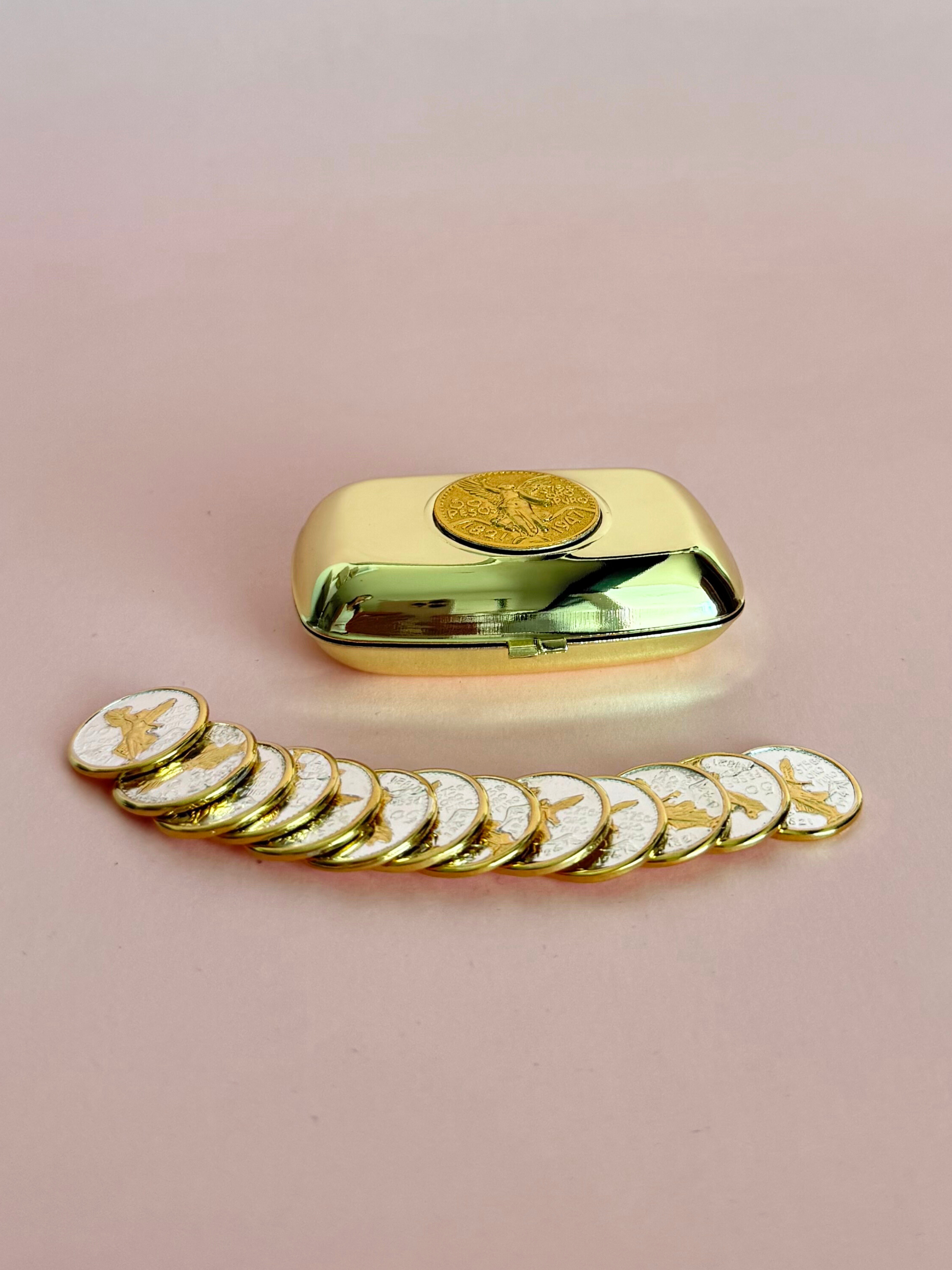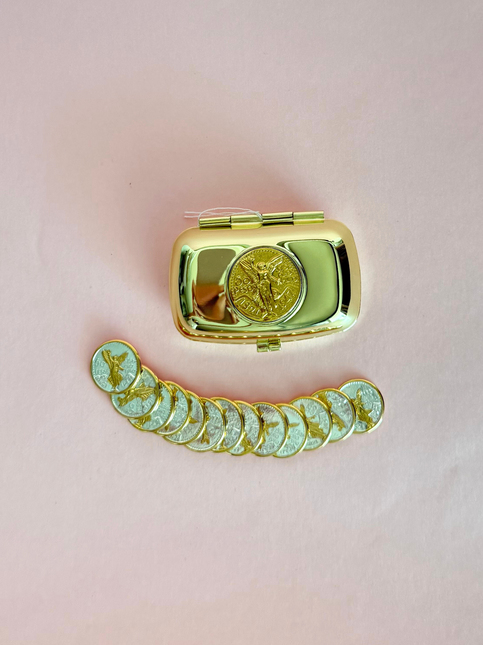 Alhajero de metal dorado con 13 monedas en chapa de oro con la imagen del angel de la independencia