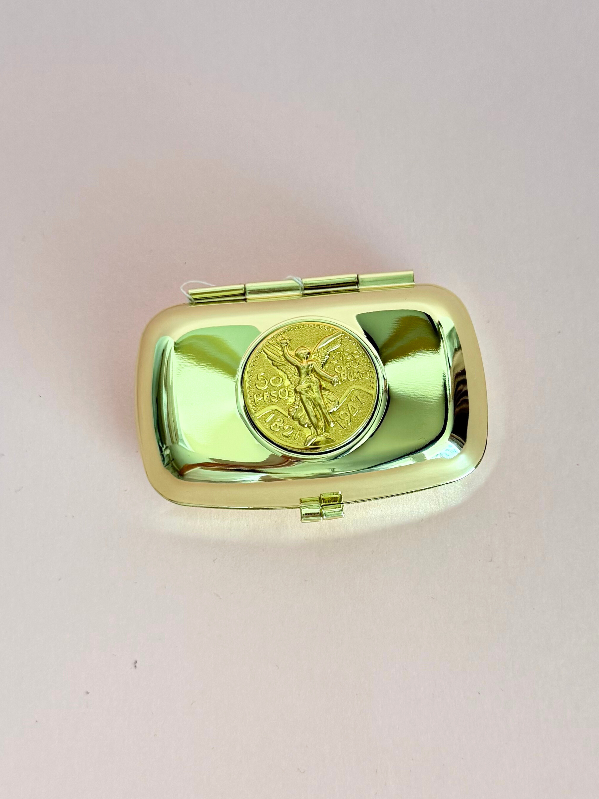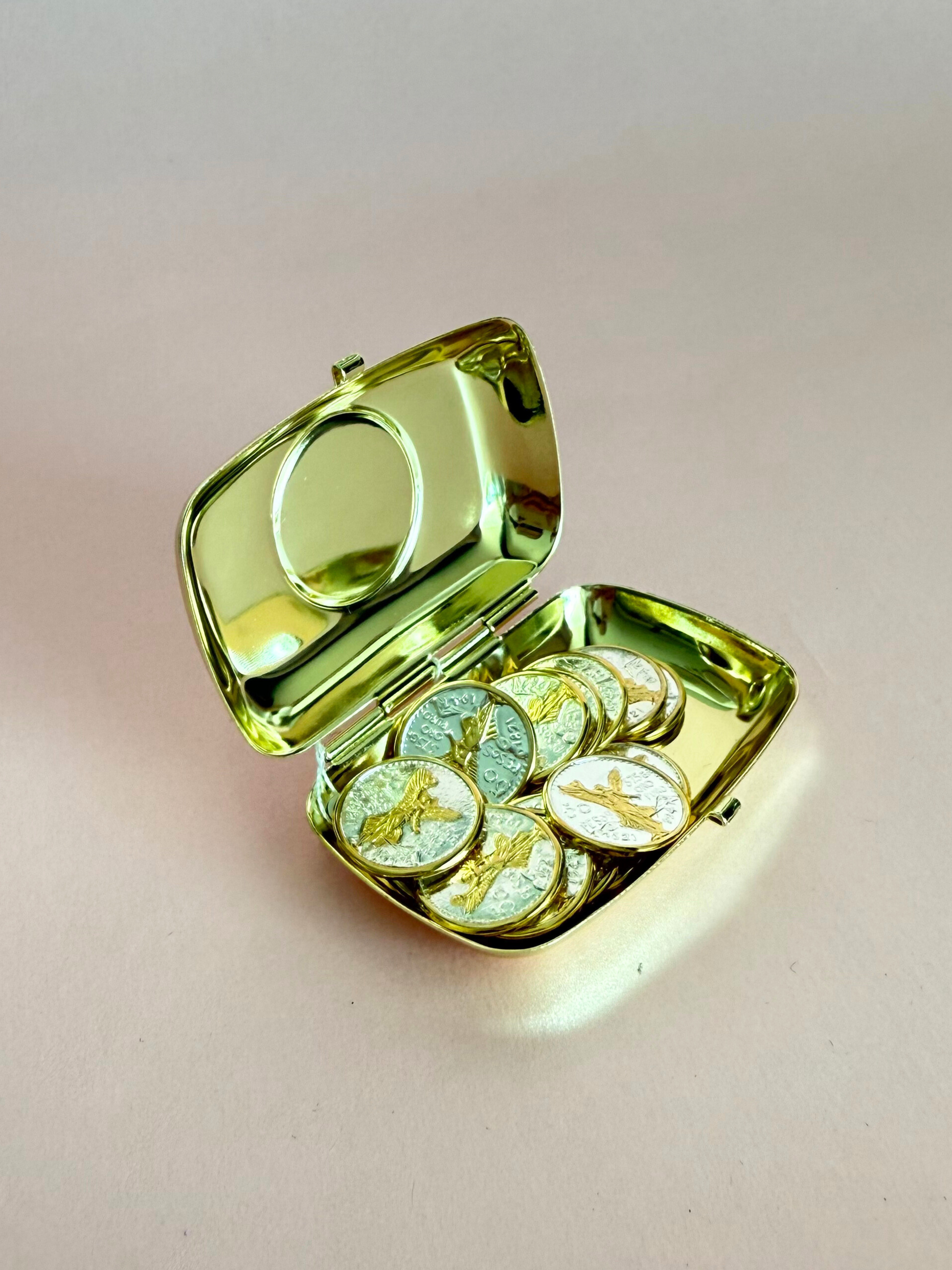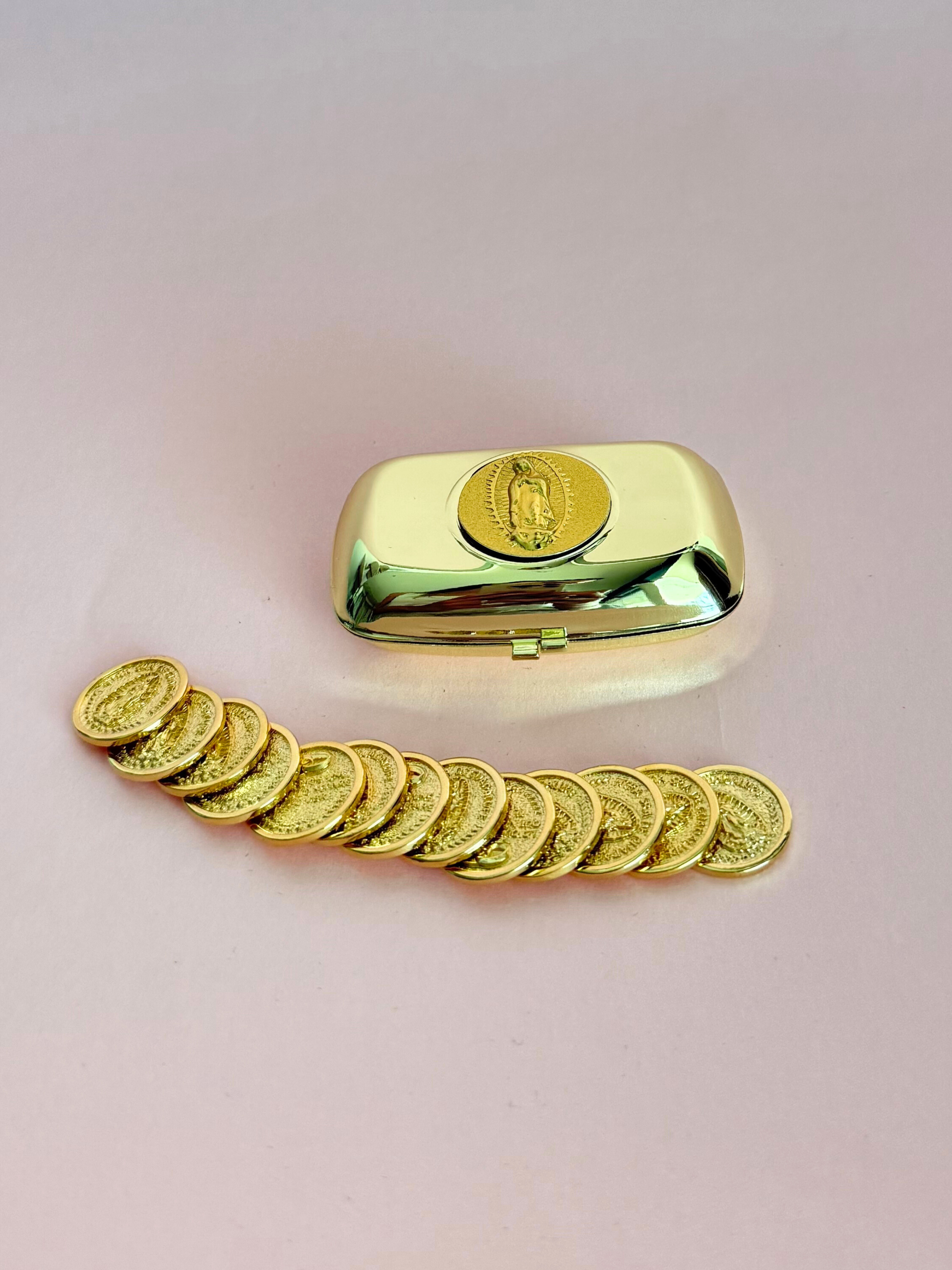 Alhajero de metal dorado con 13 monedas en chapa de oro con la imagen del angel de la independencia