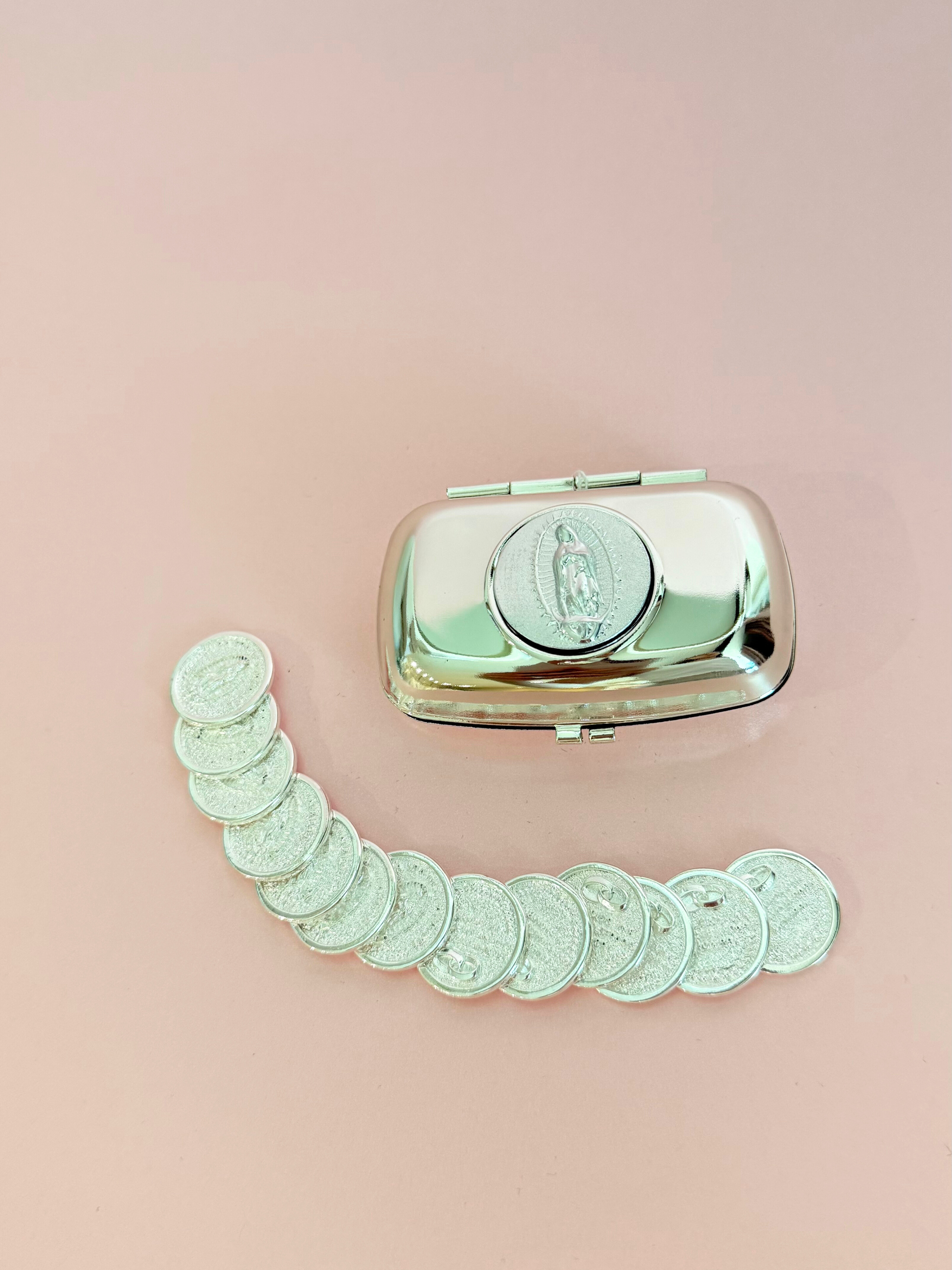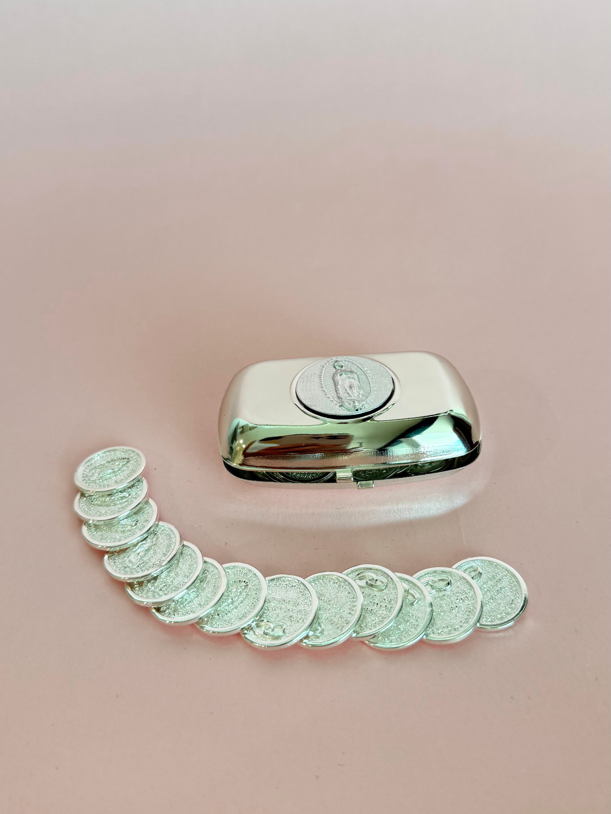 Alhajero de metal plateado con 13 monedas en chapa de oro con la imagen del angel de la independencia