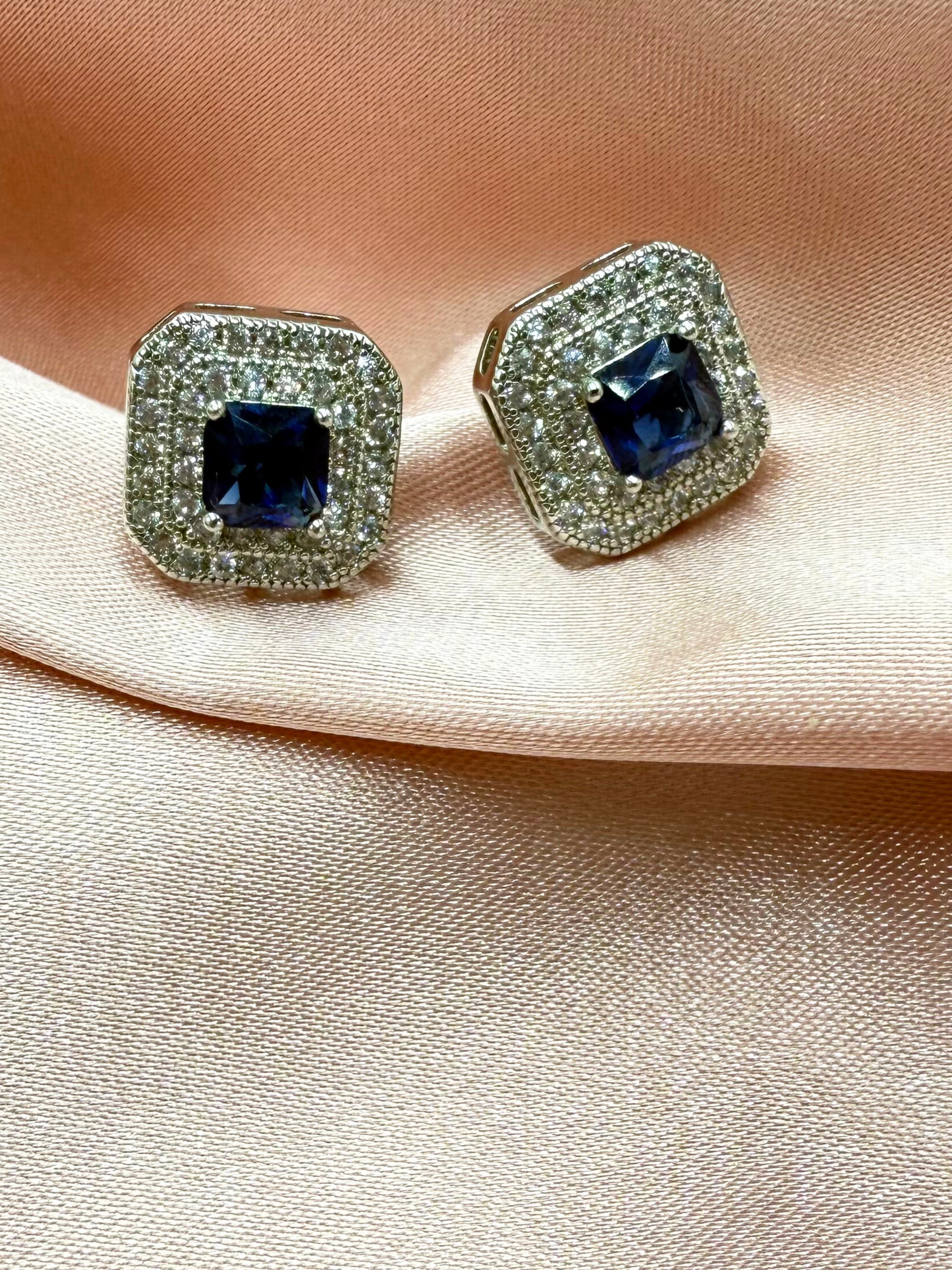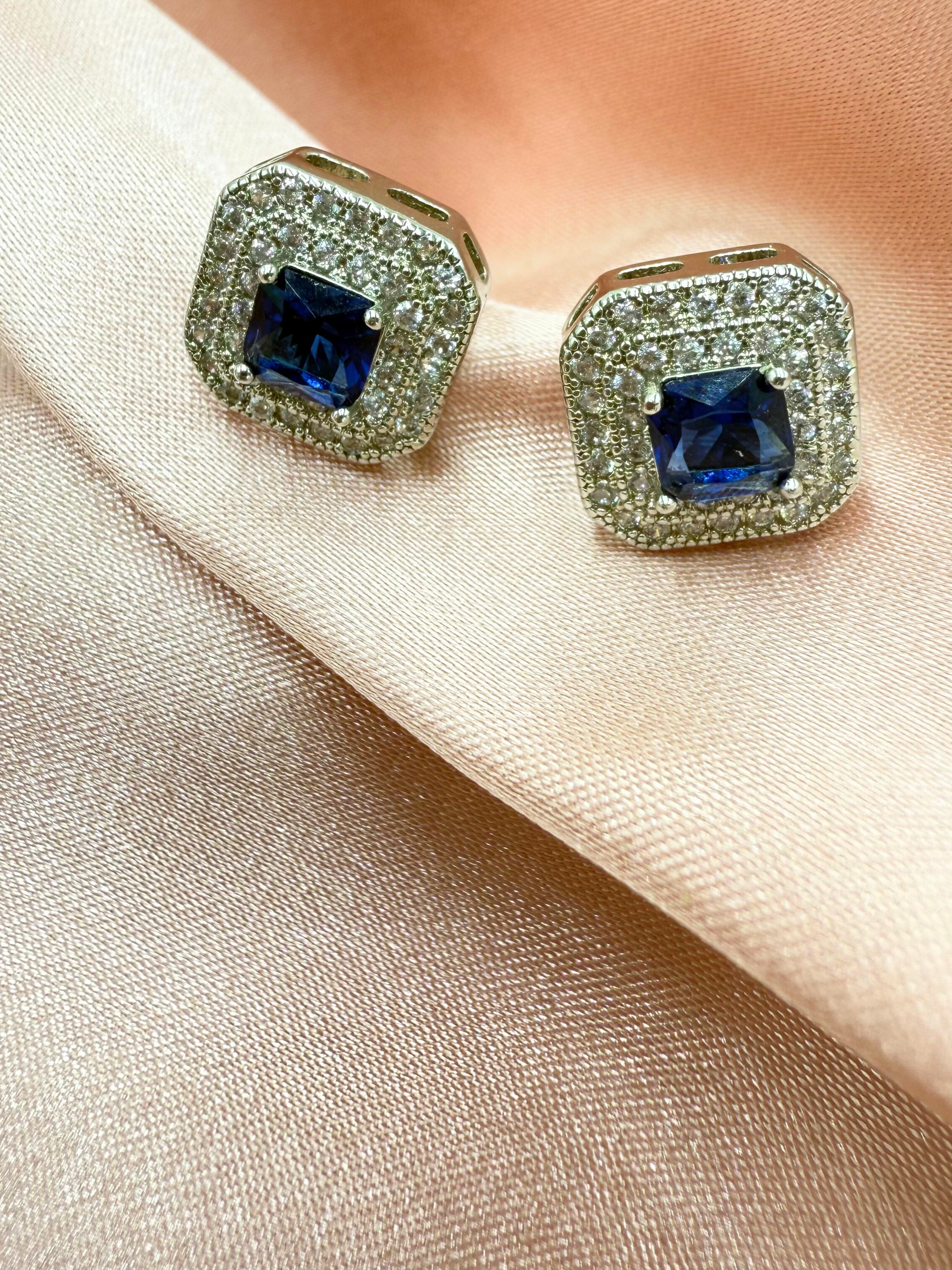 Aretes de metal en tono plateado con piedra cuadrada de imitación de zafiro