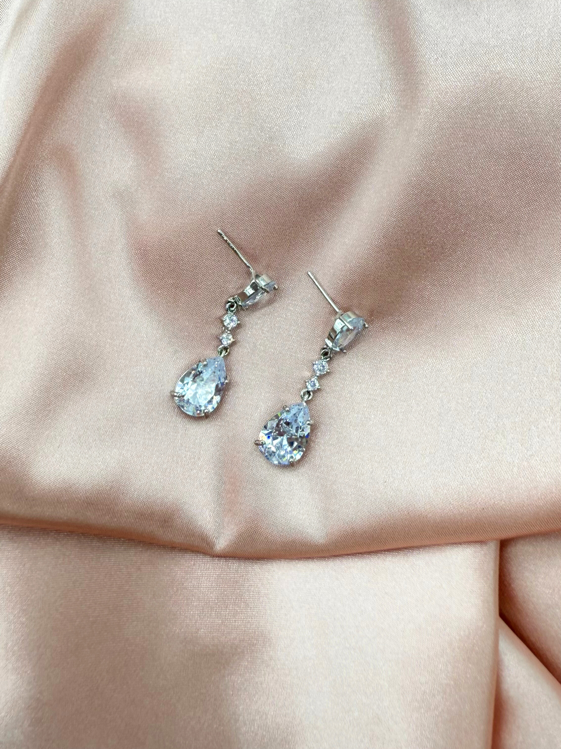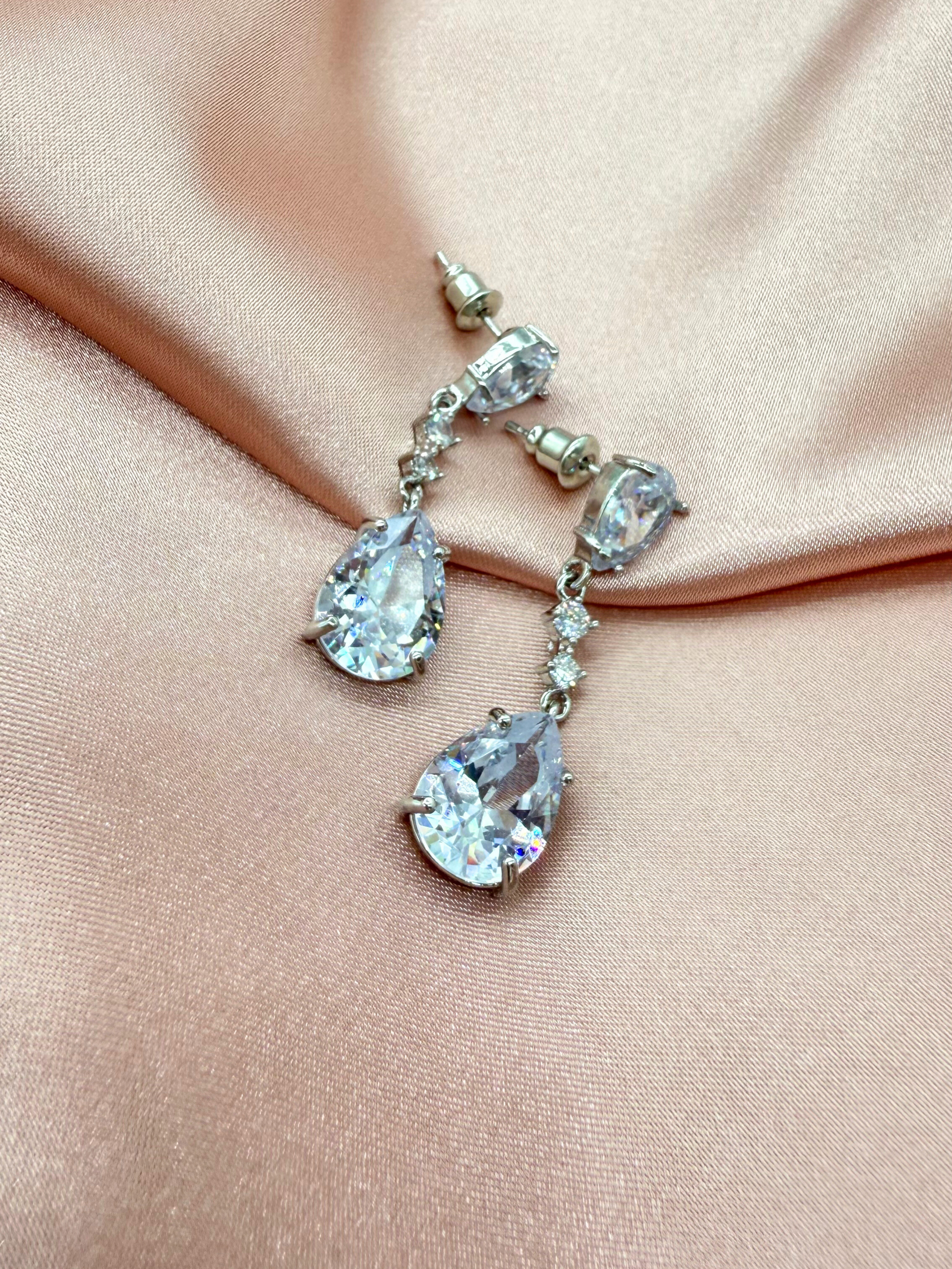 Aretes colgantes con doble circonia en forma de gota en tono plateado con chapa de rodio