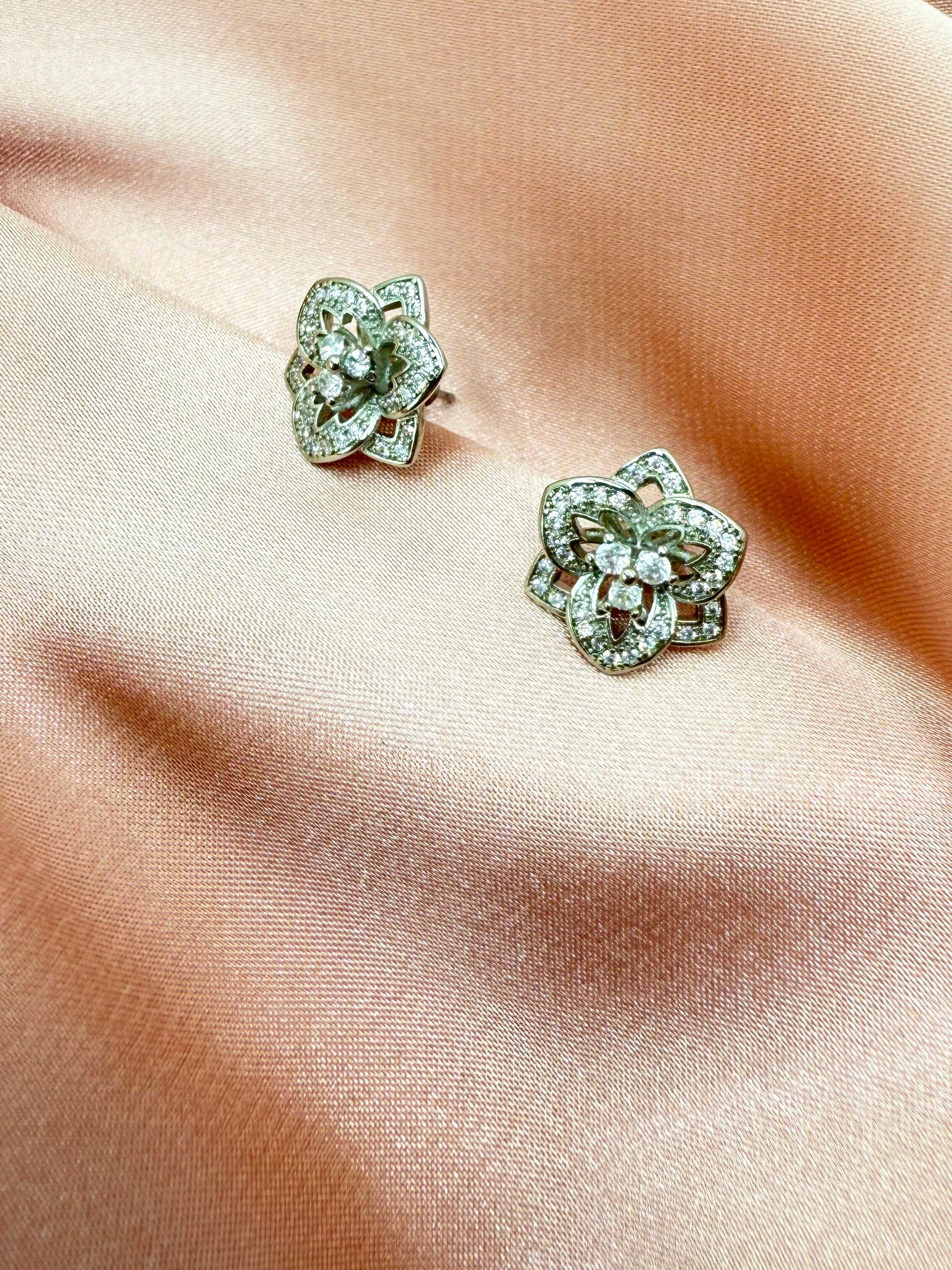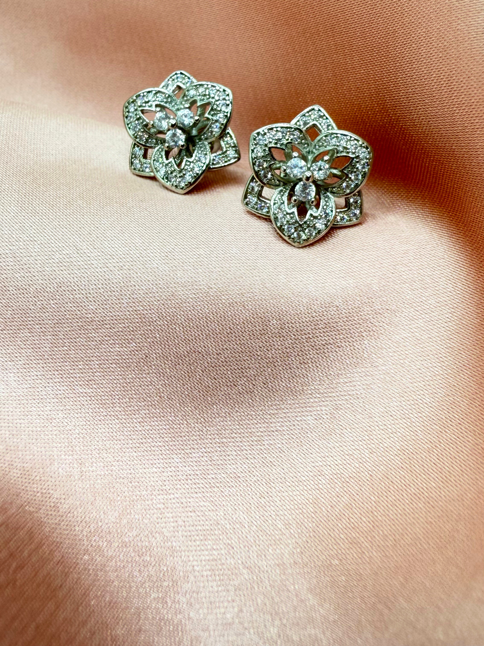 Aretes en forma de flor de metal en tono plateado