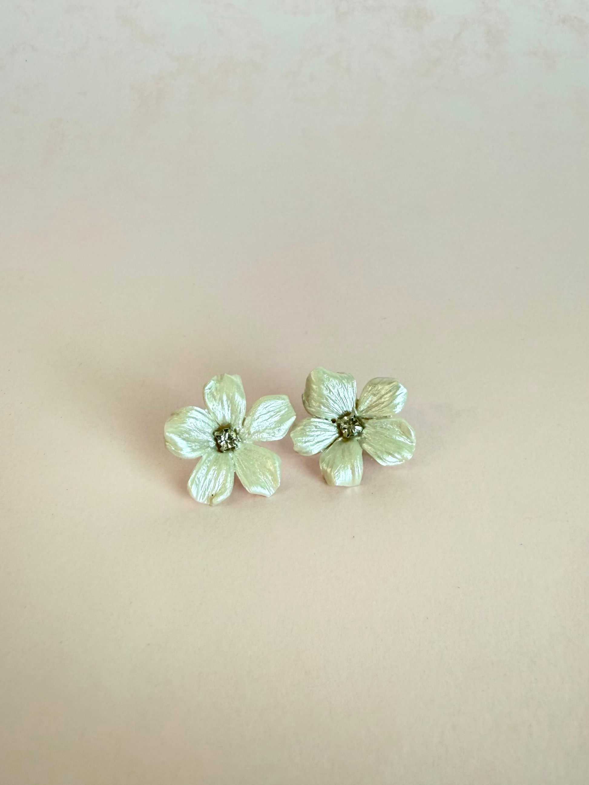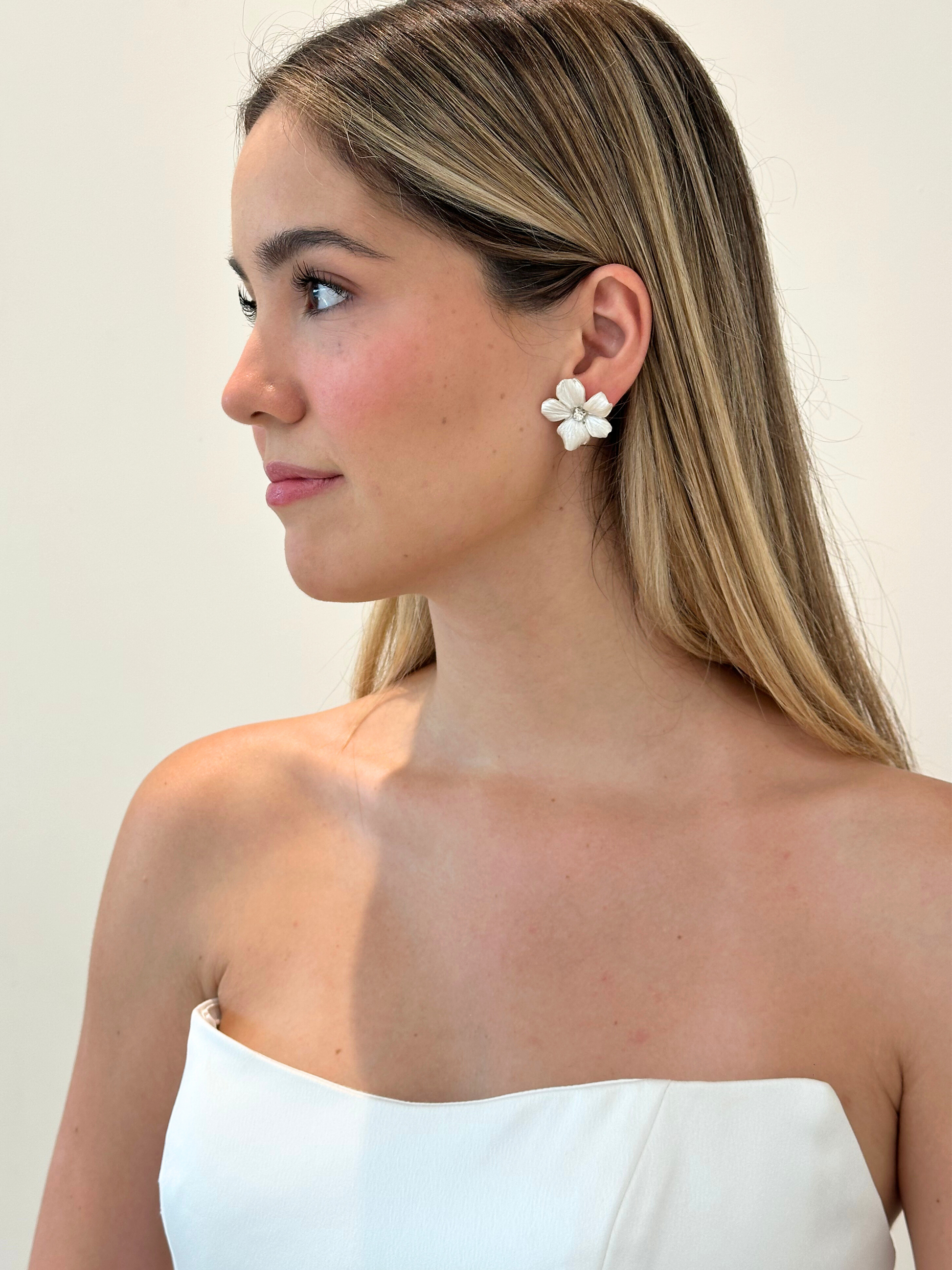Aretes de Pia Mori de porcelana en forma de flor con pedrería en el centro