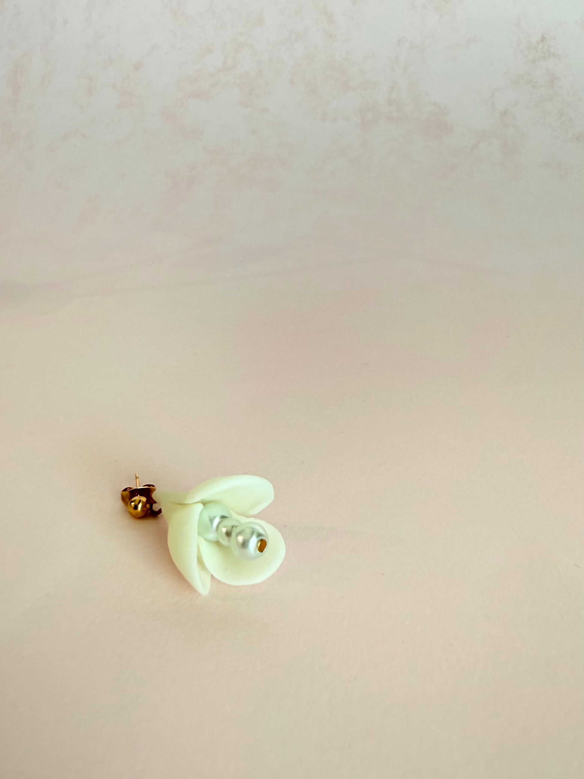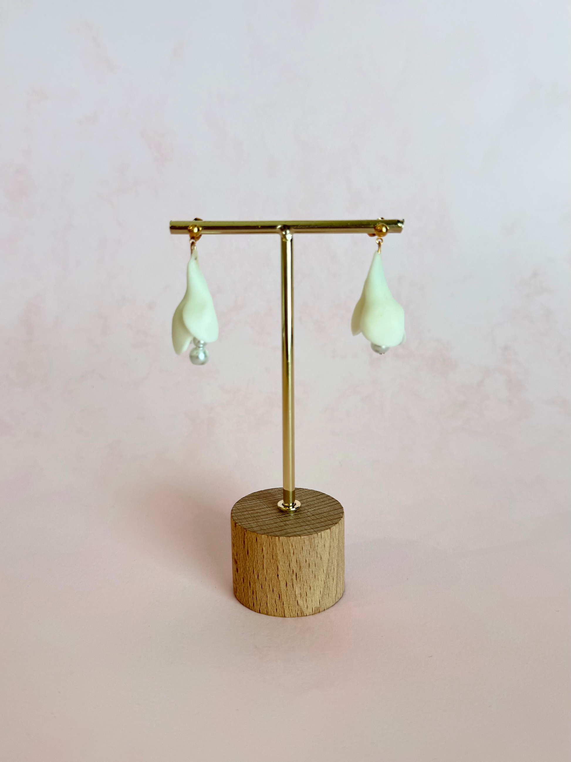 Aretes de porcelana tono ivory con perlas colgantes en el centro