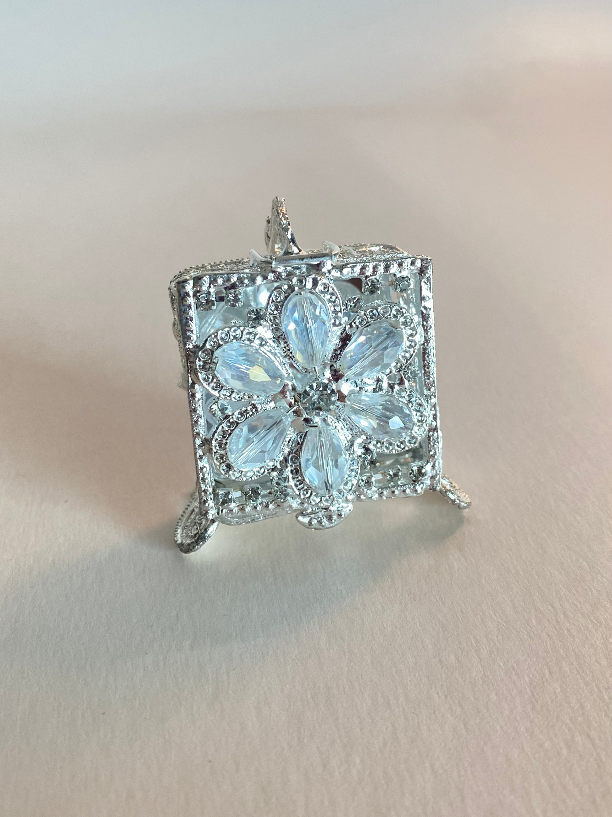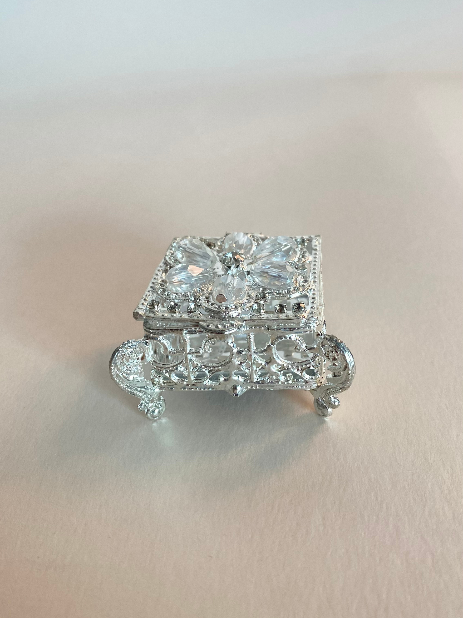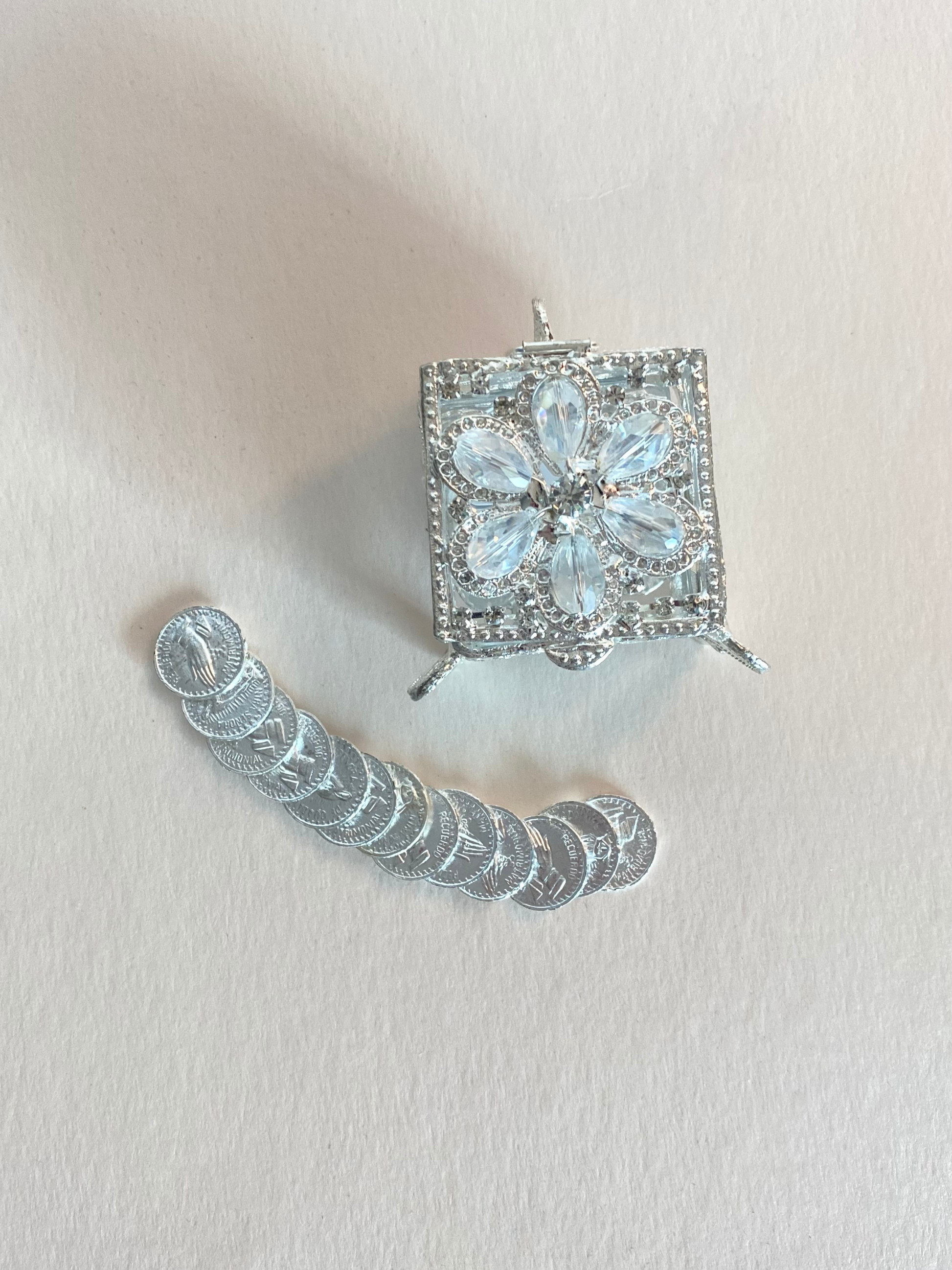 Cofre y monedas de metal en tono plateado, con detalles de pedrería tornasol.