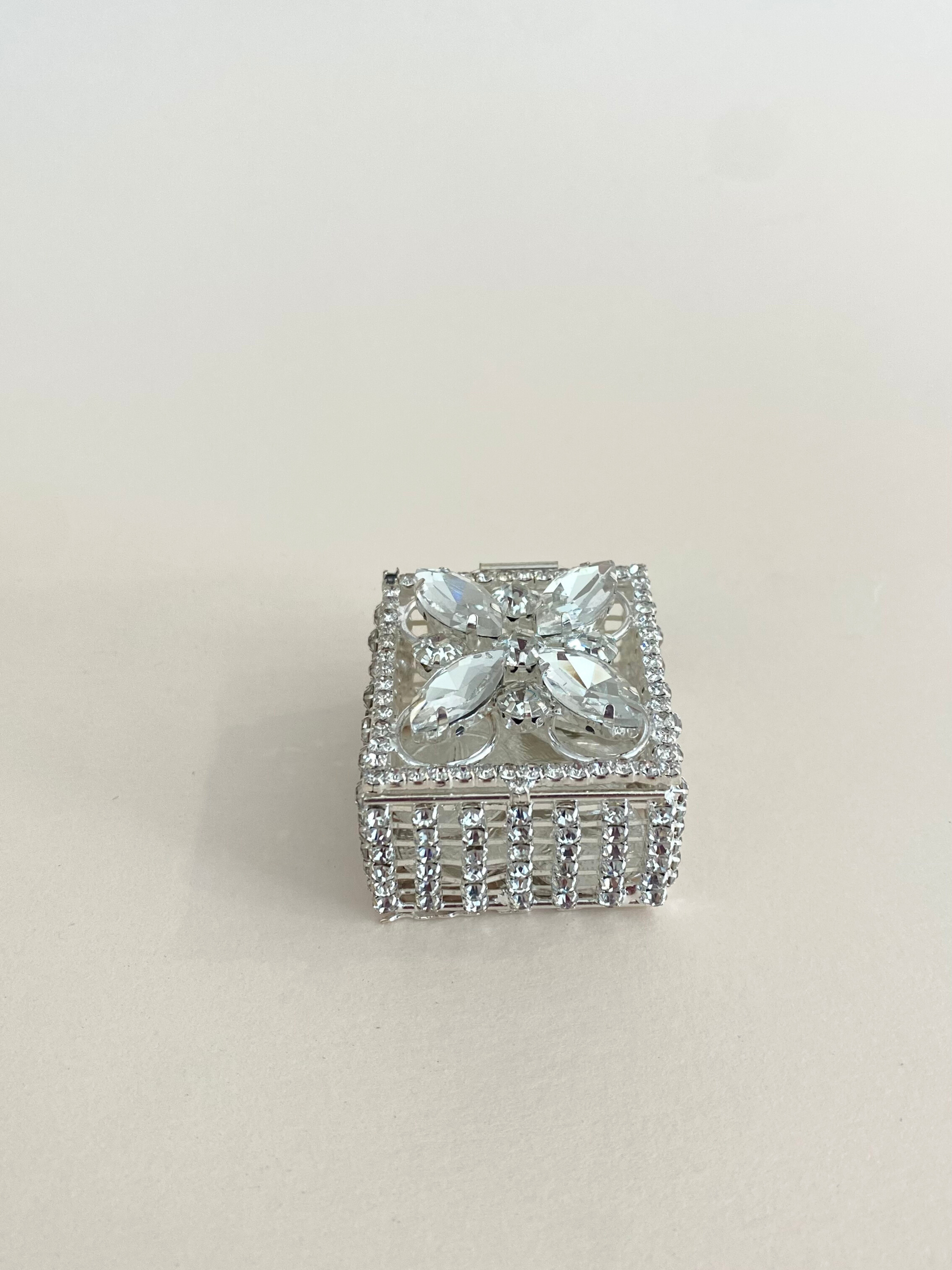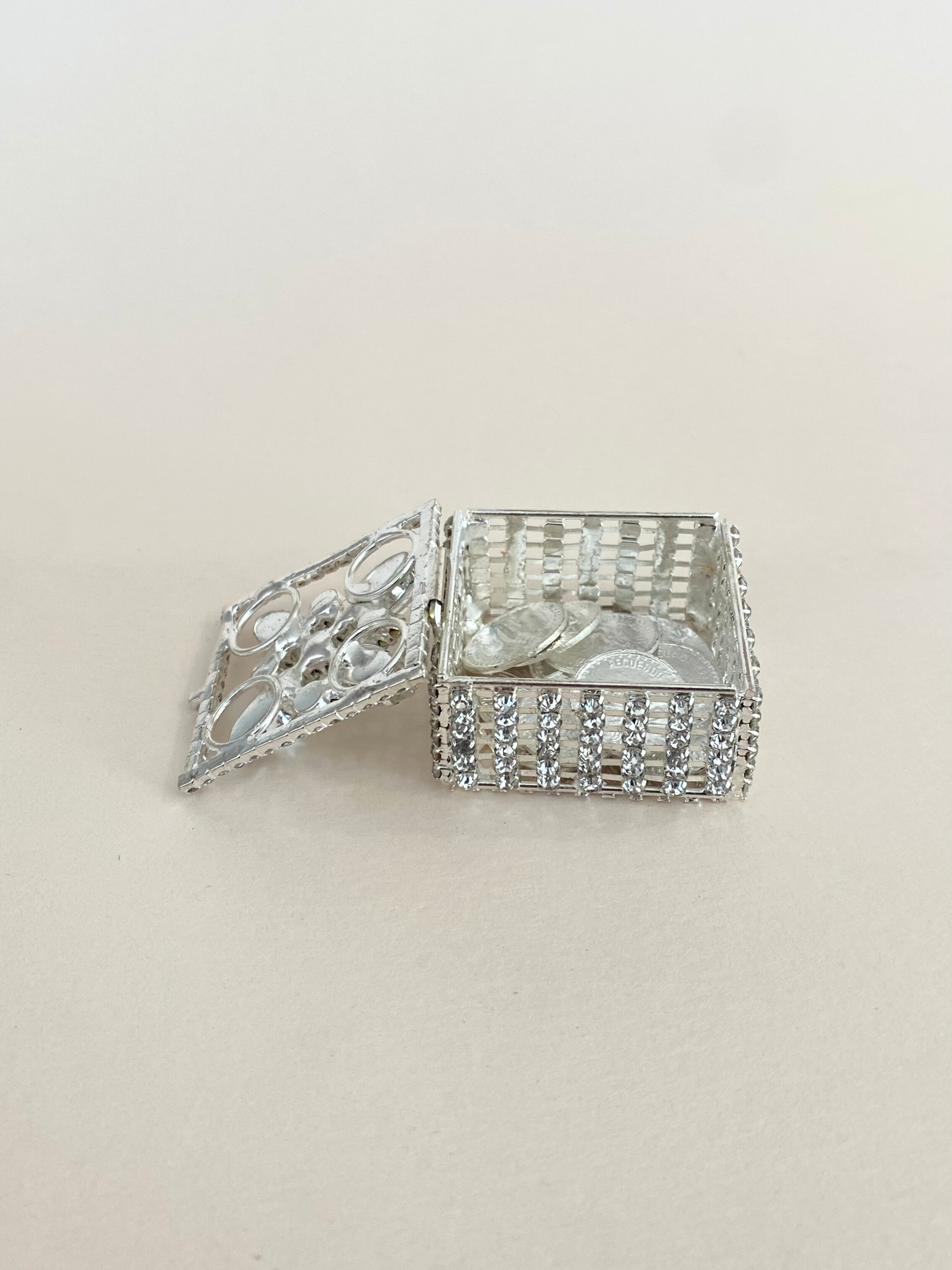 Caja de arras plateada con incrustaciones de pedrería, incluye 13 monedas