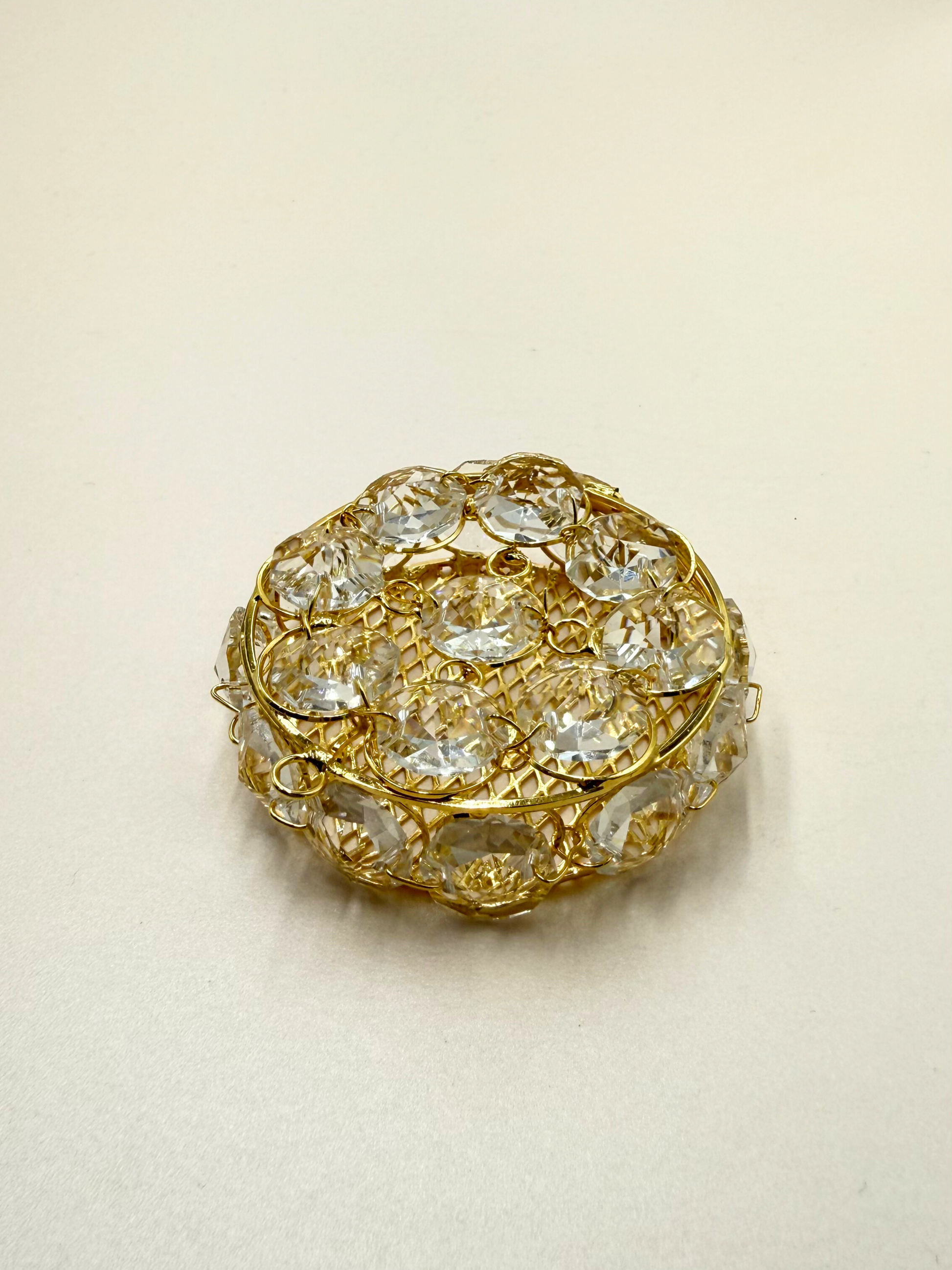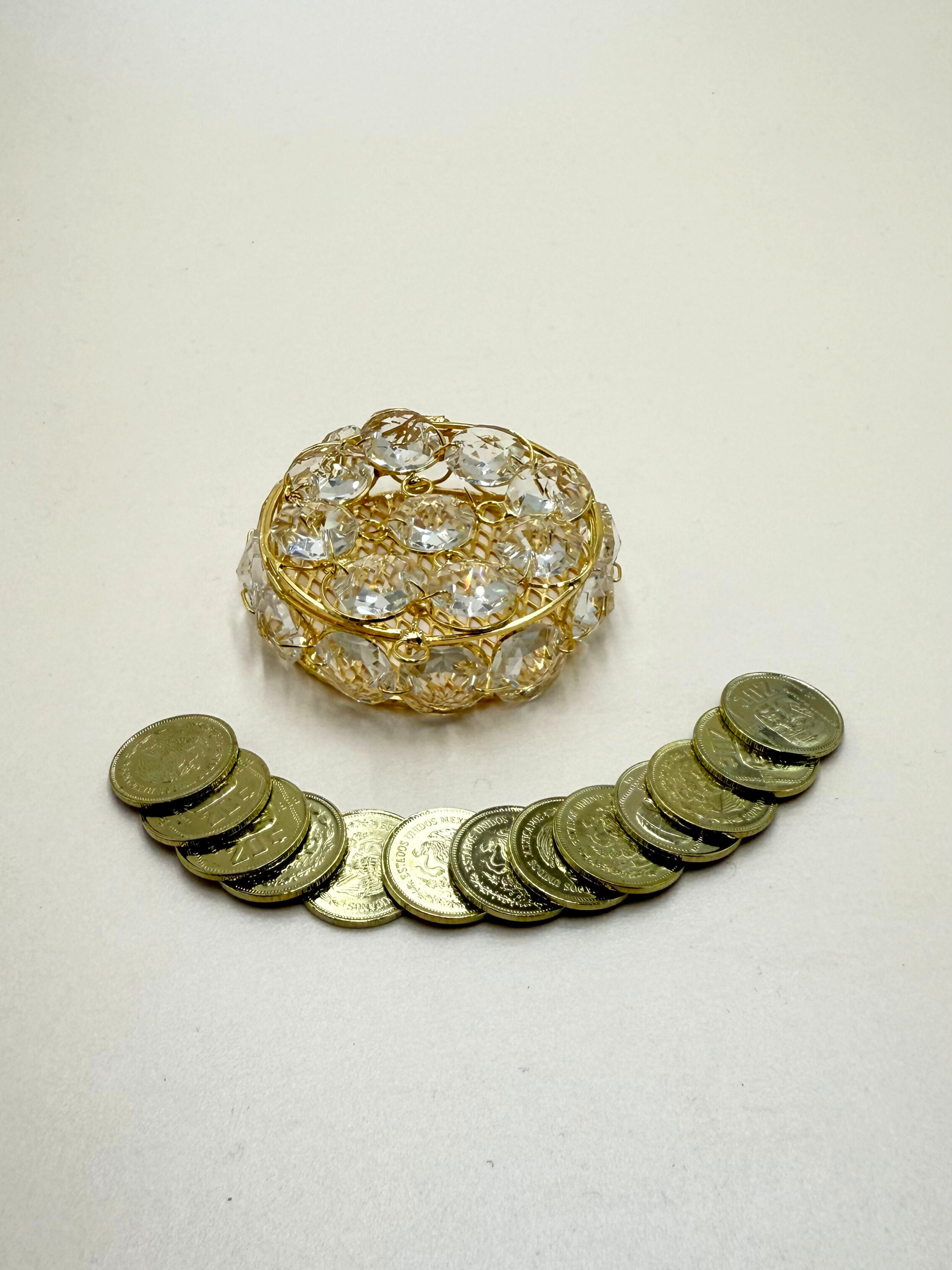 Cofre de metal en tono dorado con cristales transparentes y monedas