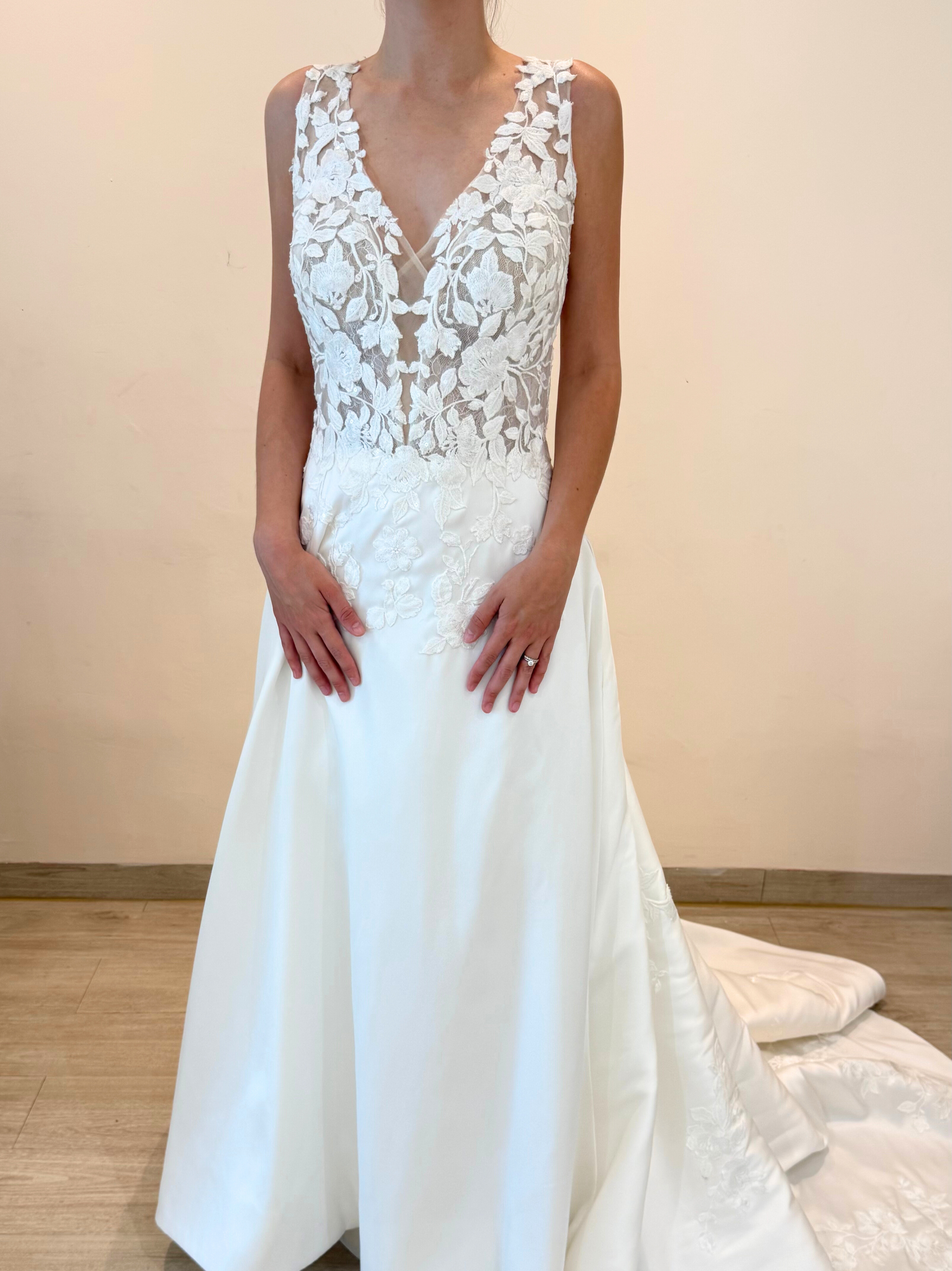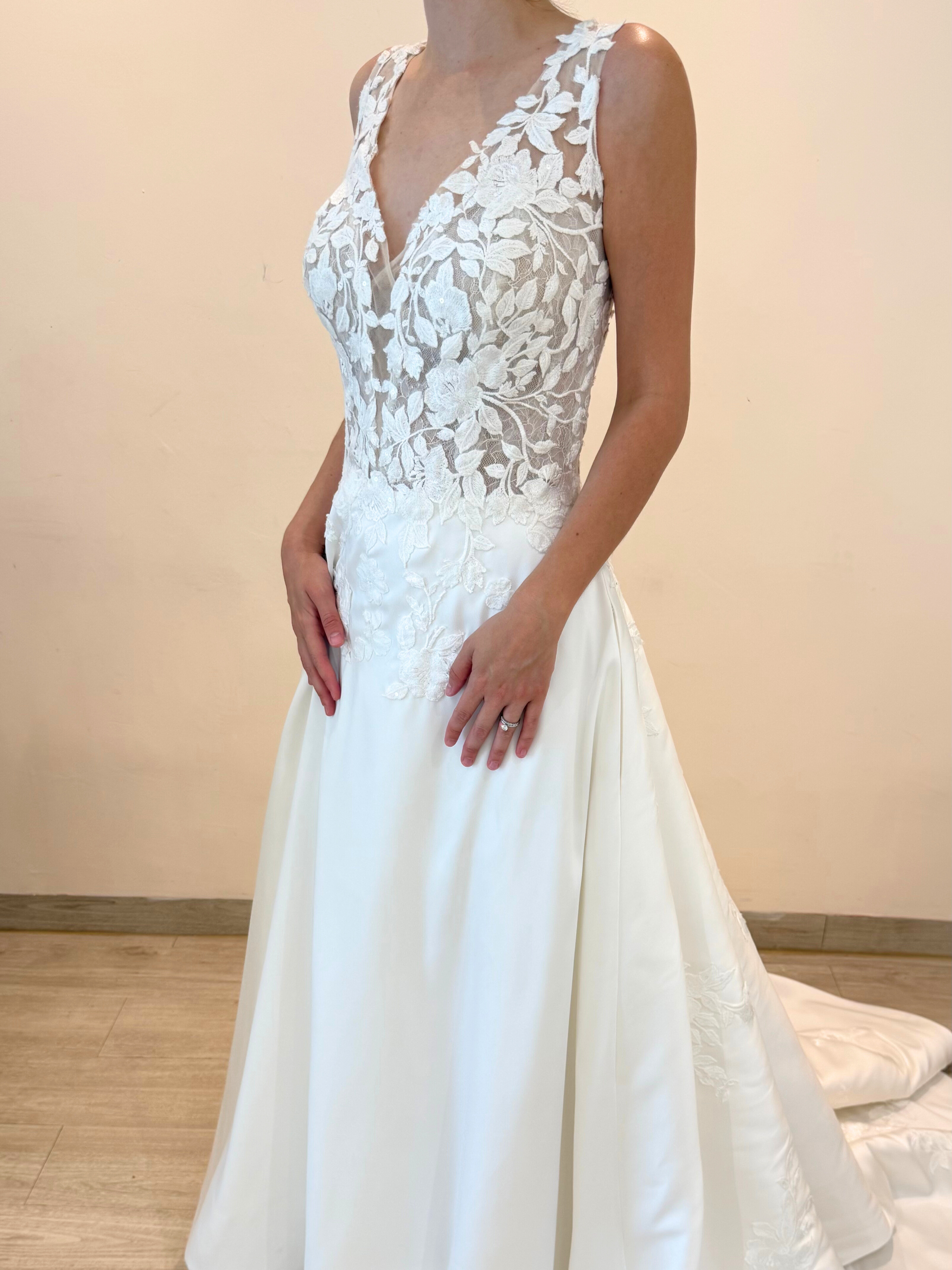 Vestido de novia semi nuevo línea A con aplicaciones florales en la parte superior