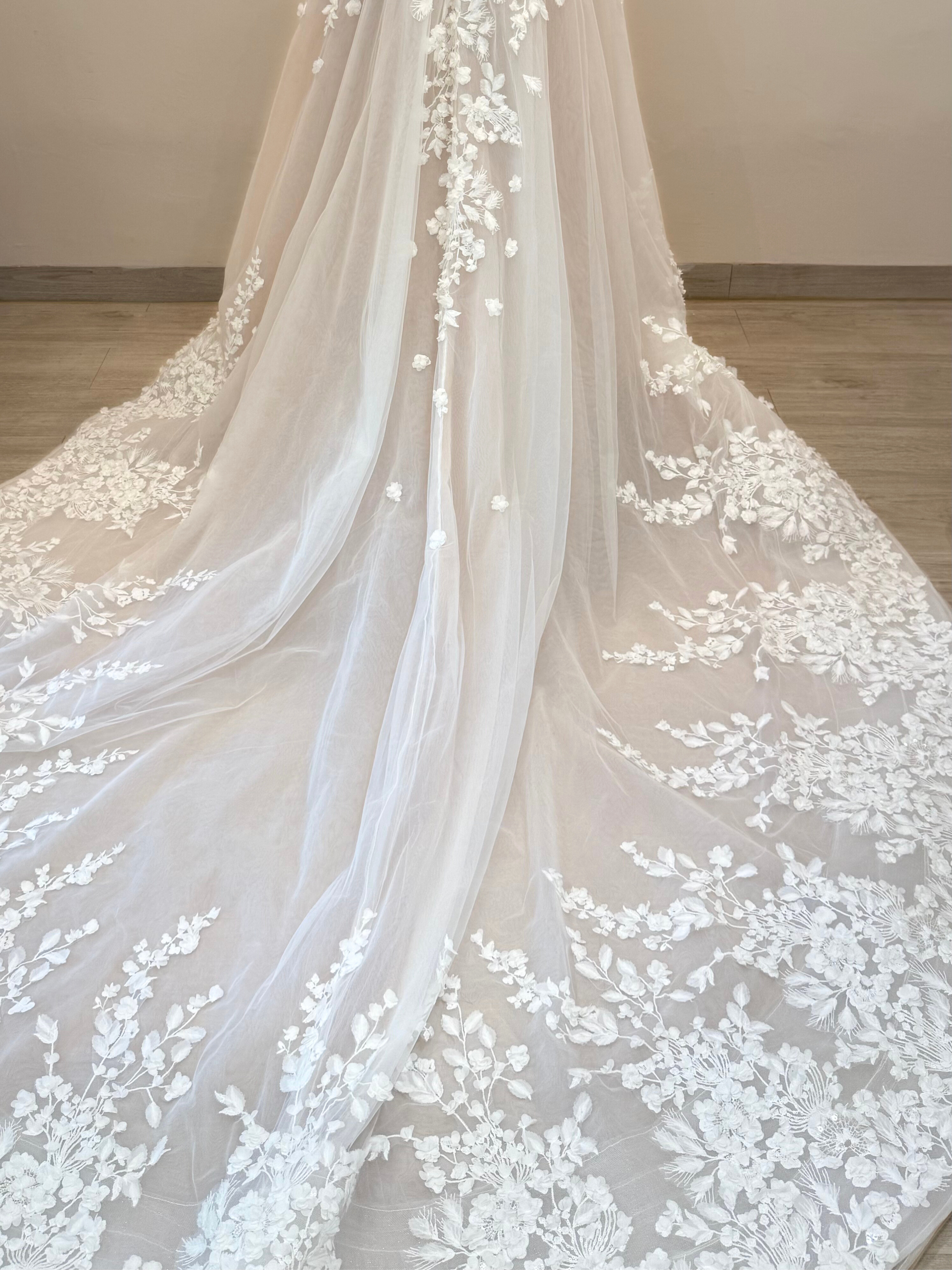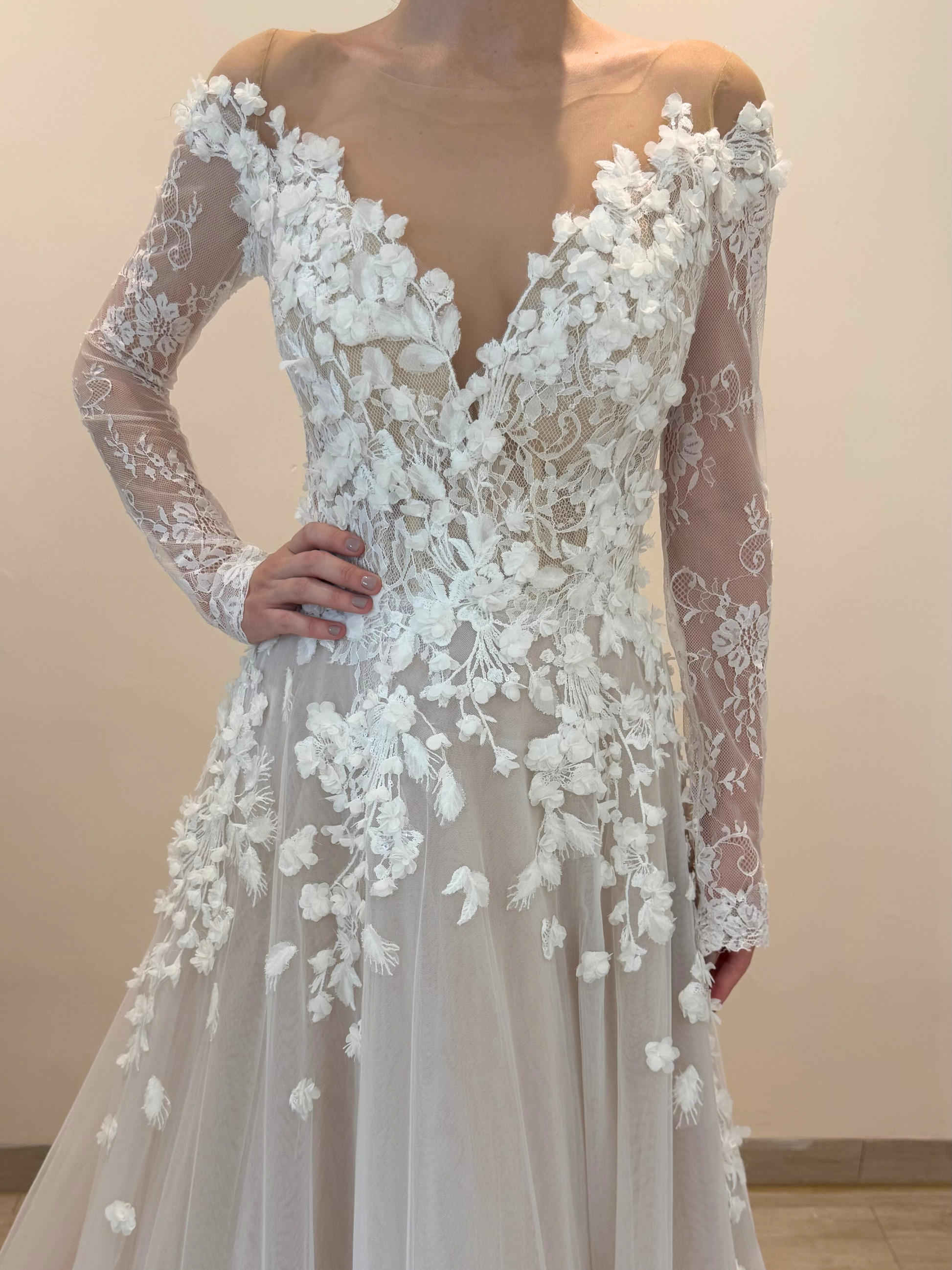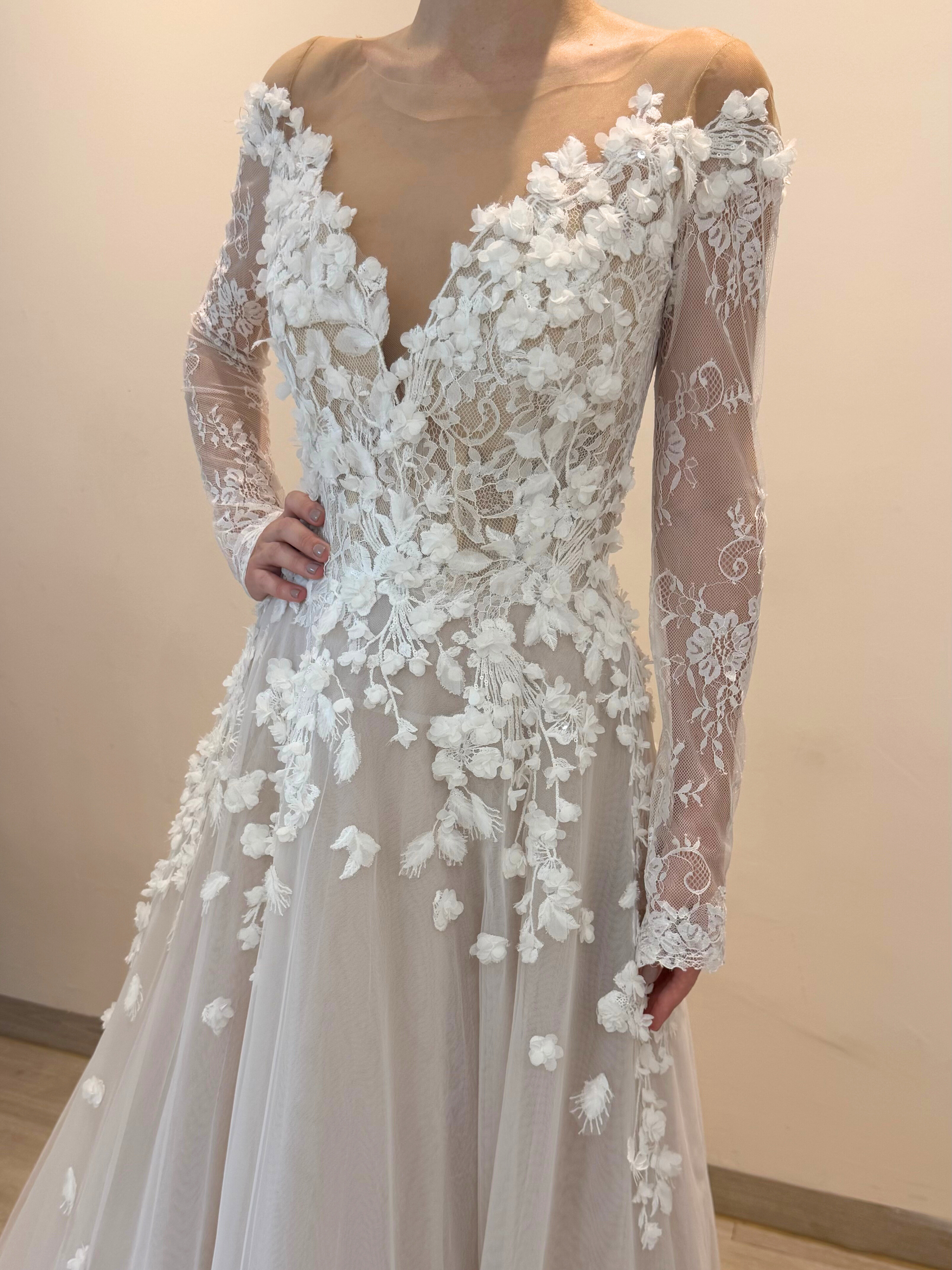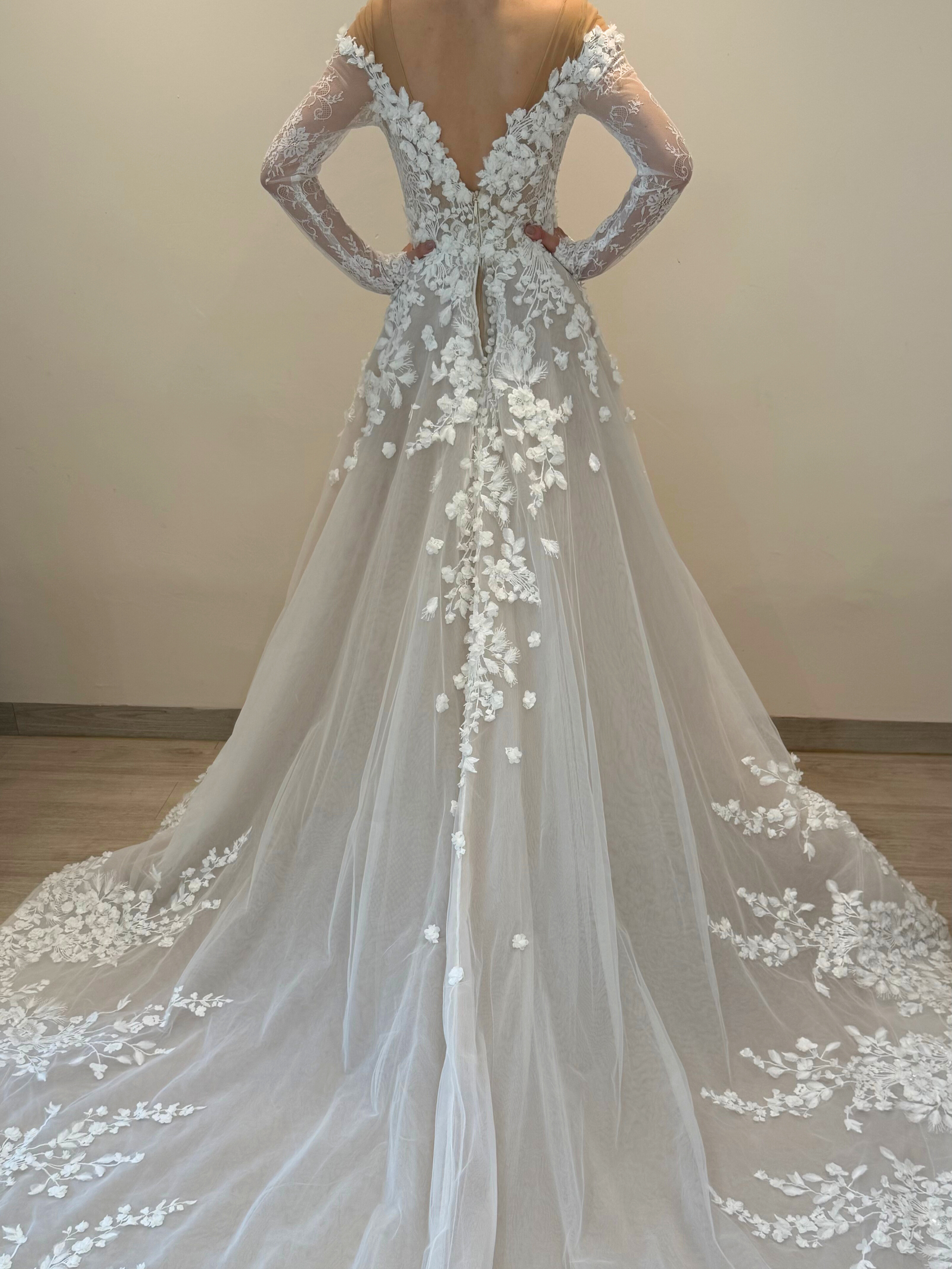 Vestido de novia nuevo con etiqueta de manga larga con aplicaciones 3D florales