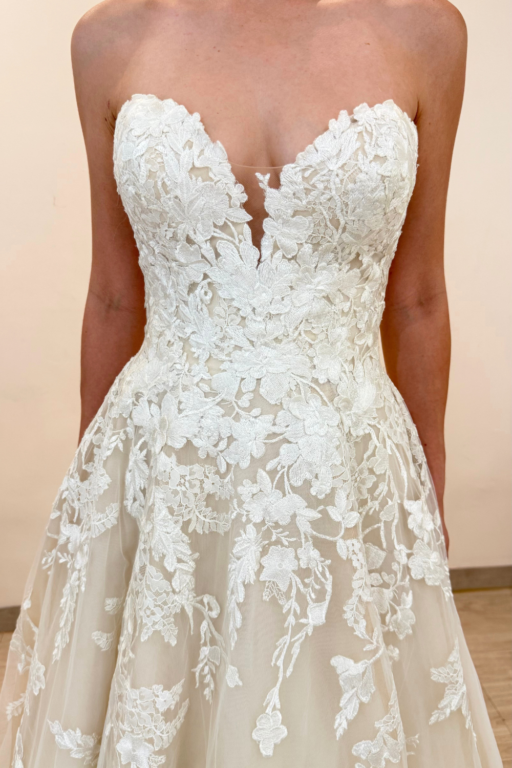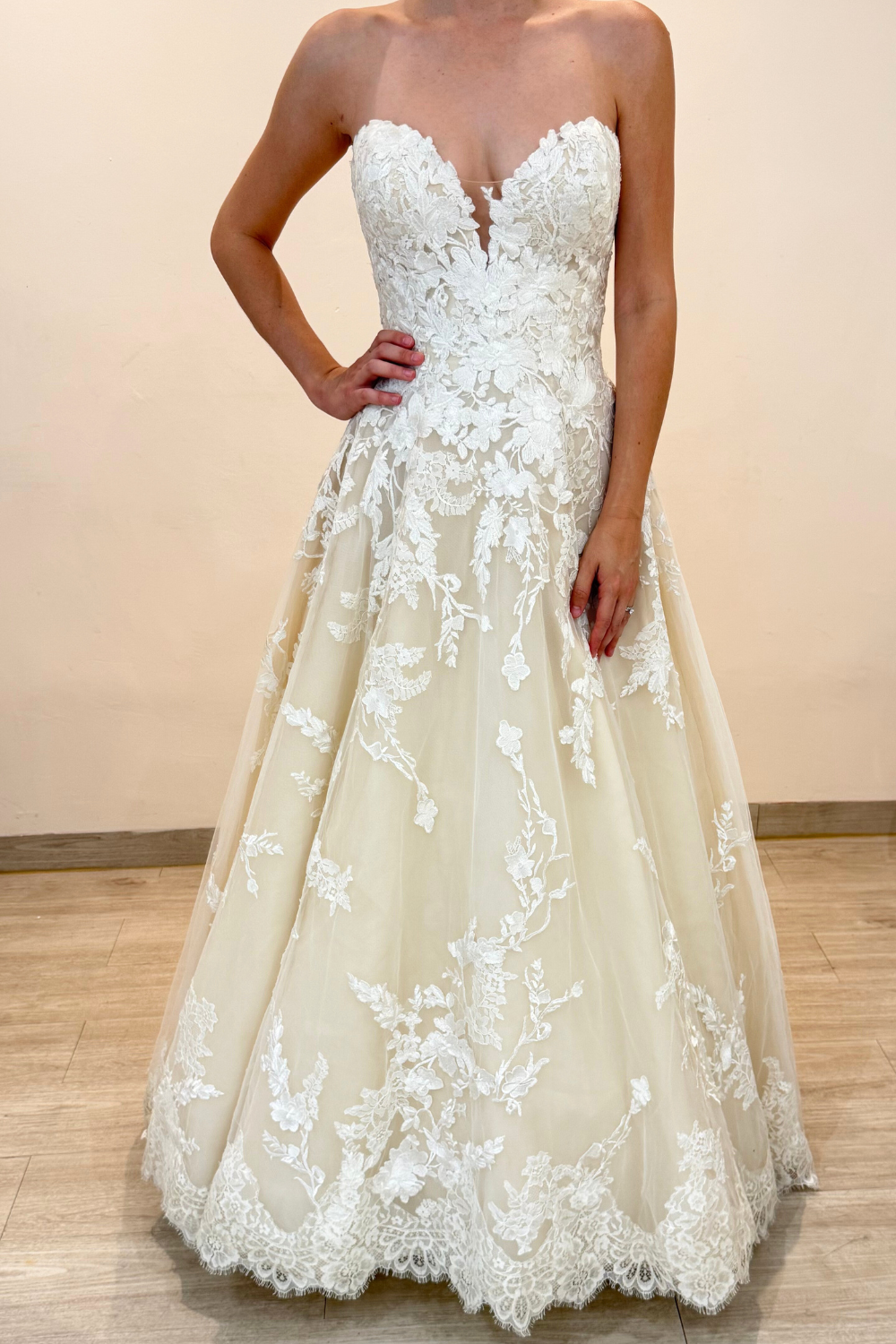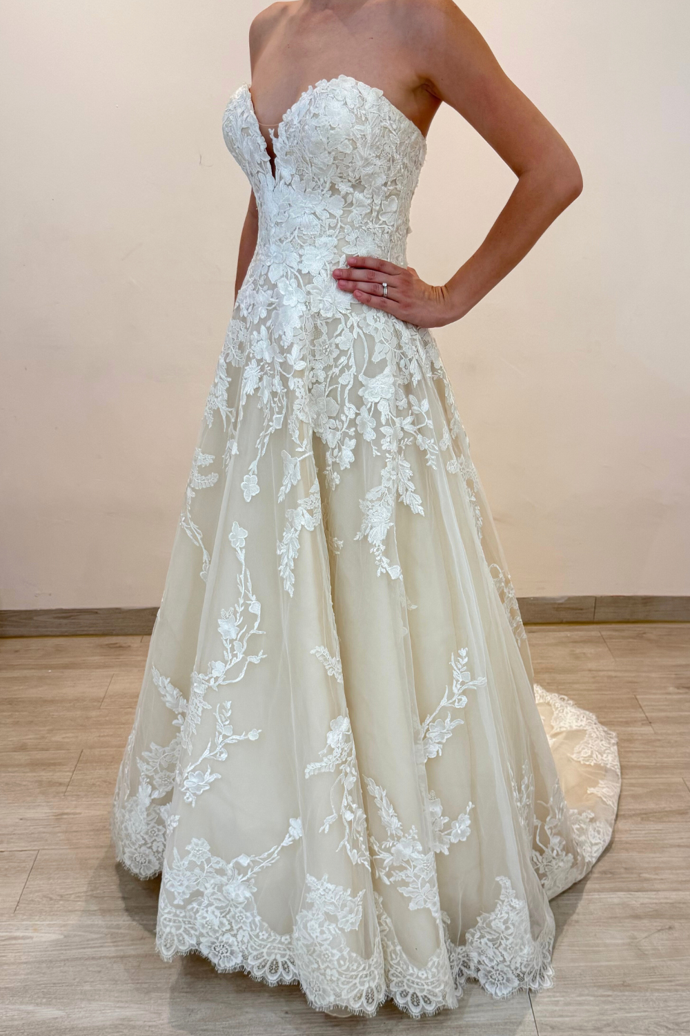 Vestido de novia seminuevo strapless de escote corazón con encaje chantilly francés y aplicaciones florales