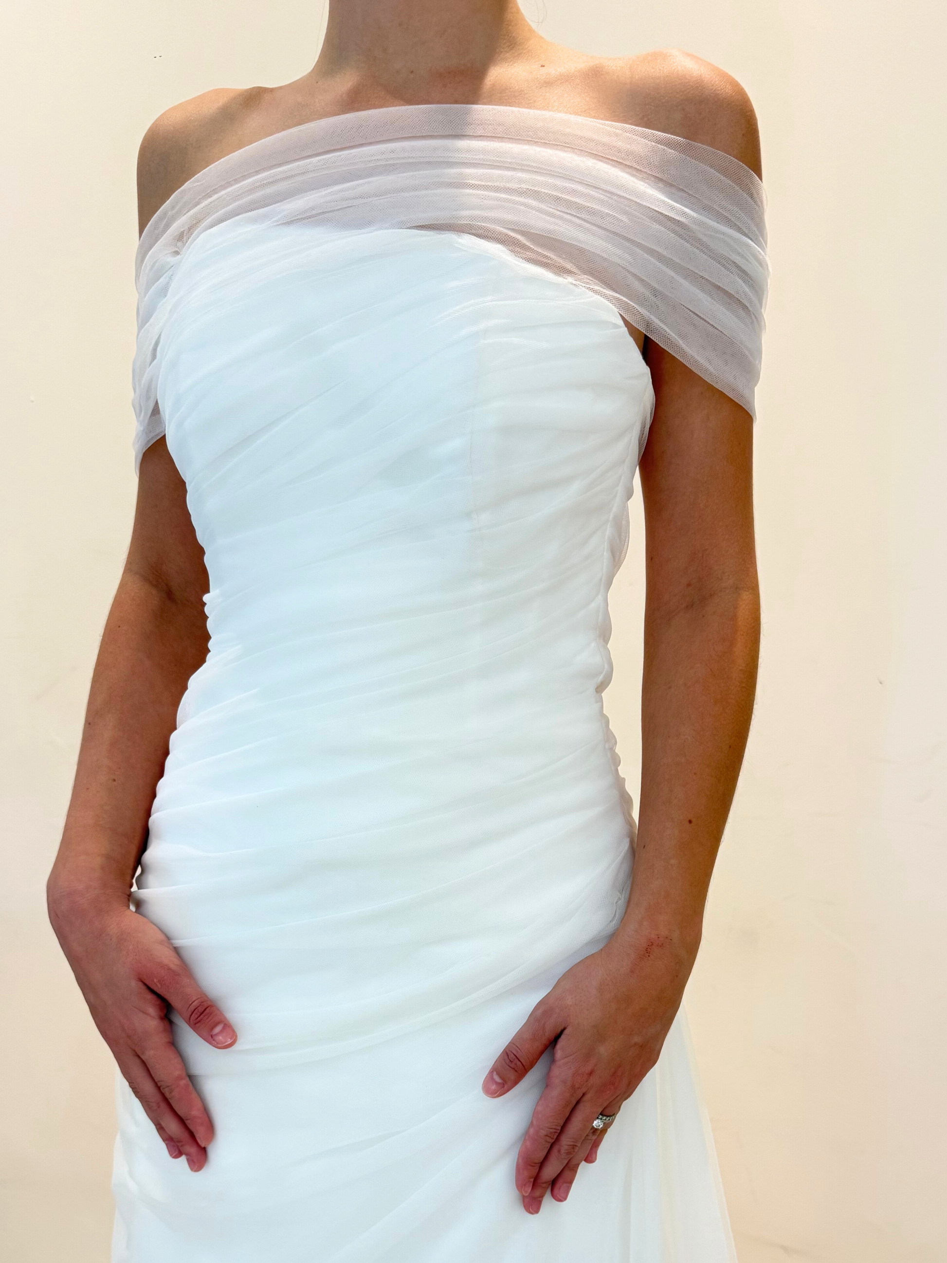 Vestido de novia strapless, corte cadera, con drapeado de tul