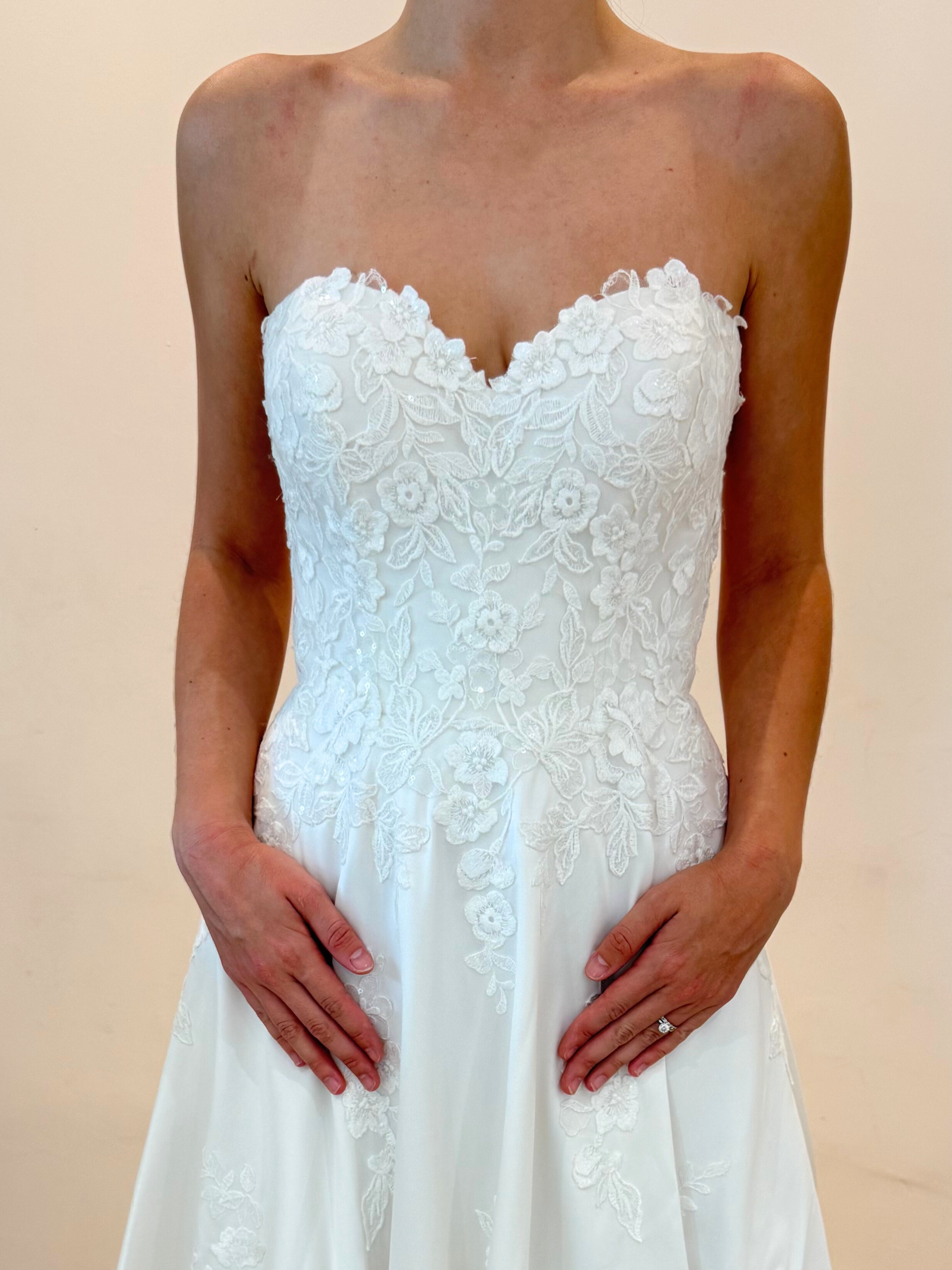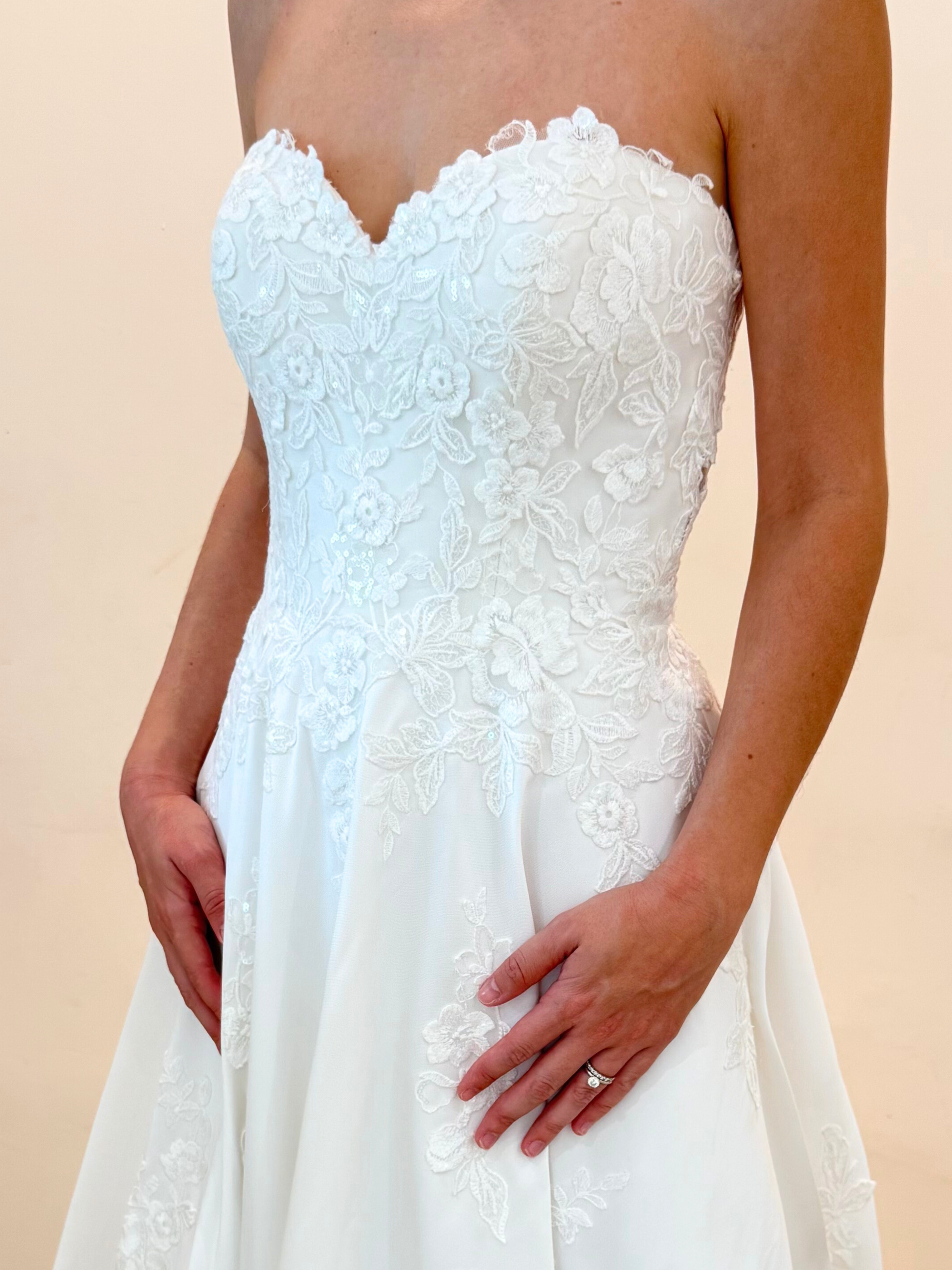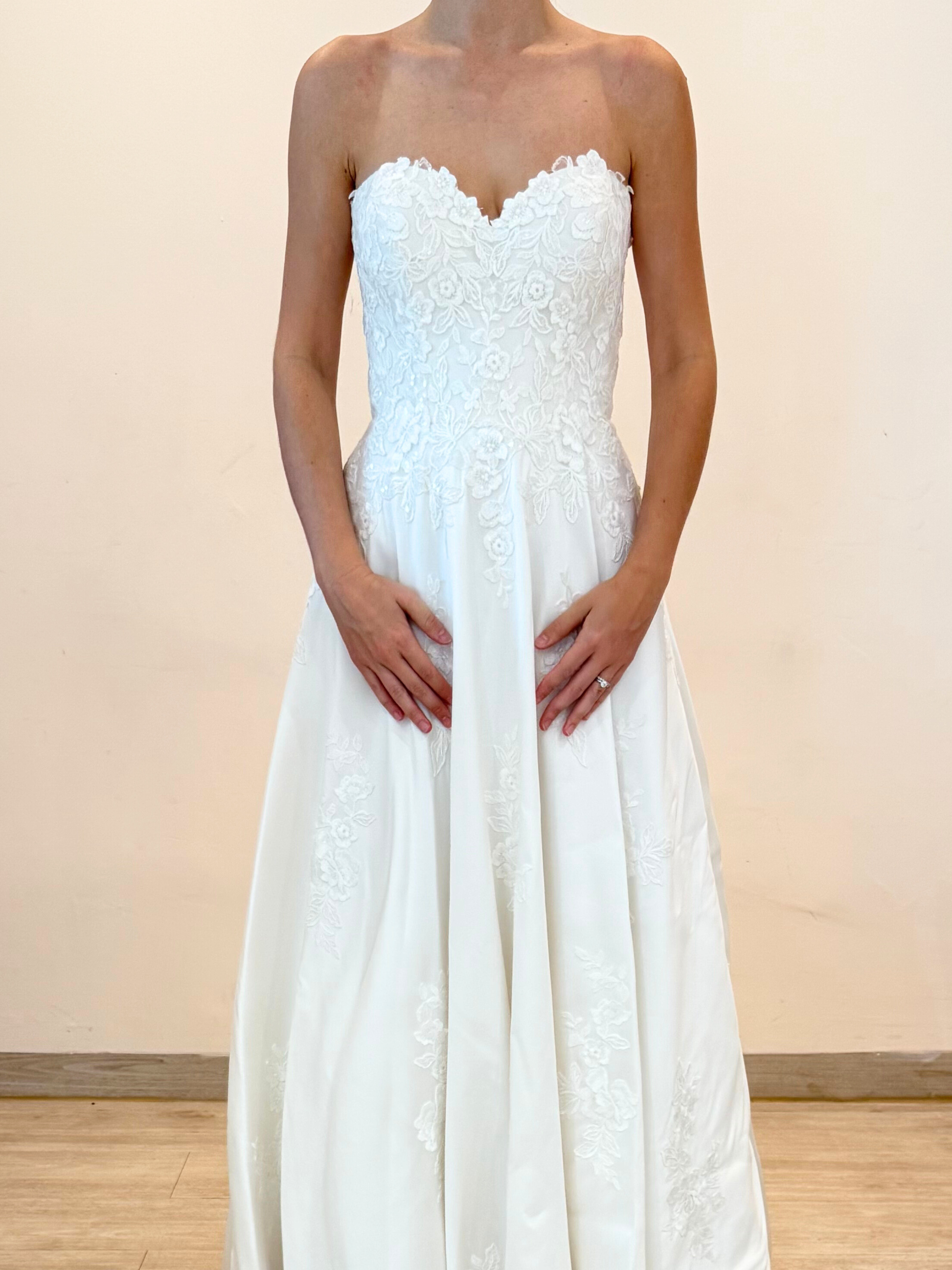 Vestido de novia semi nuevo, strapless, línea A, de mikado con bordado floral