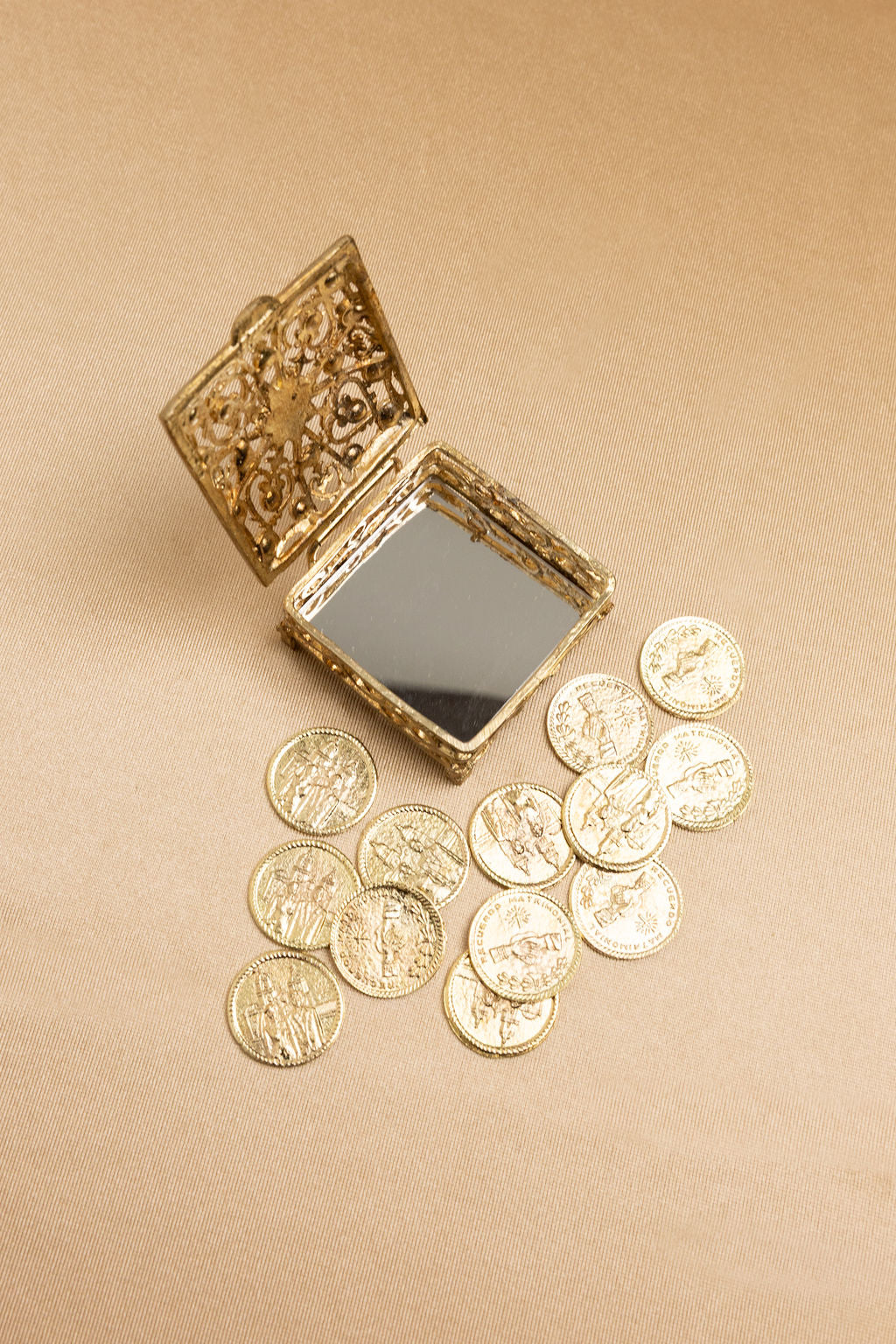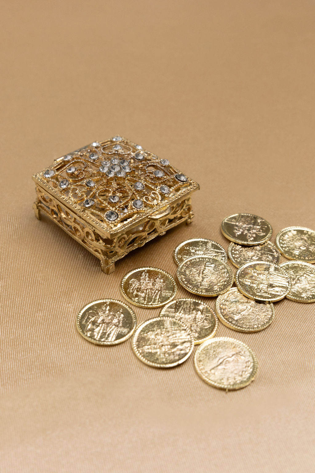 Cofre metal con pedrería y 13 monedas