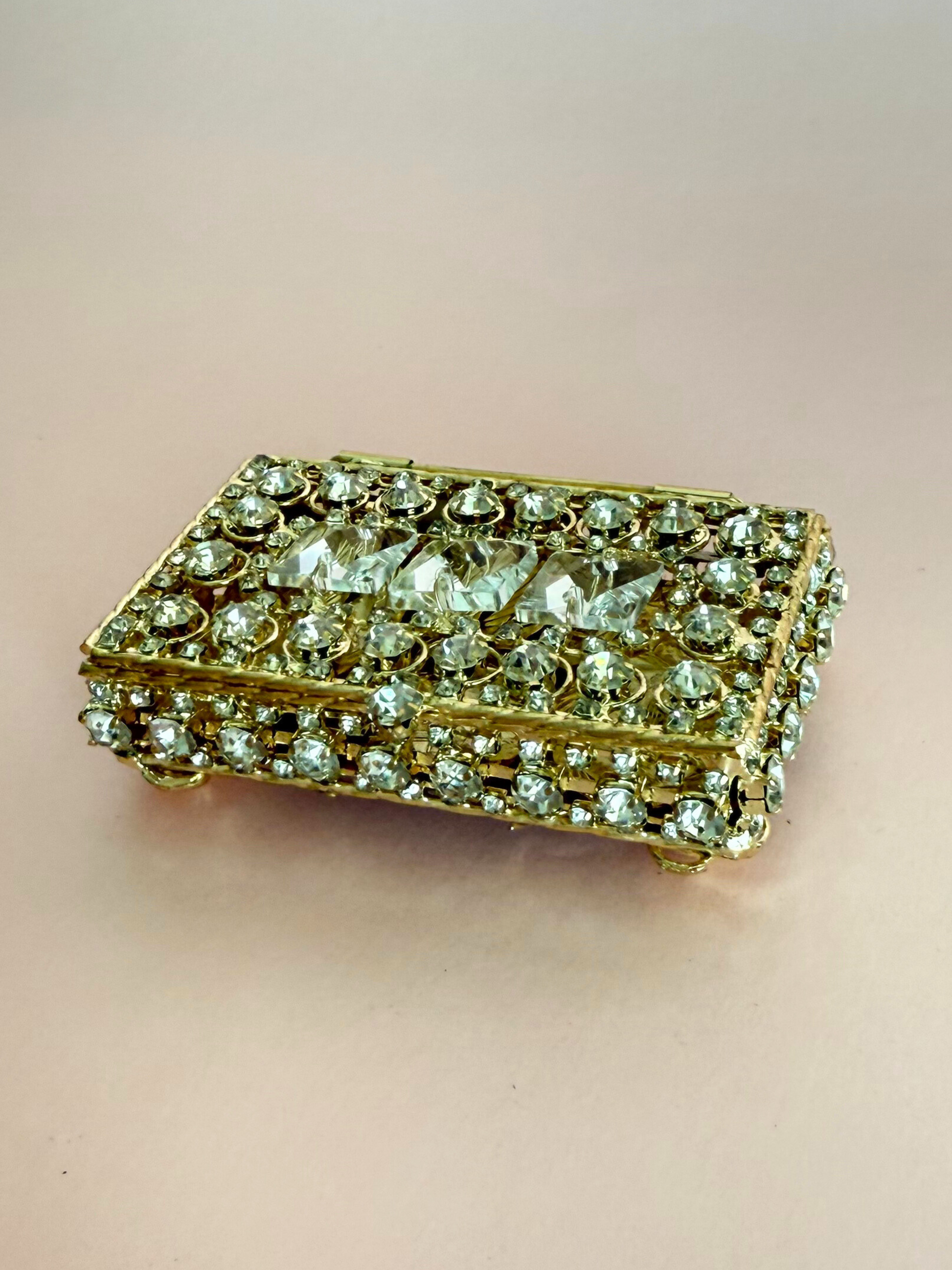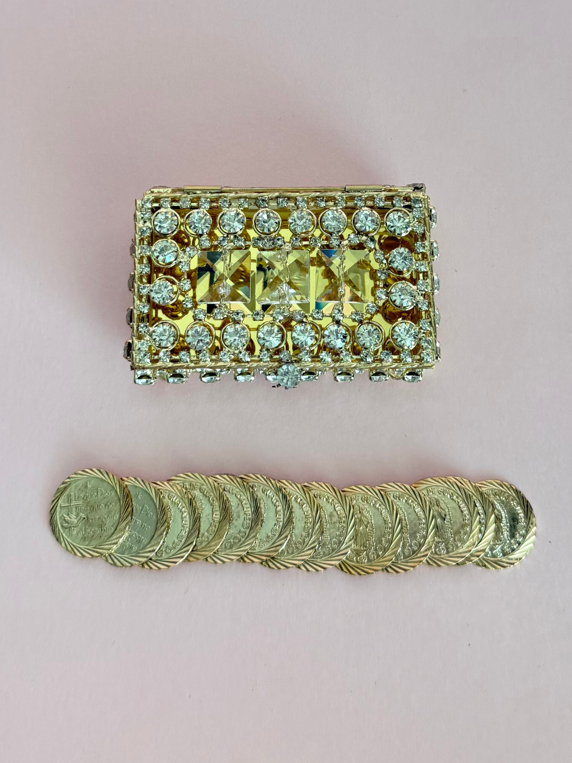 Cofre de metal en tono dorado con aplicaciones de pedrería y 13 monedas de metal