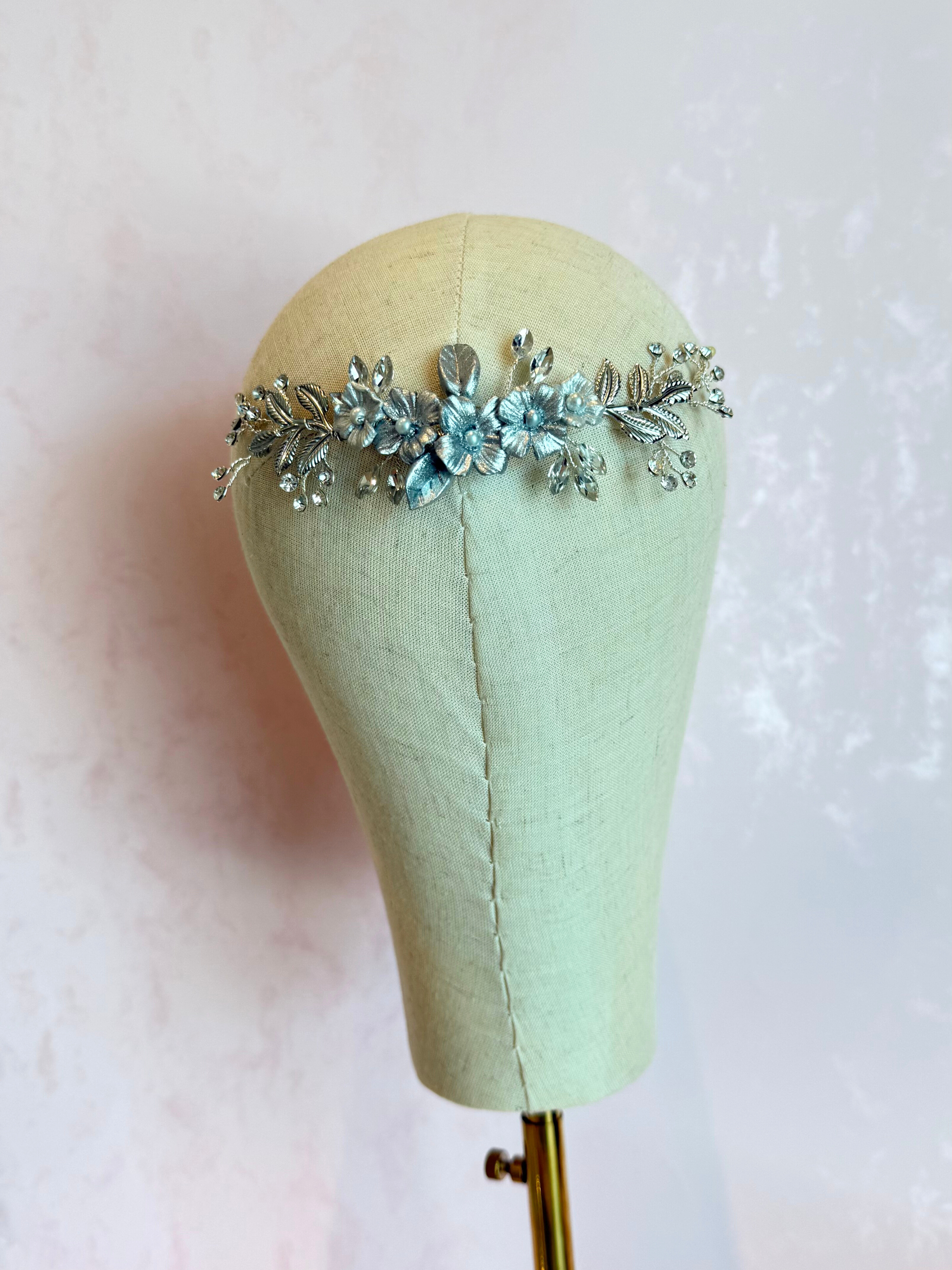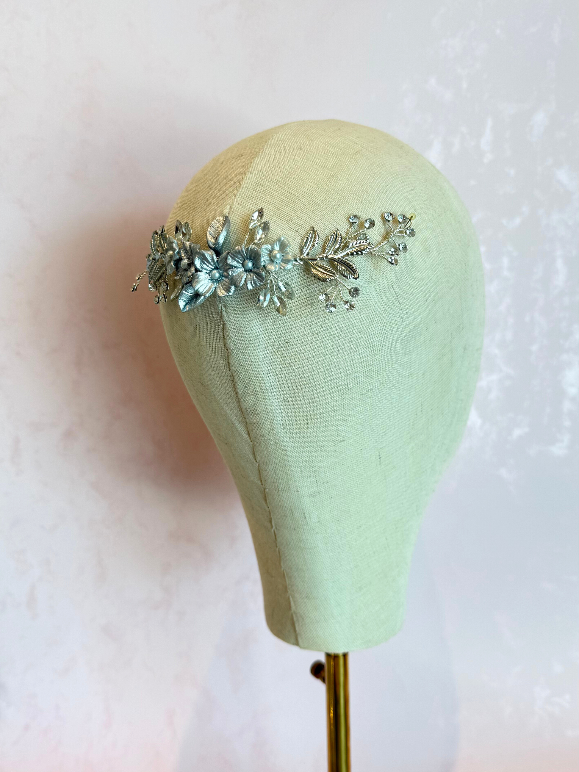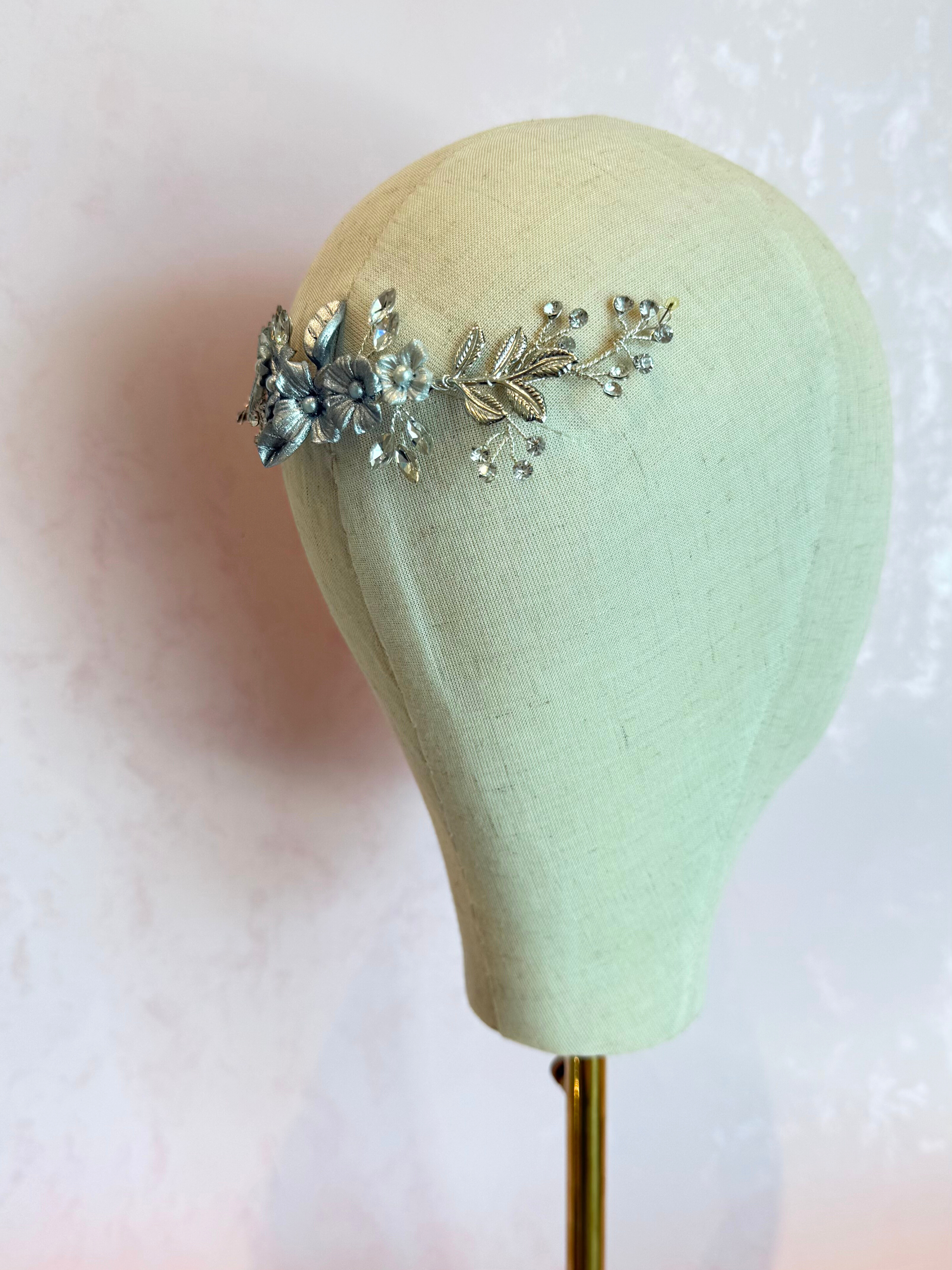 Guía flexible de alambre de metal tono plateado con flores de pasta entintadas en color plata y cristales