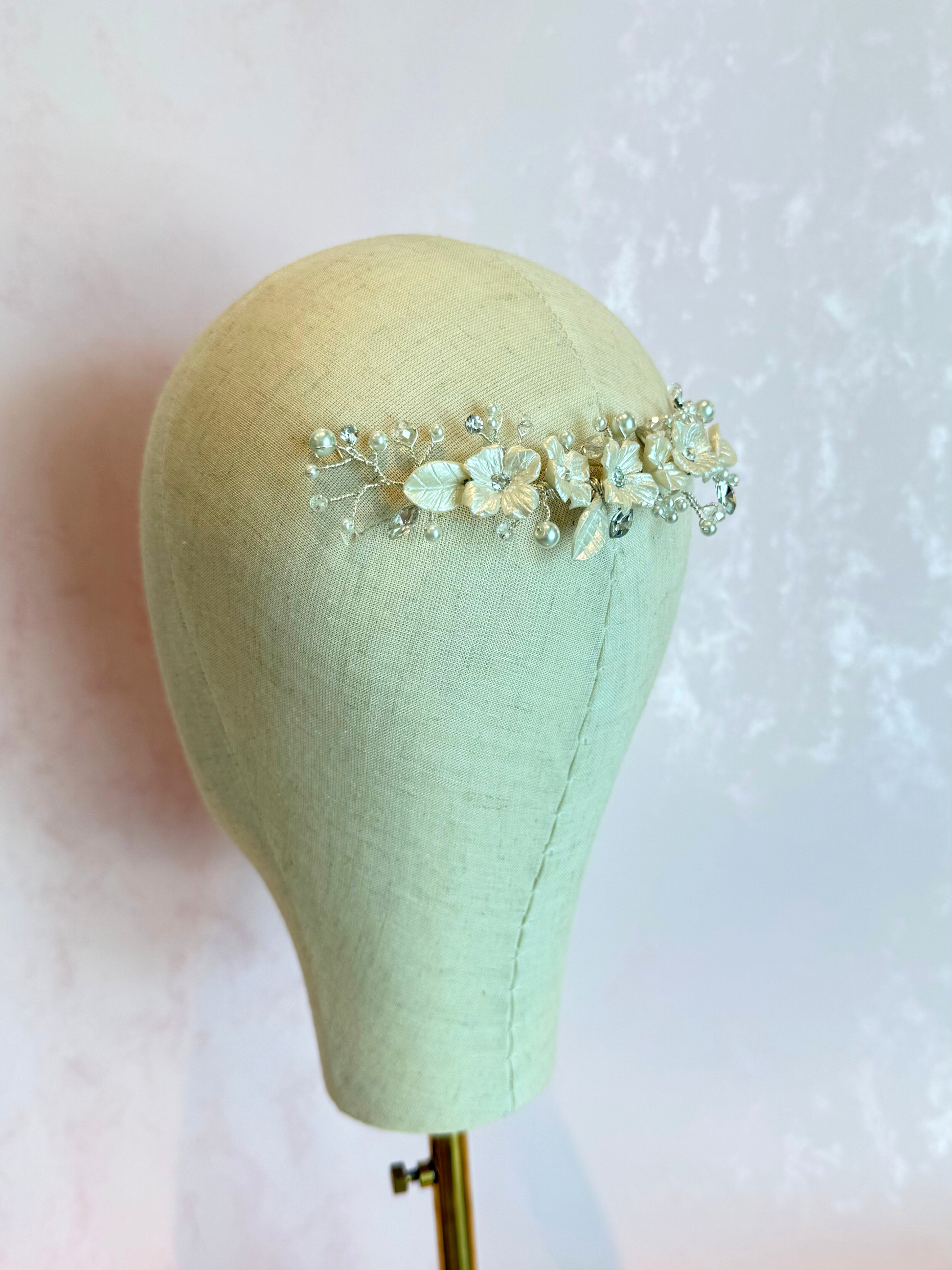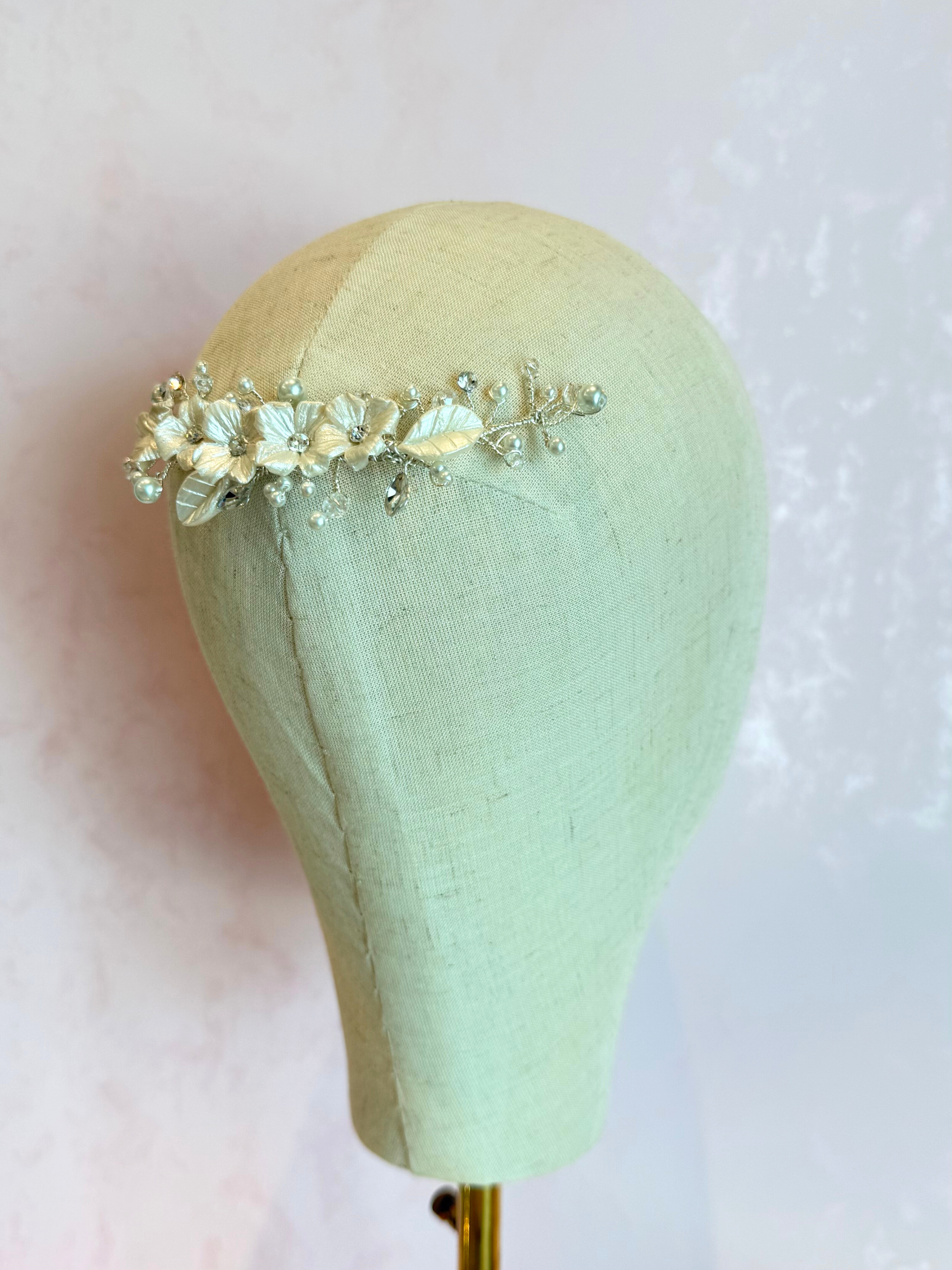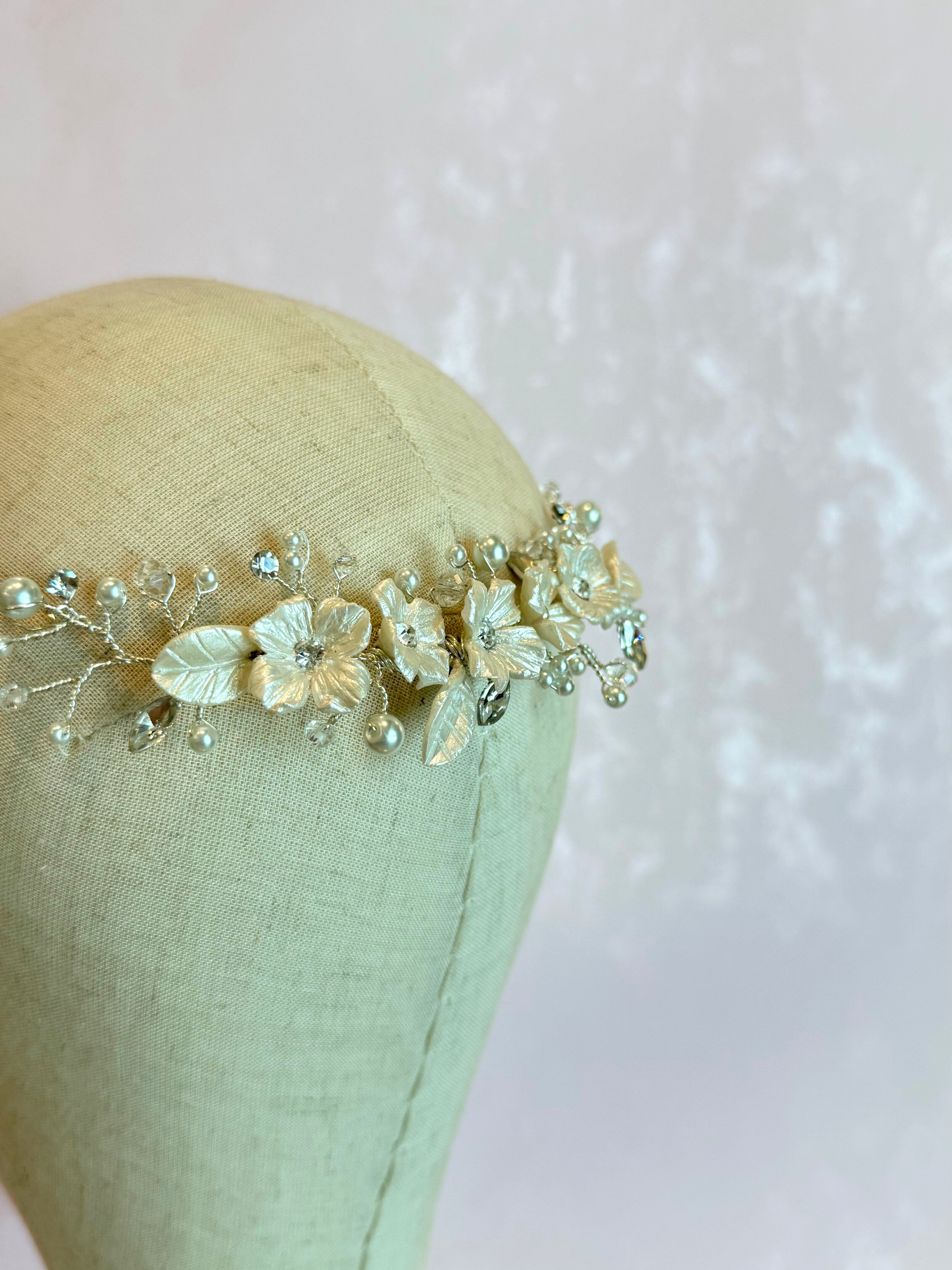 Guía flexible de base de alambre en tono plateado con ramaje de perlas de distintos tamaños, cristales y 5 flores de porcelana con hojas