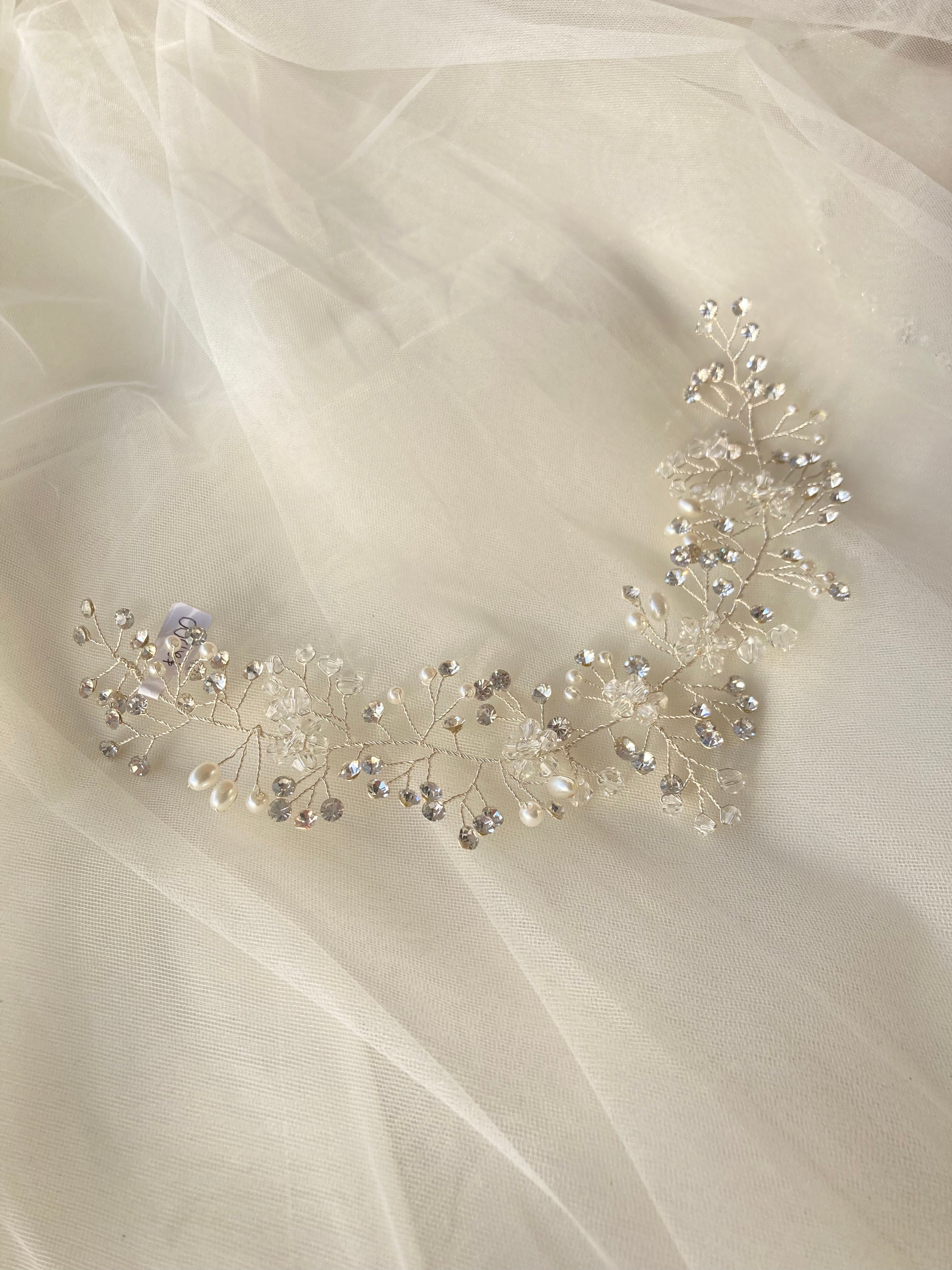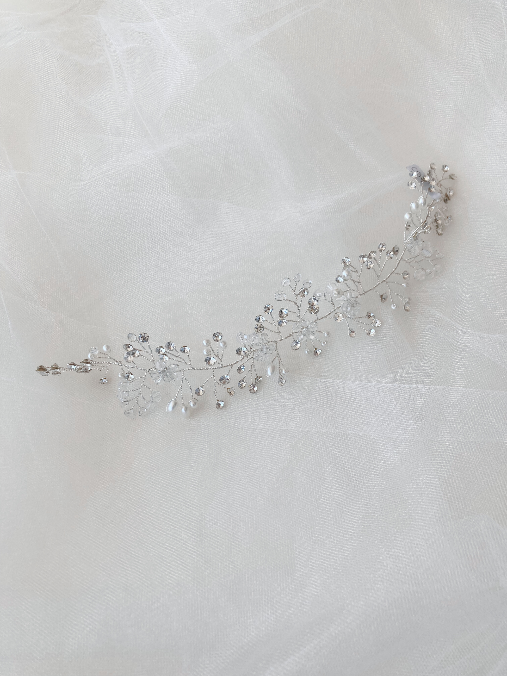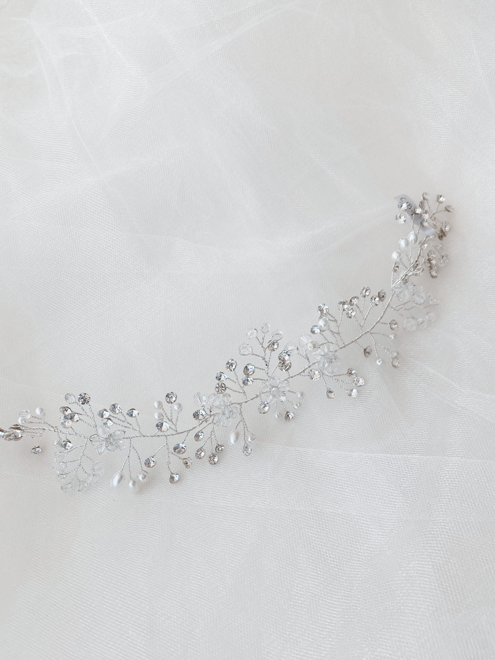 Guía con base de alambre tono plata, detalles de flores de pedrería, perlas y pedrería.