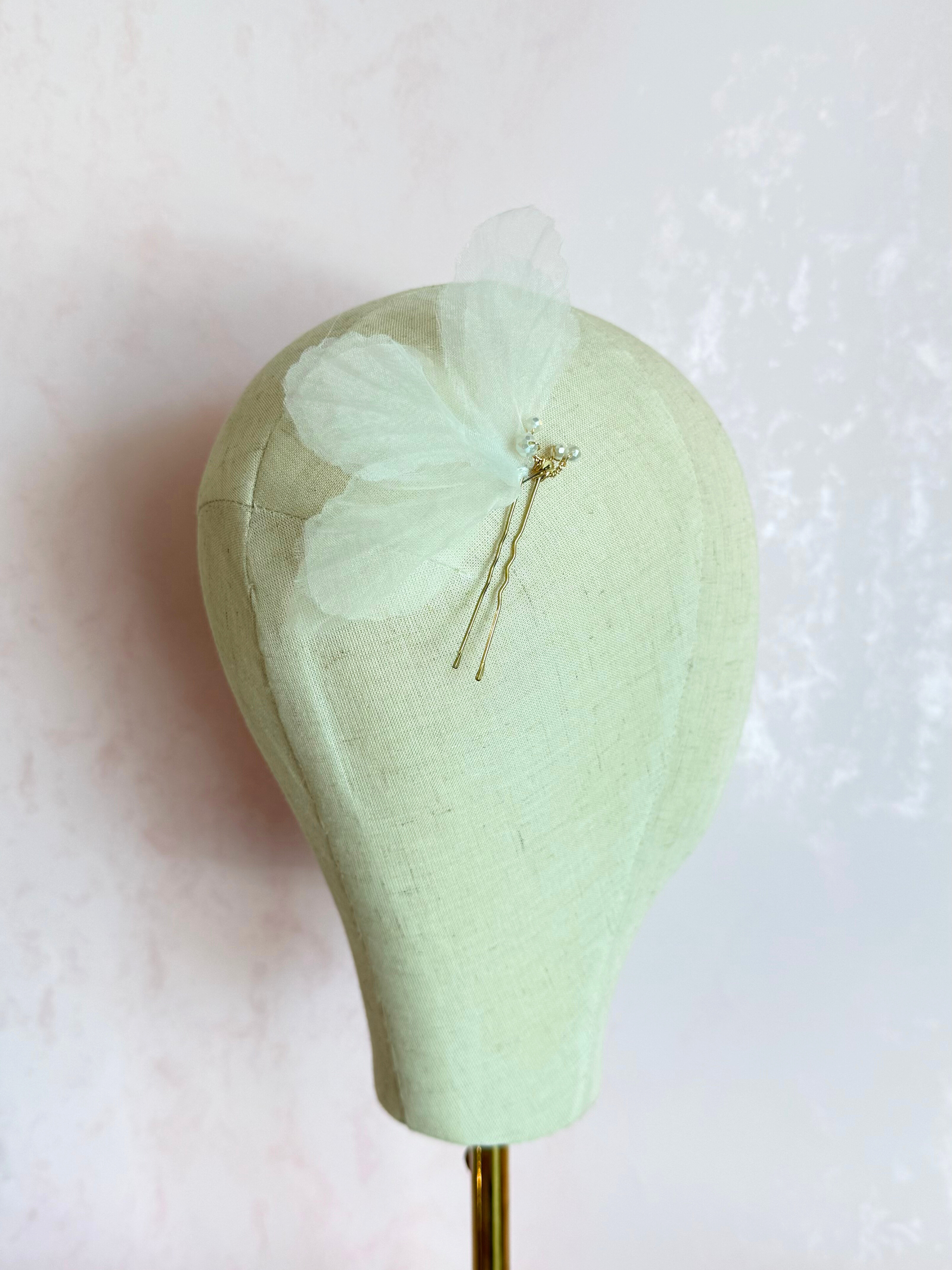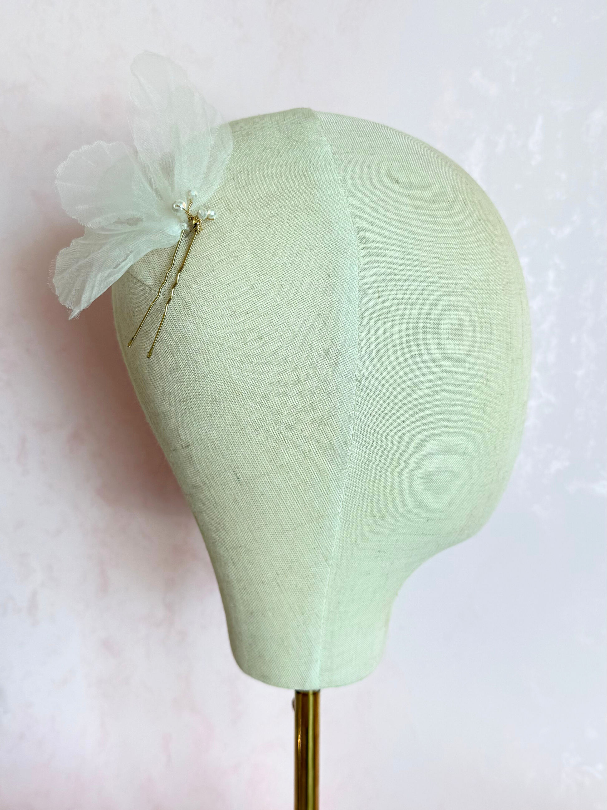 Horquilla de metal en tono plateado con organza en forma de pétalo y perlas