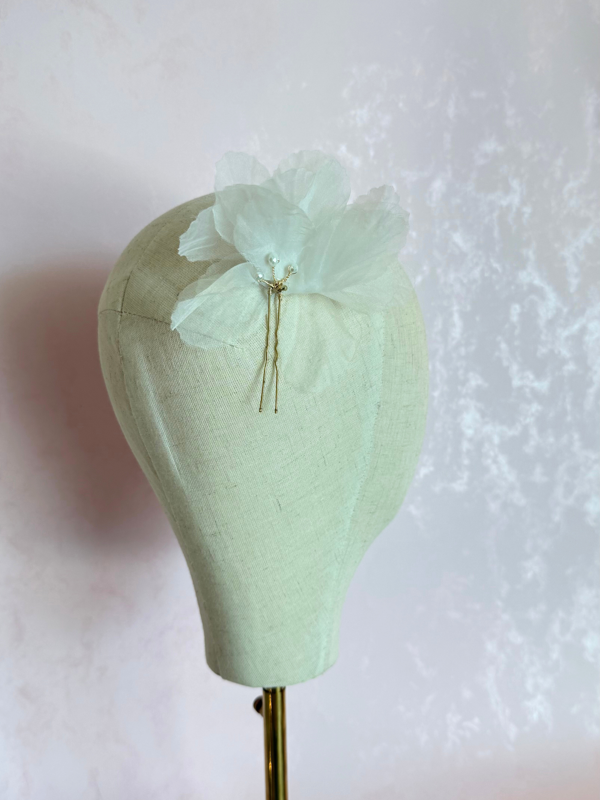 Horquilla de metal en tono plateado con organza en forma de pétalo o flor y perlas