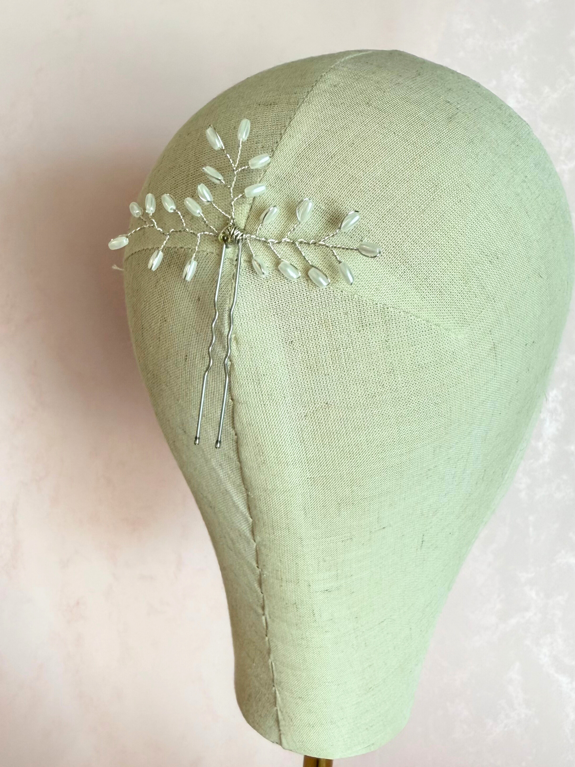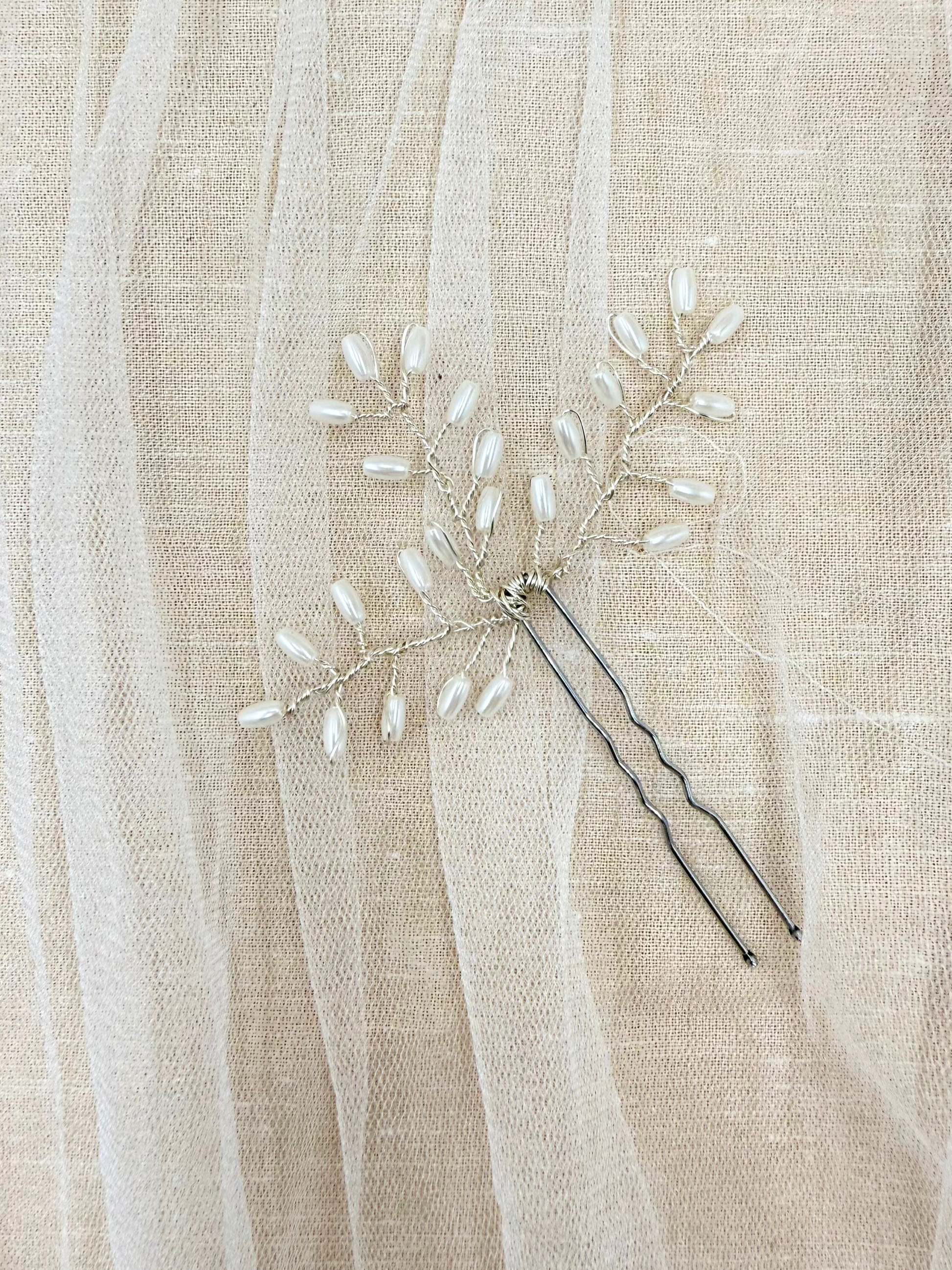 Horquillas de metal en tono plateado en ramajes de perlitas de arroz