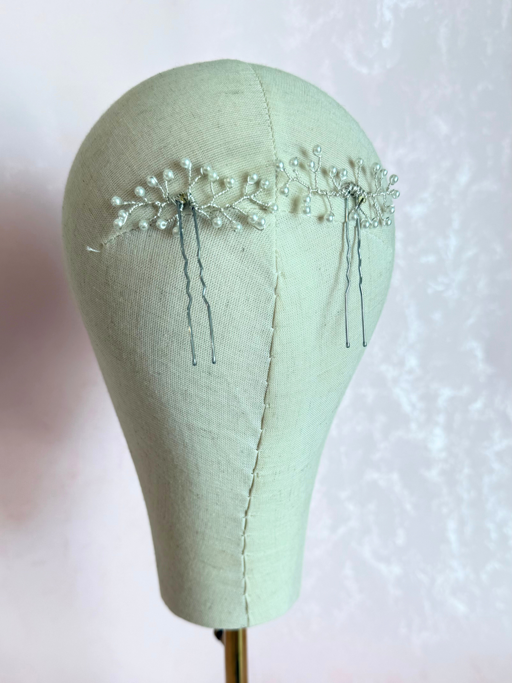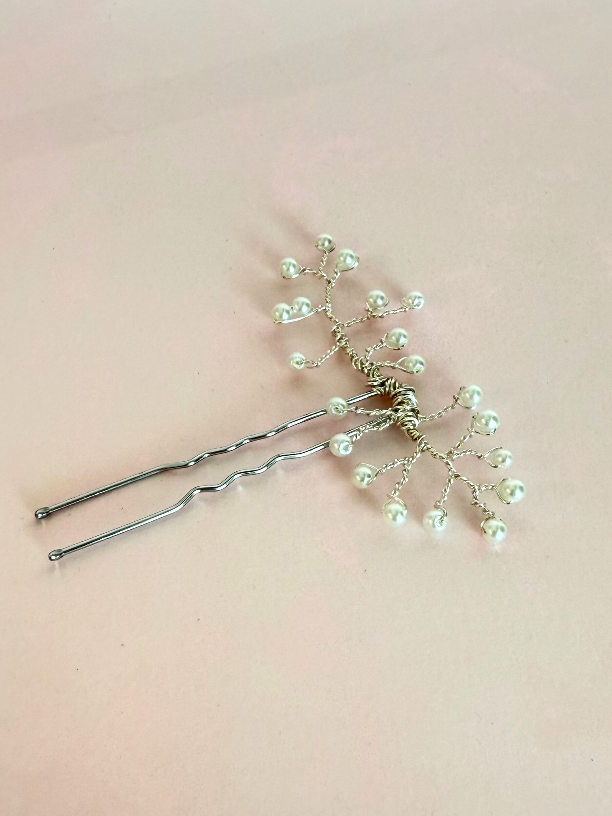 Hair pin elaborado a base de alambre en tono plateado con perlas mini (0.3 mm)