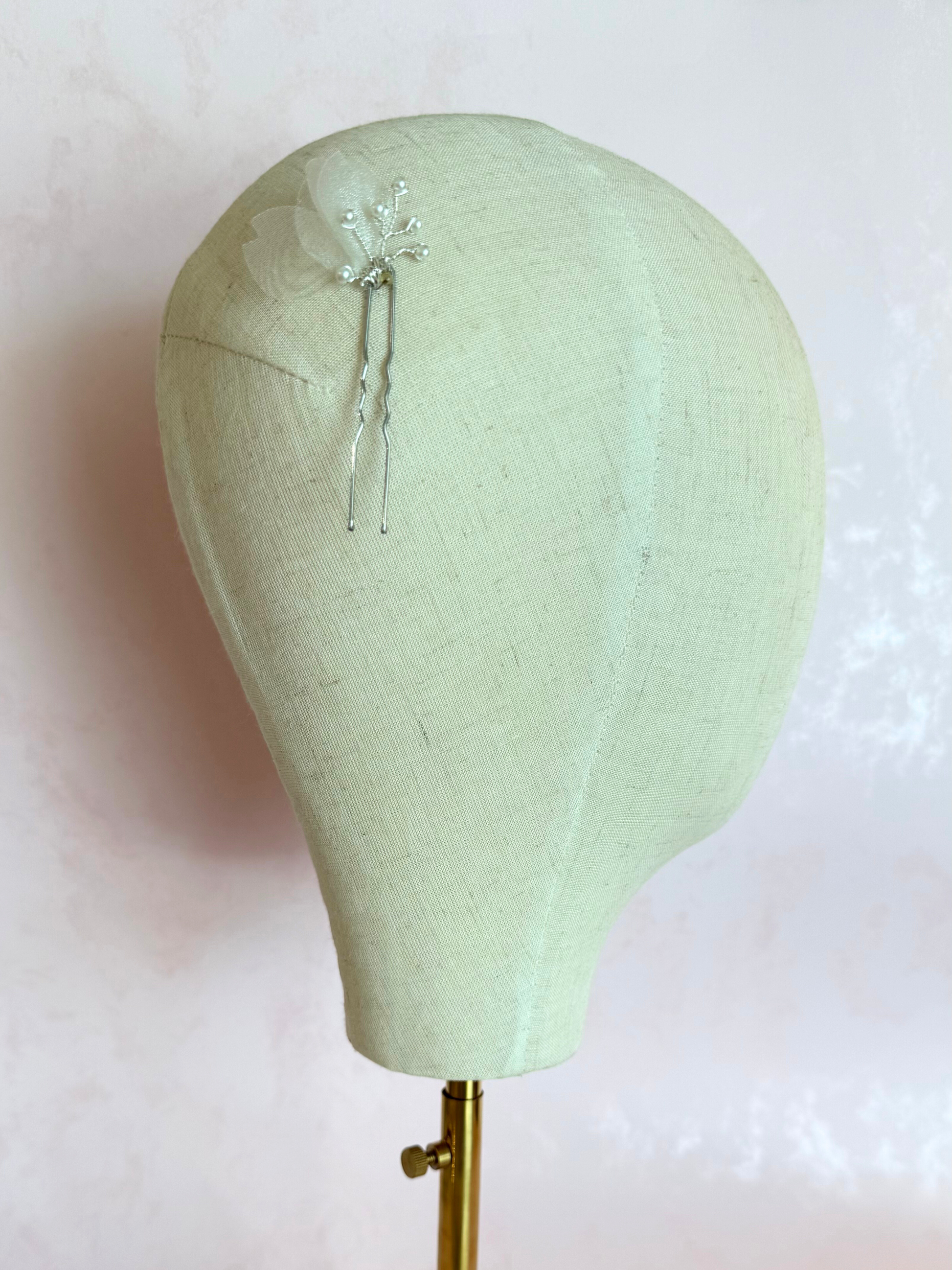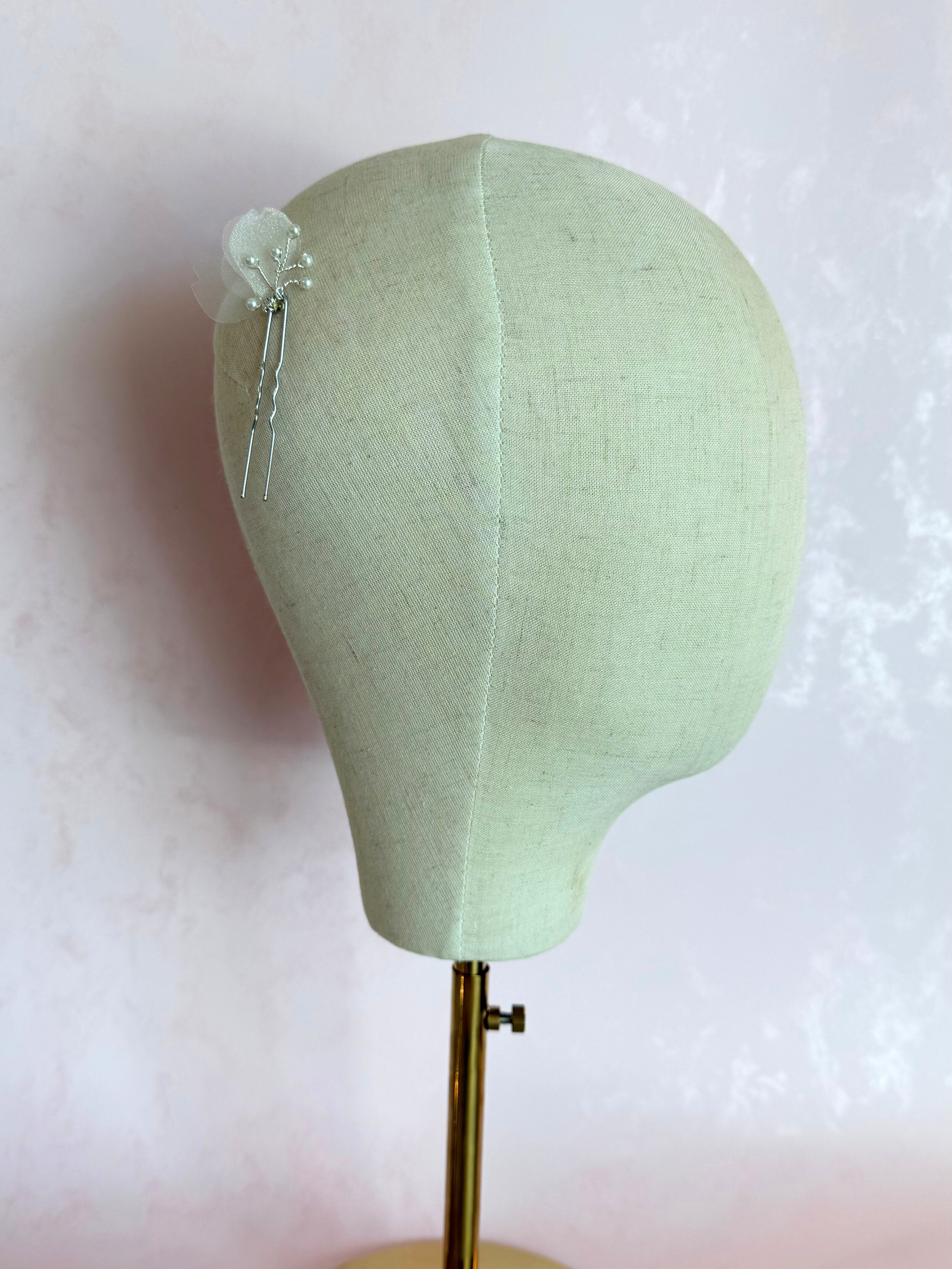 Horquilla de metal con pétalo de organza y ramaje perlas