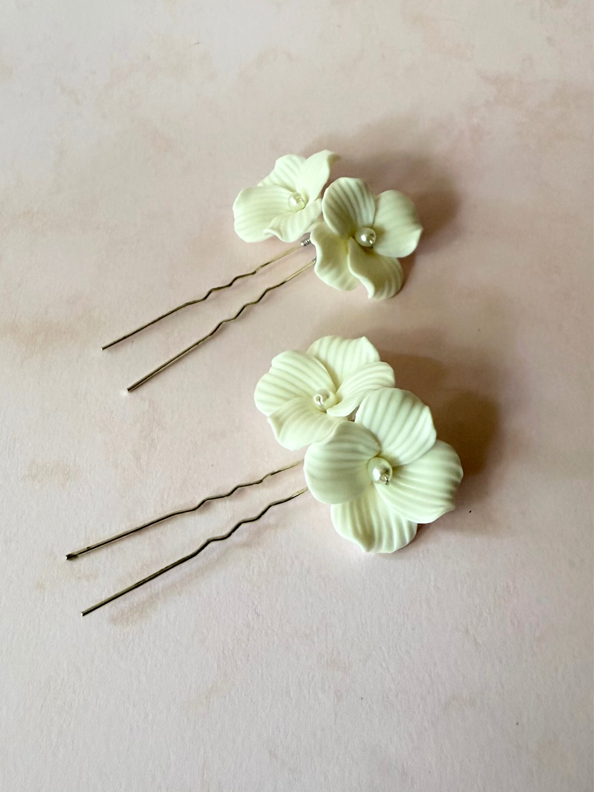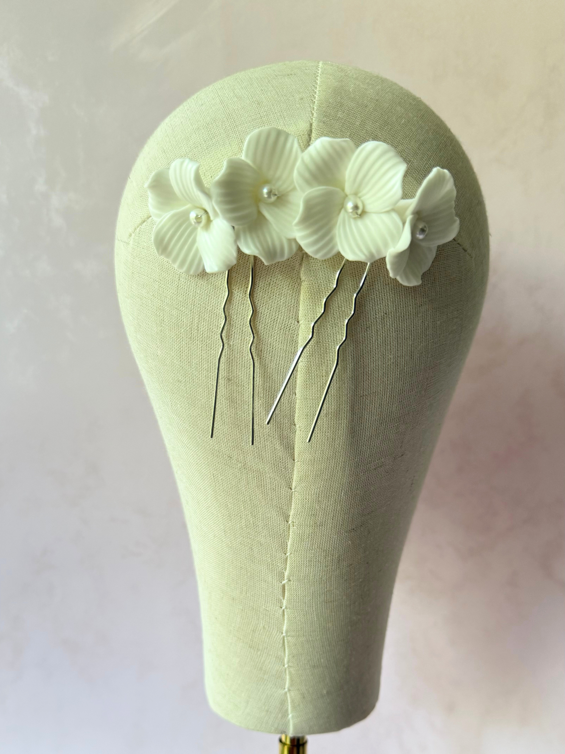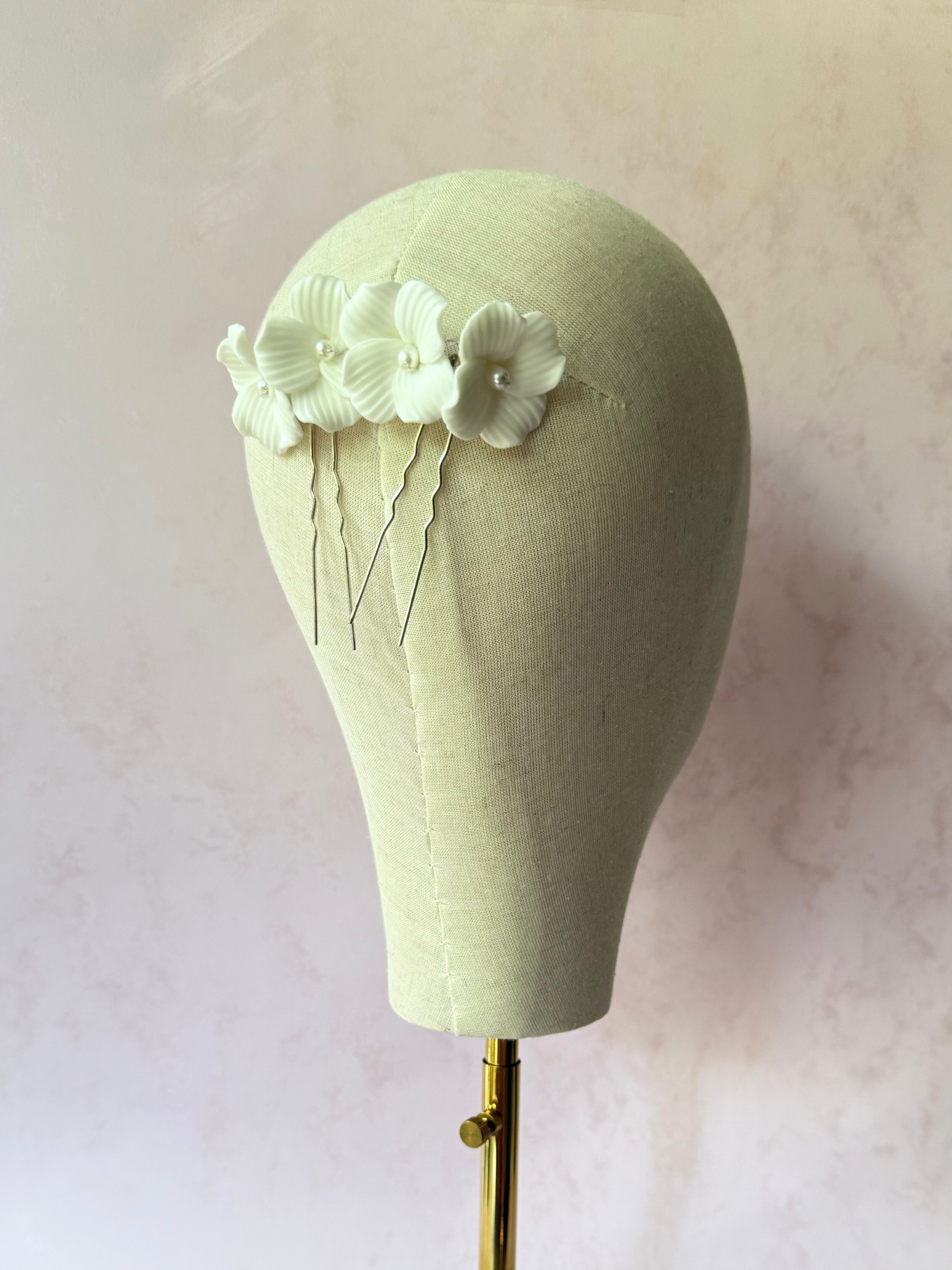 Horquillas de metal en tono plateado con dos flores de porcelana cada una