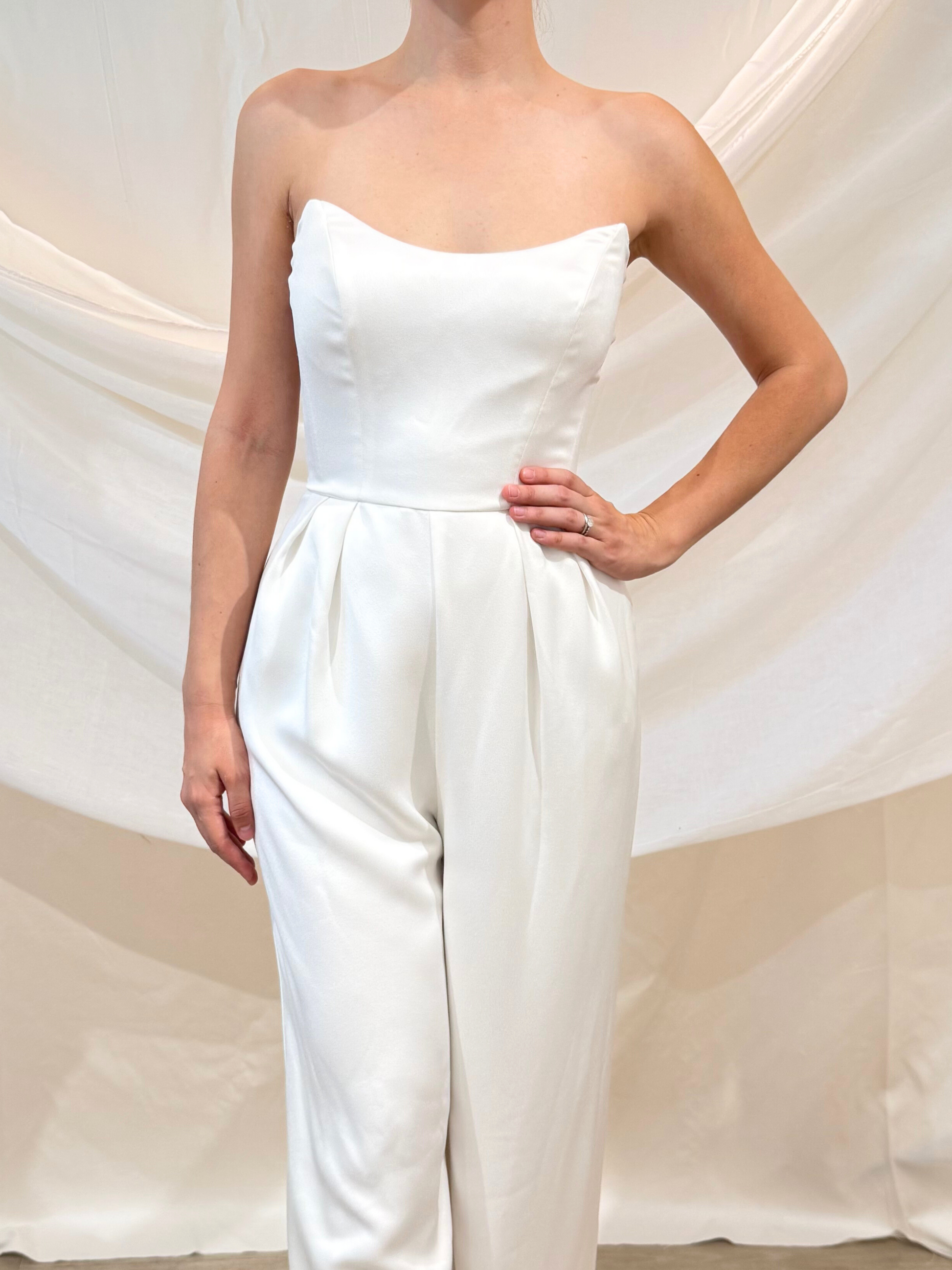 Jumpsuit strapless de satín con bolzas en el pantalón