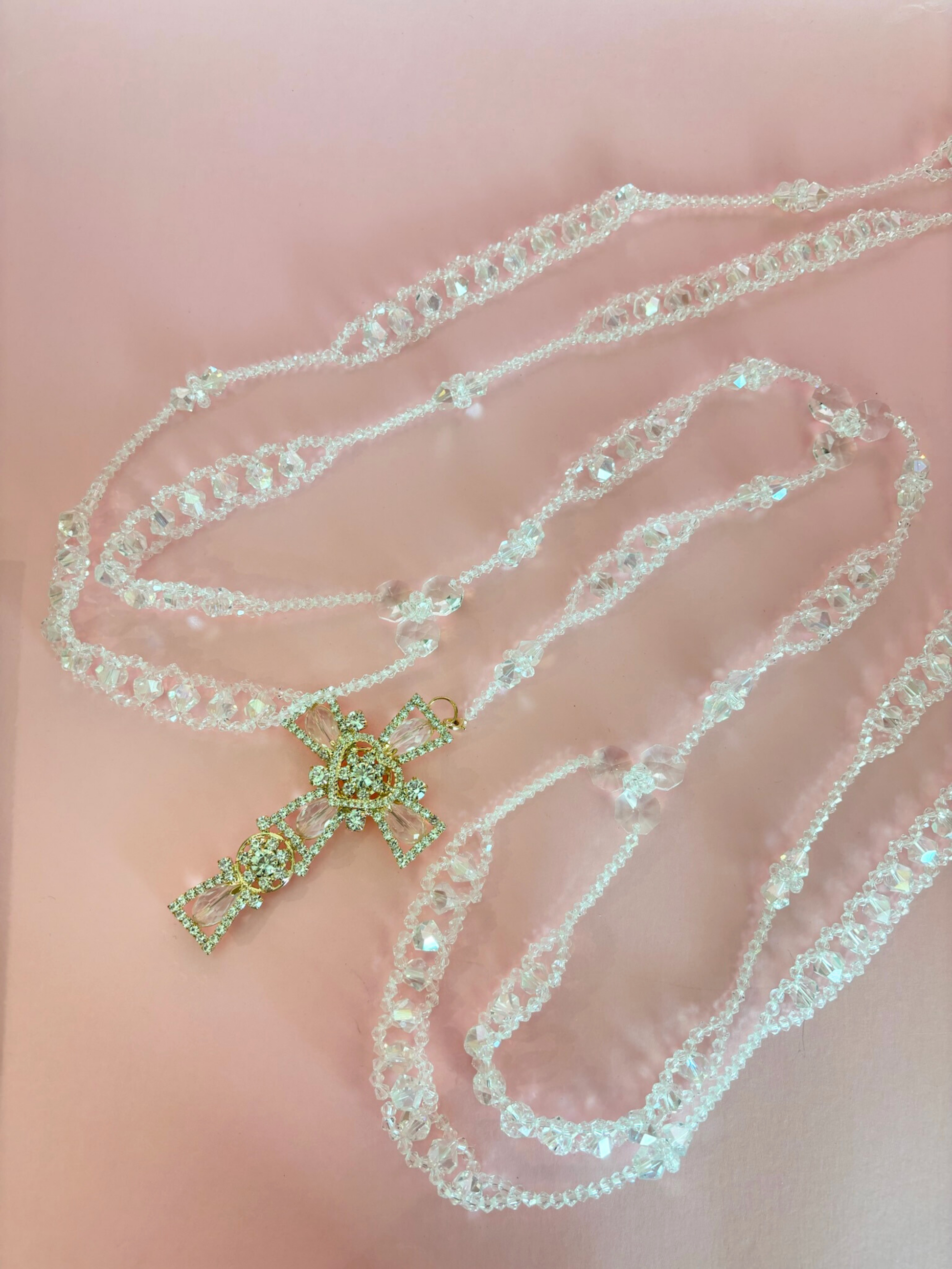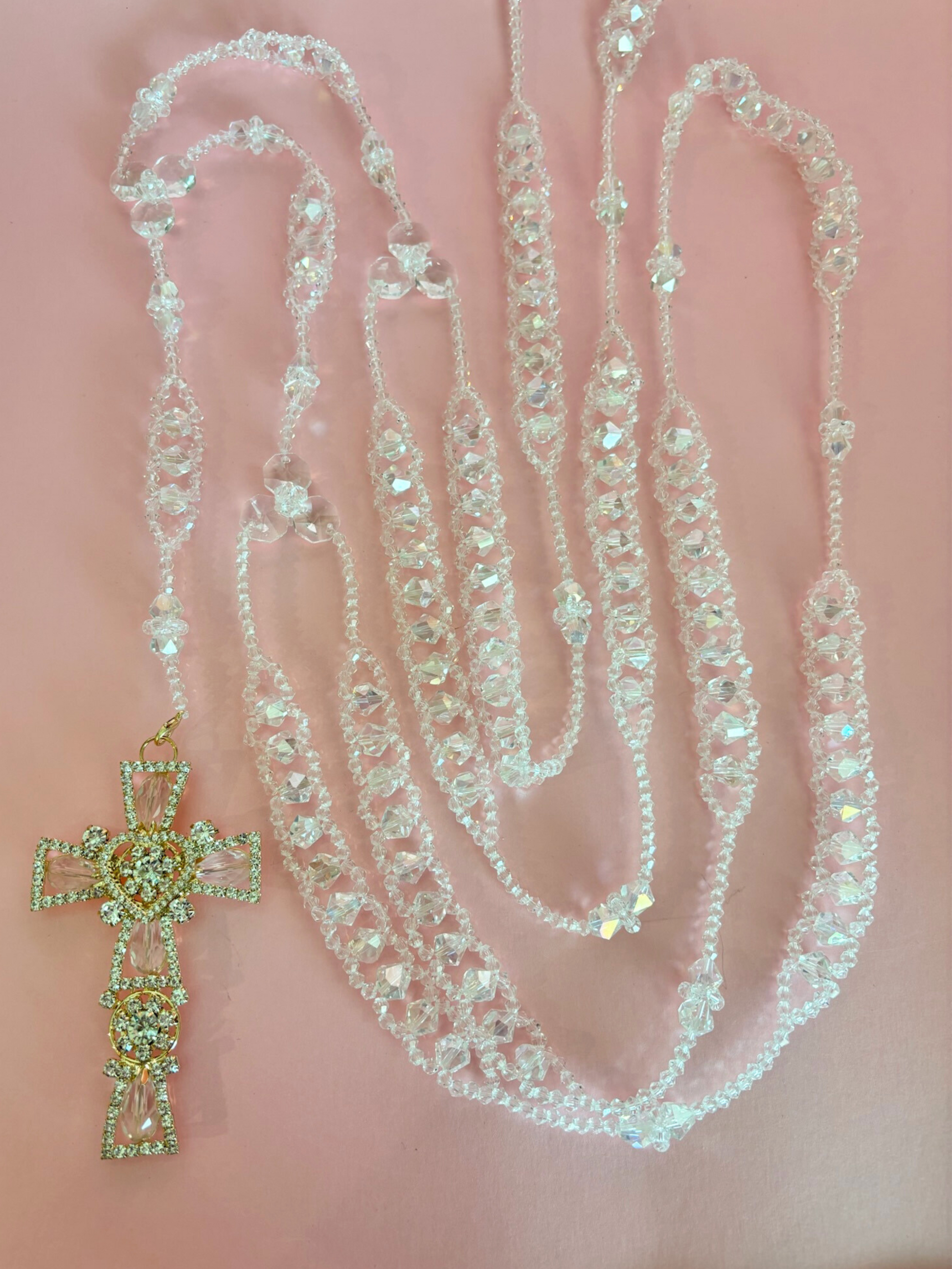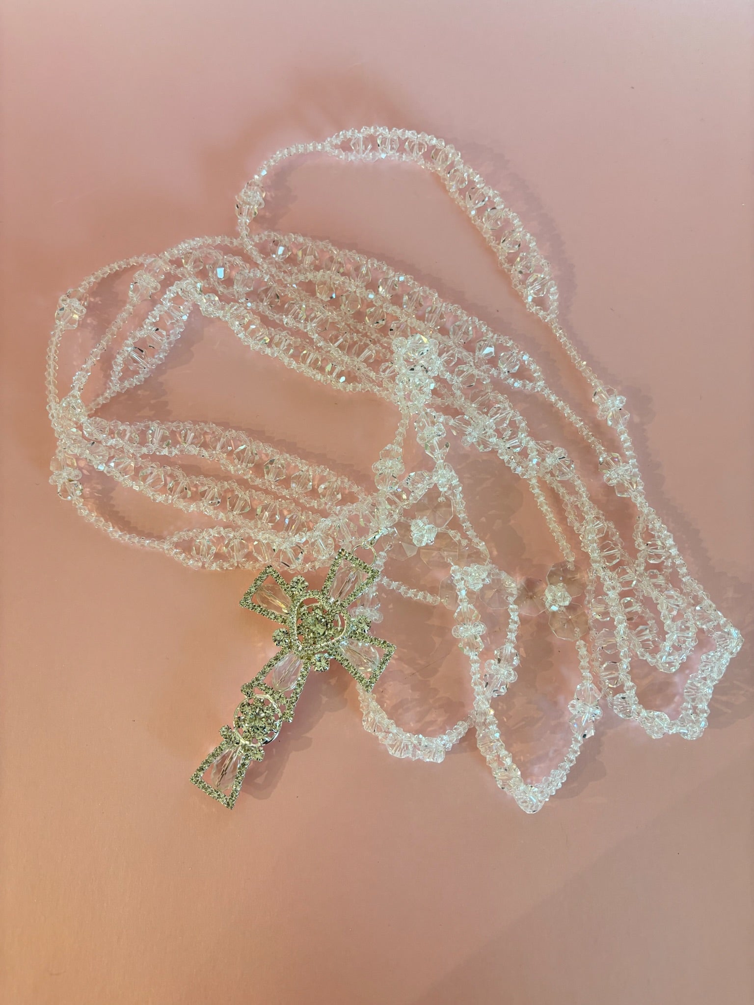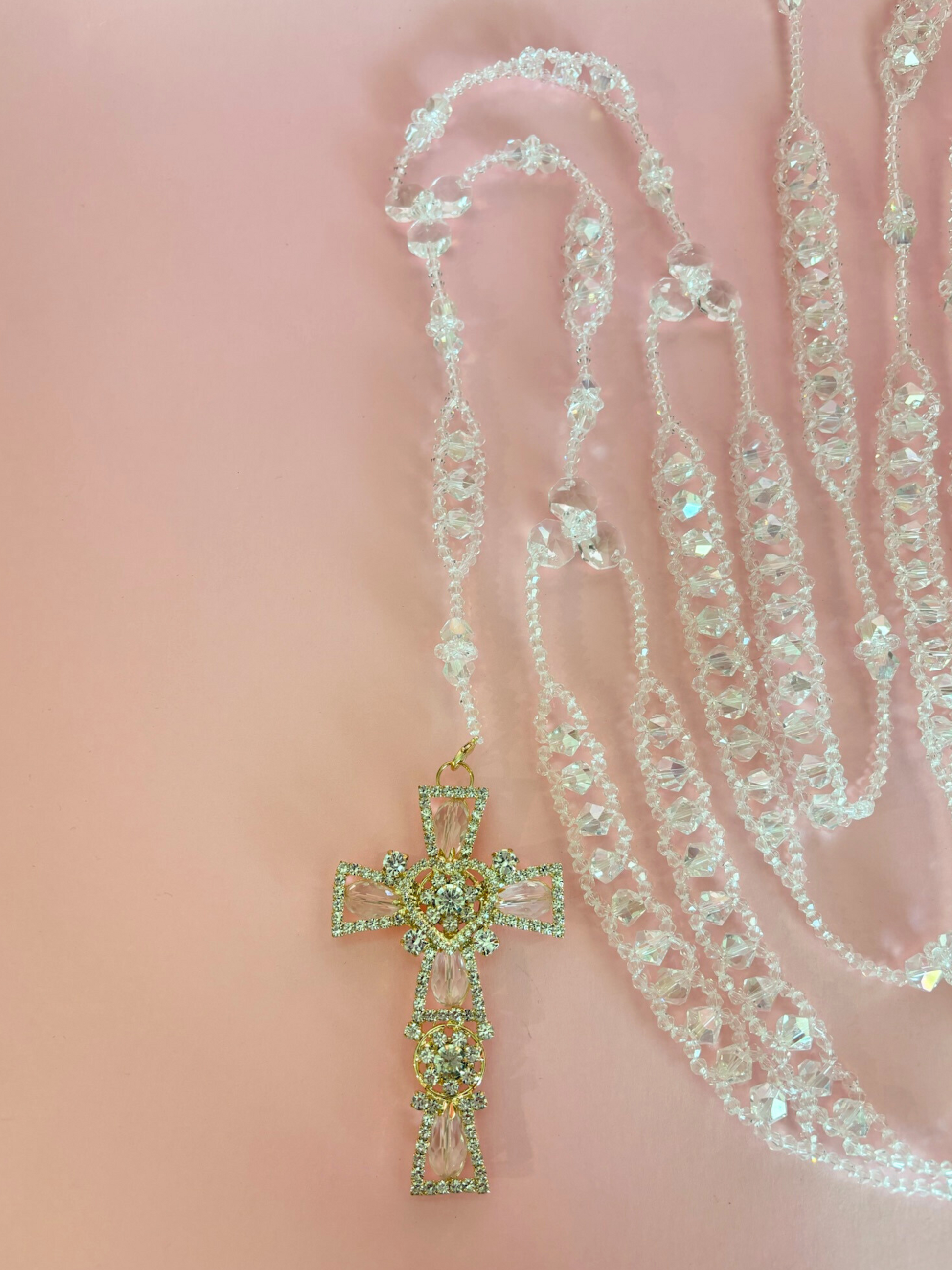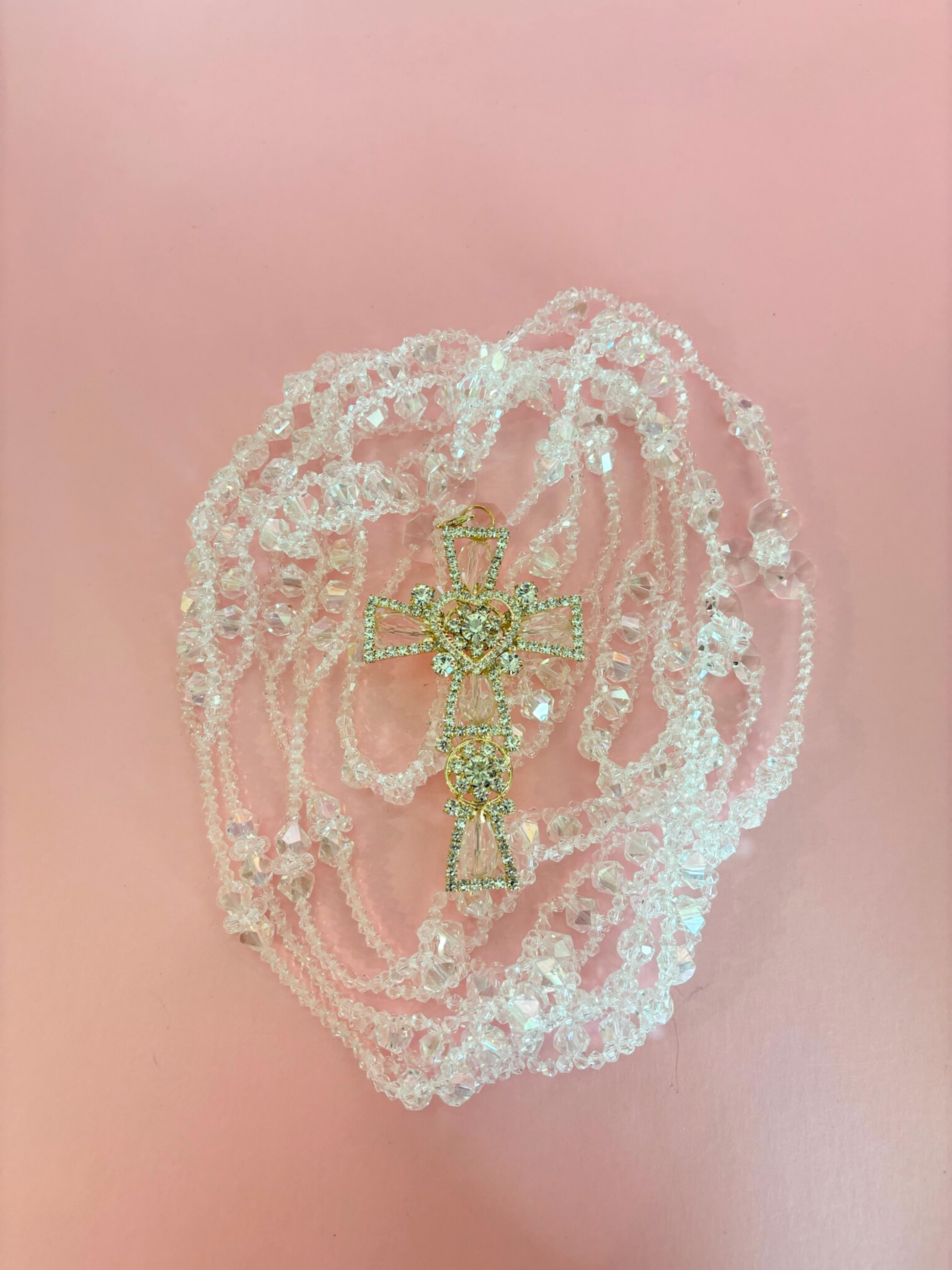Lazo matrimonial de cristales entre lazados con crucifijo de pedrería en tono dorado