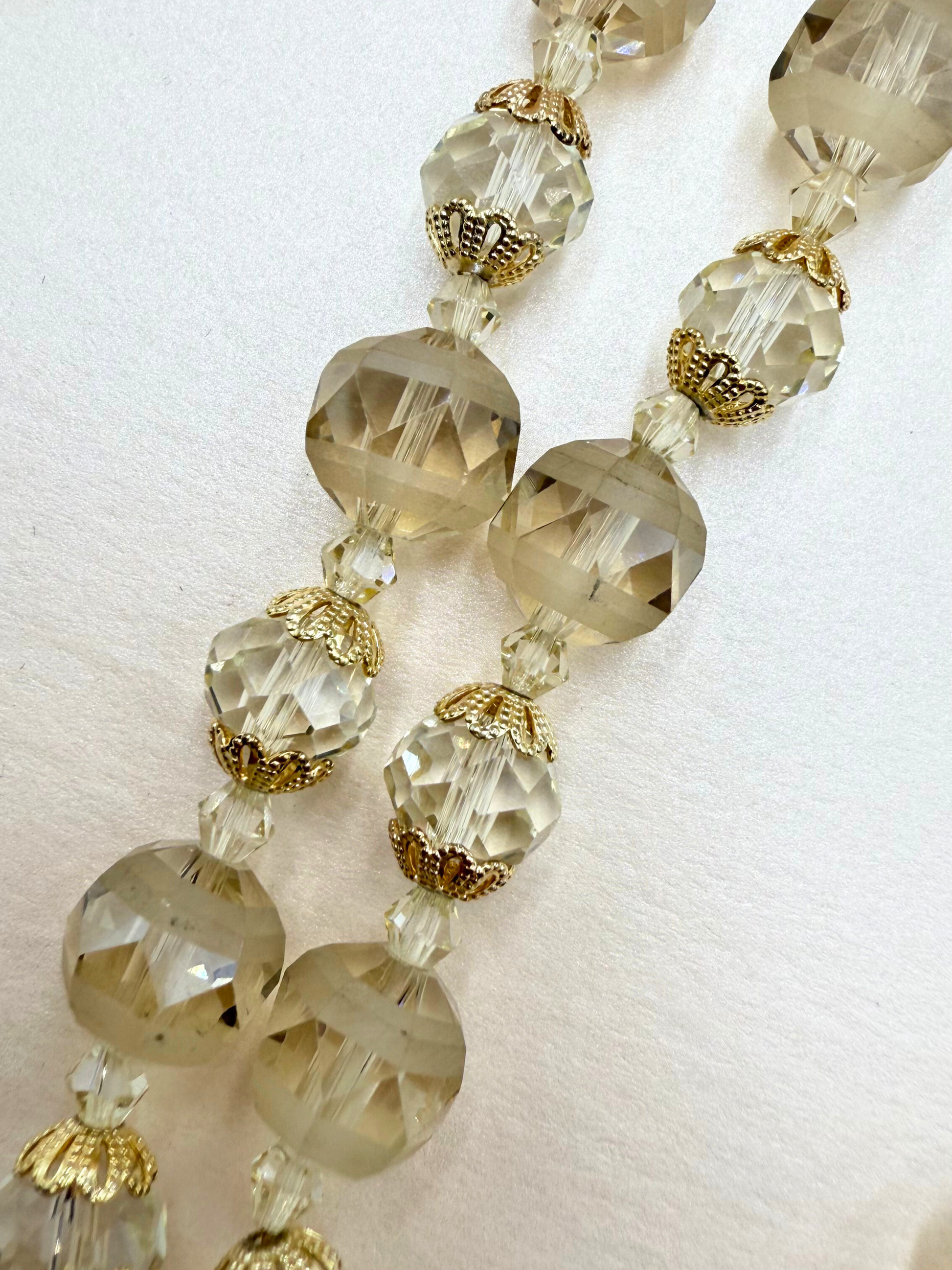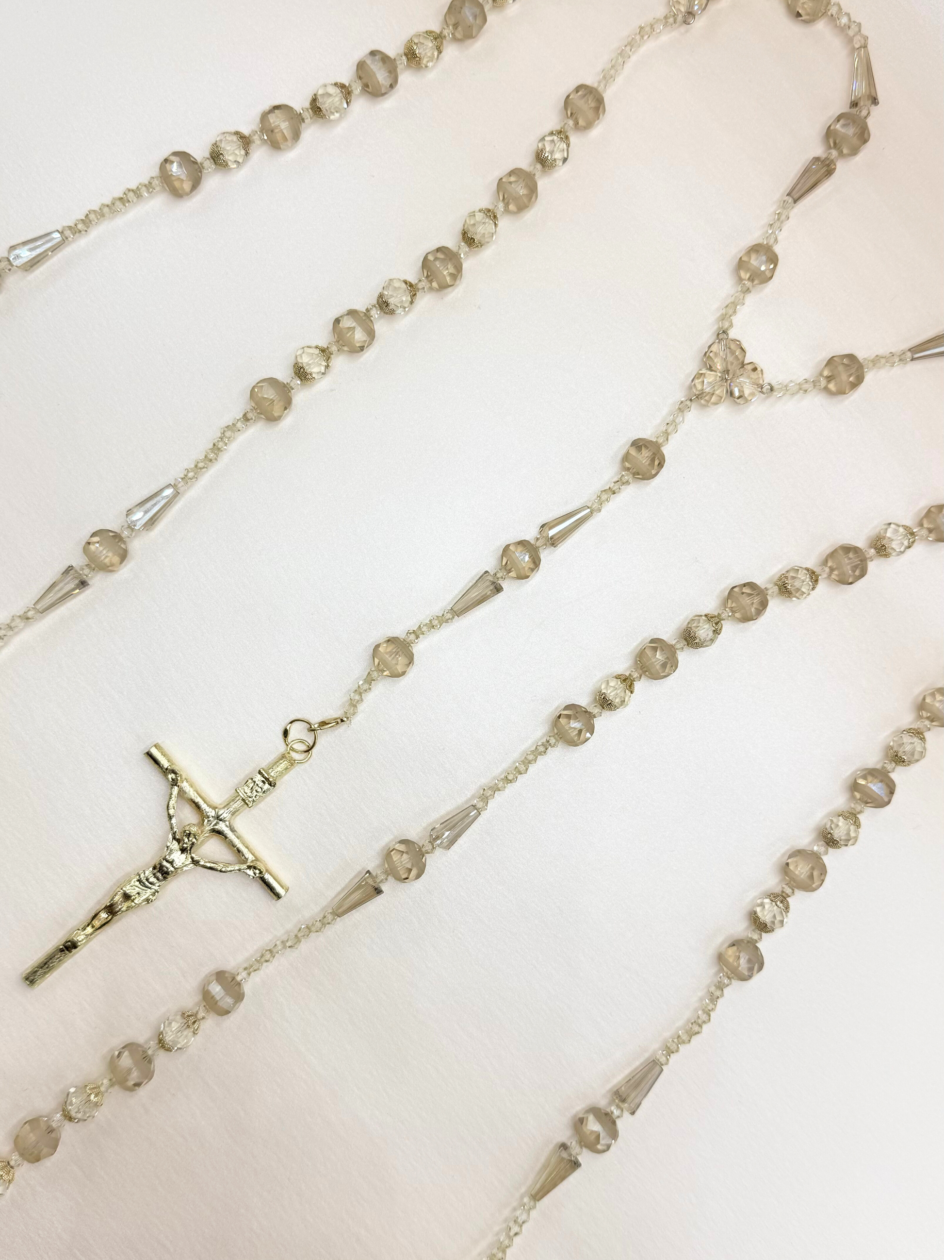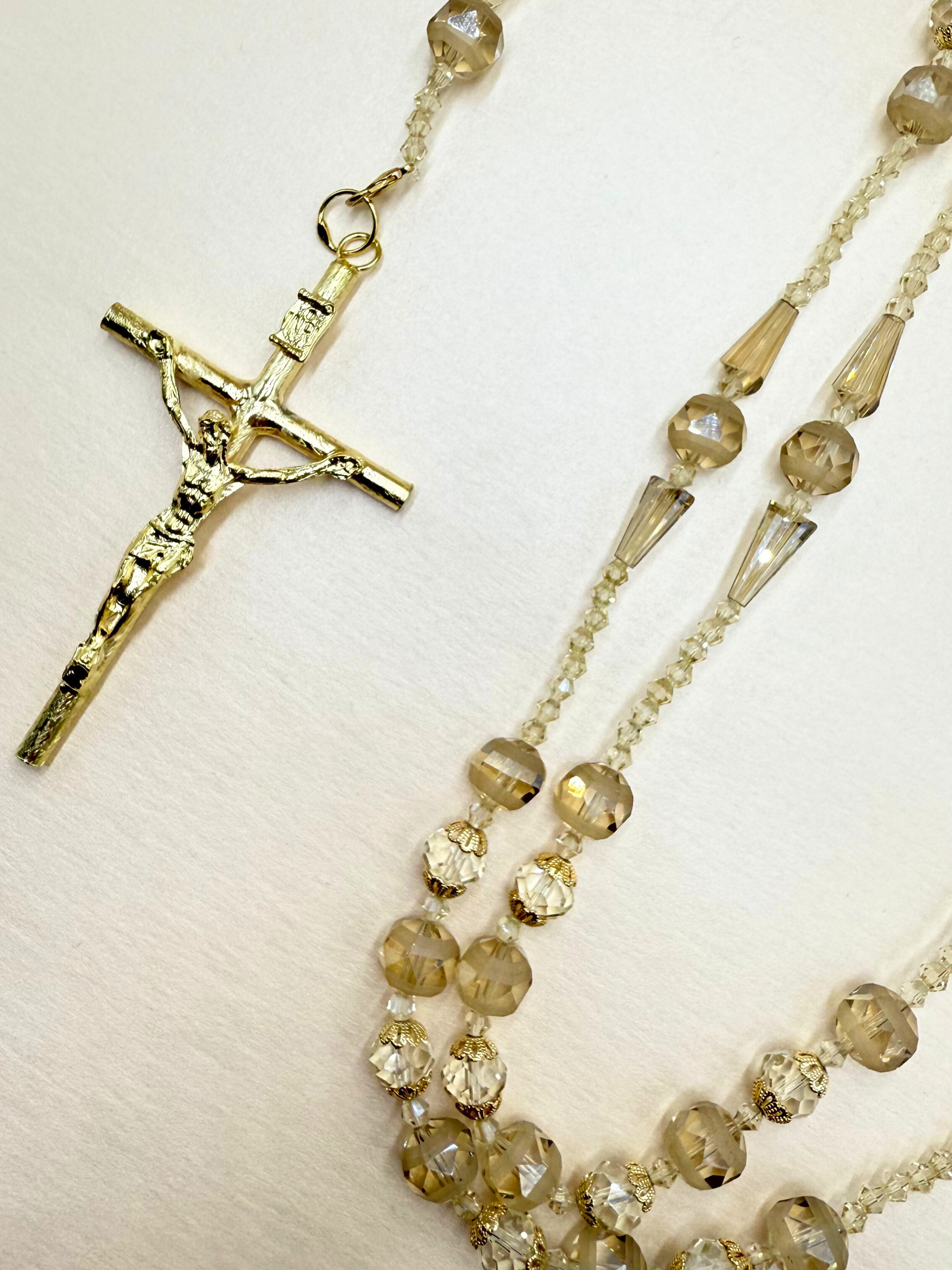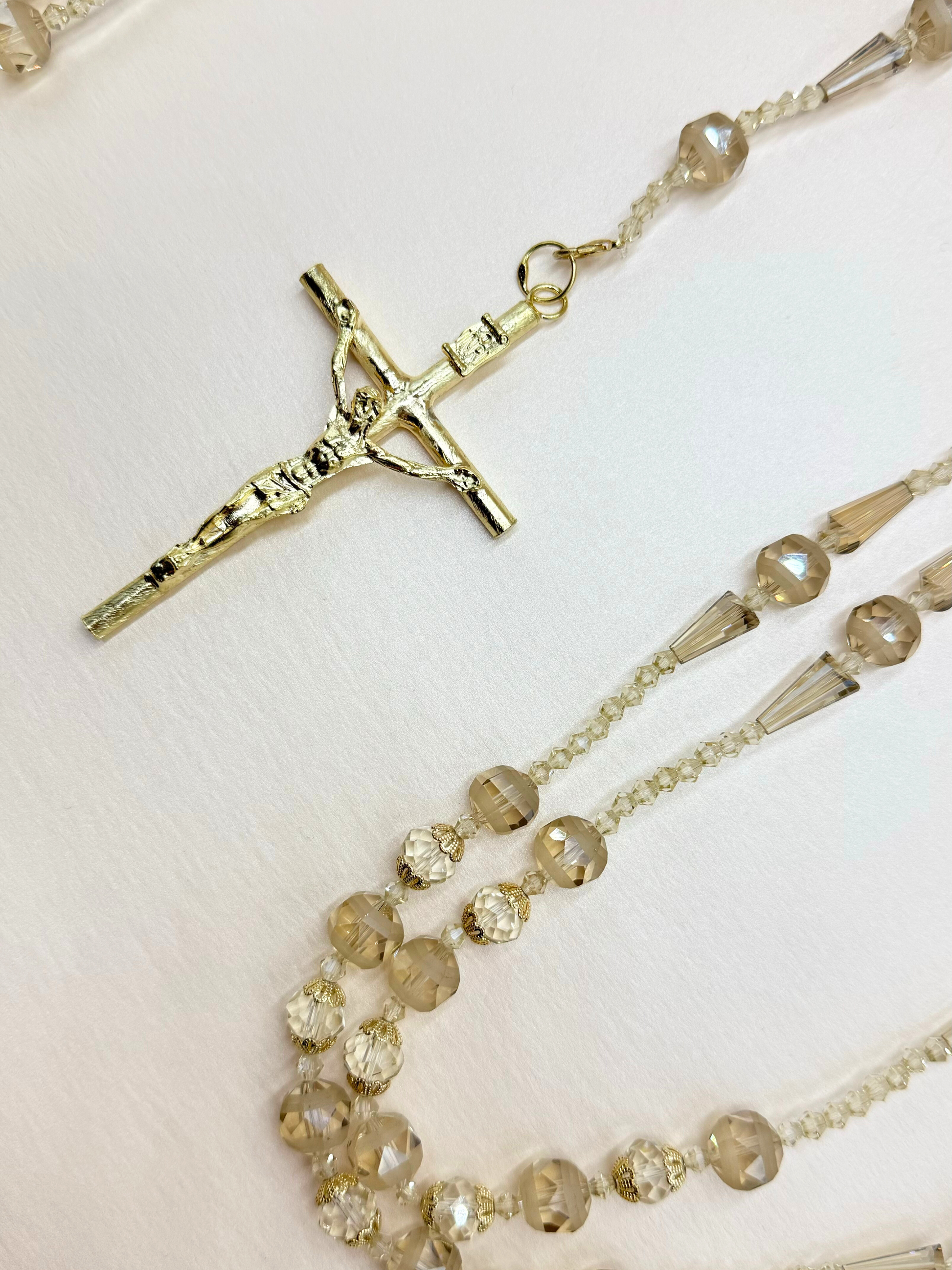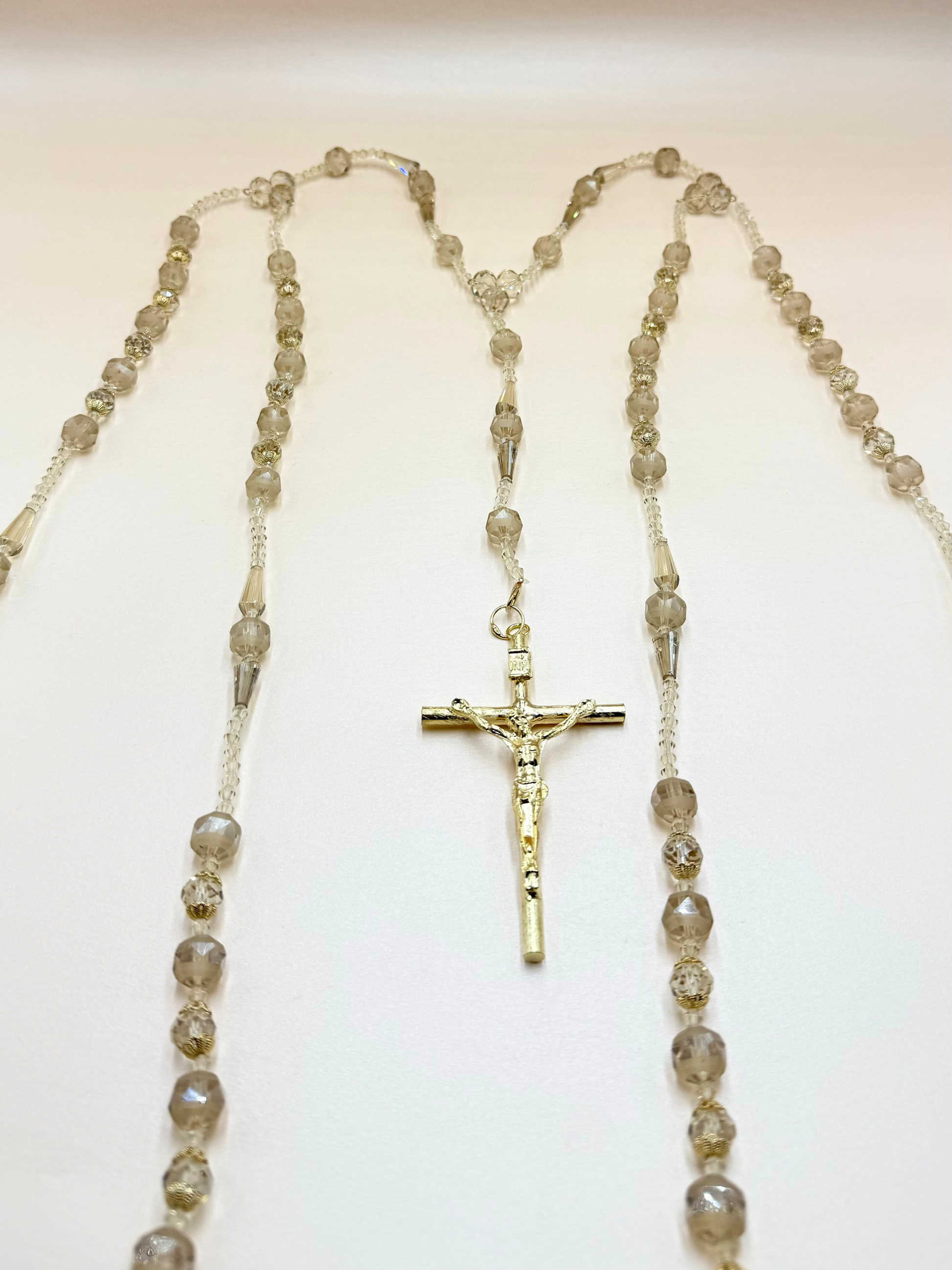 Lazo en tono champagne con cuentas de metal doradas y crucifijo sencillo dorado