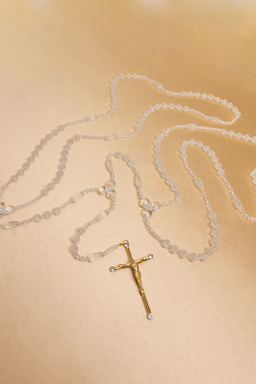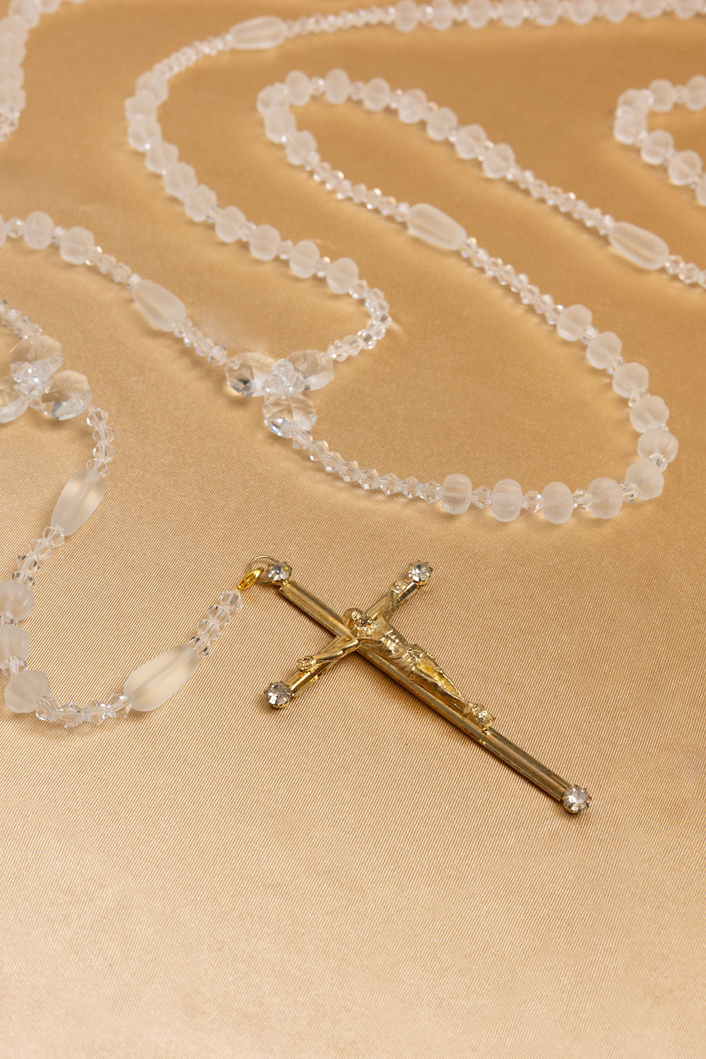 Lazo matrimonial de cristales y gemas translucidas con crucifijo sencillo dorado