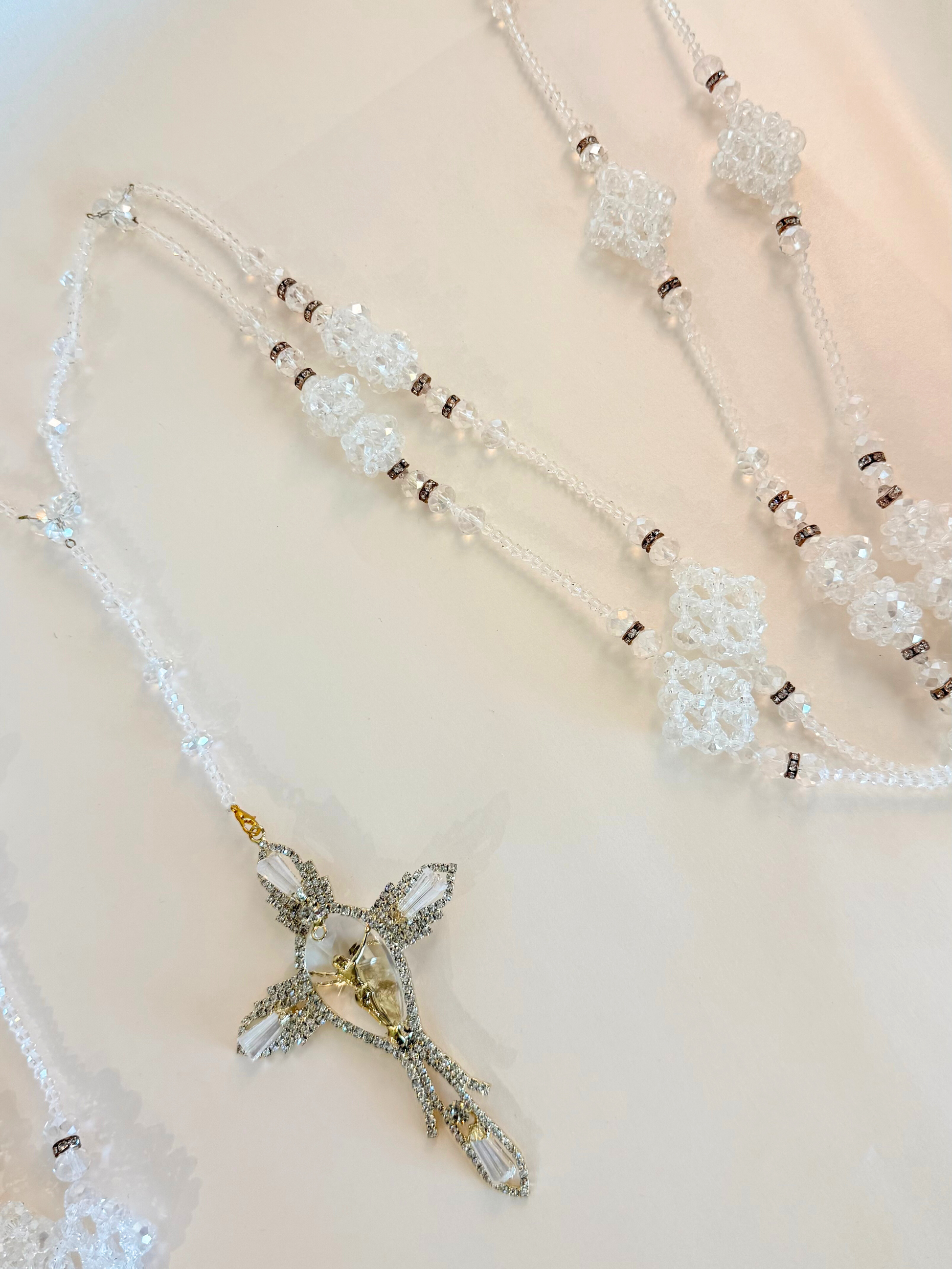 Lazo matrimonial con cristales , aros dorados con pedrería y crucifijo dorado con pedrería