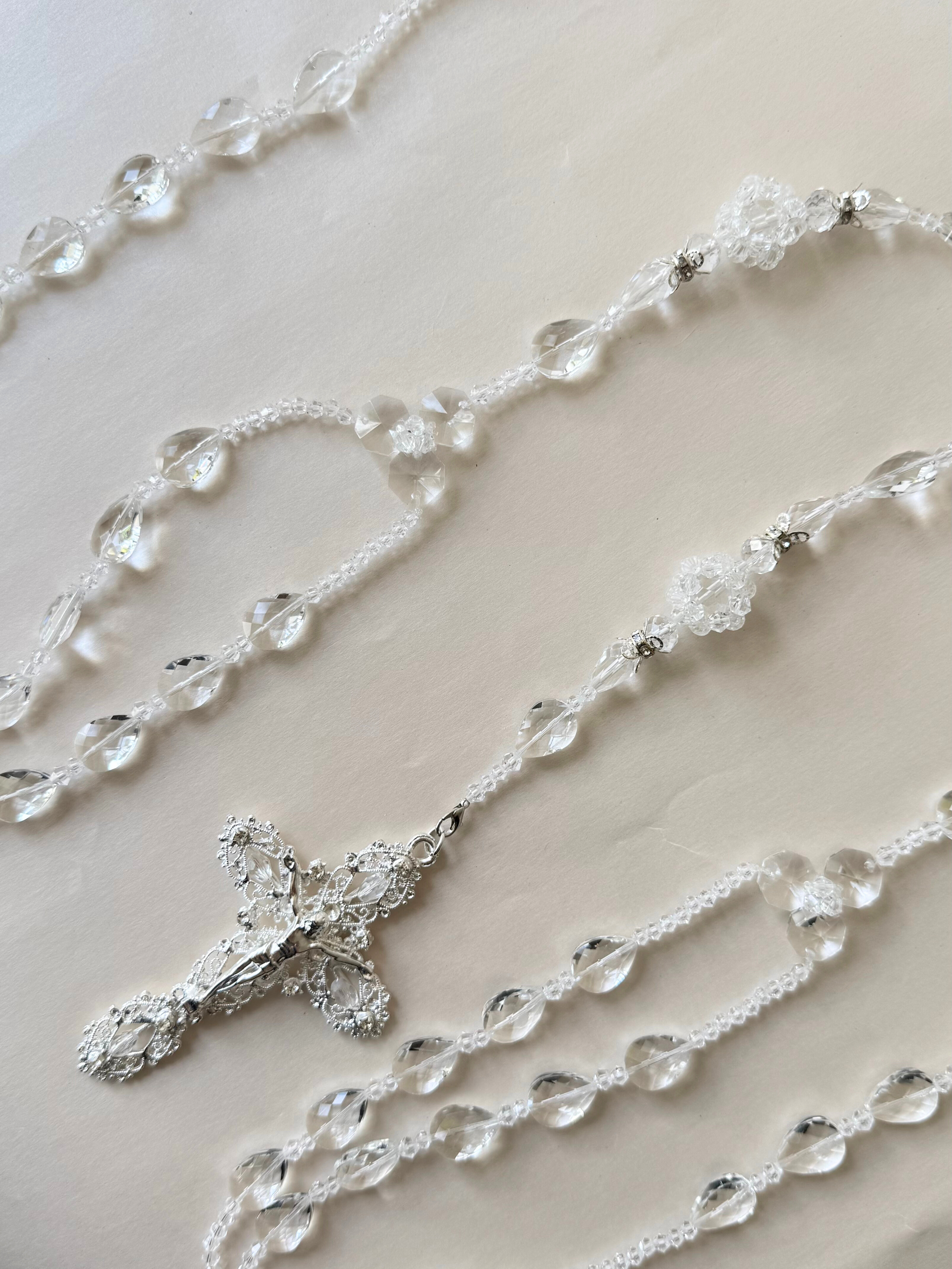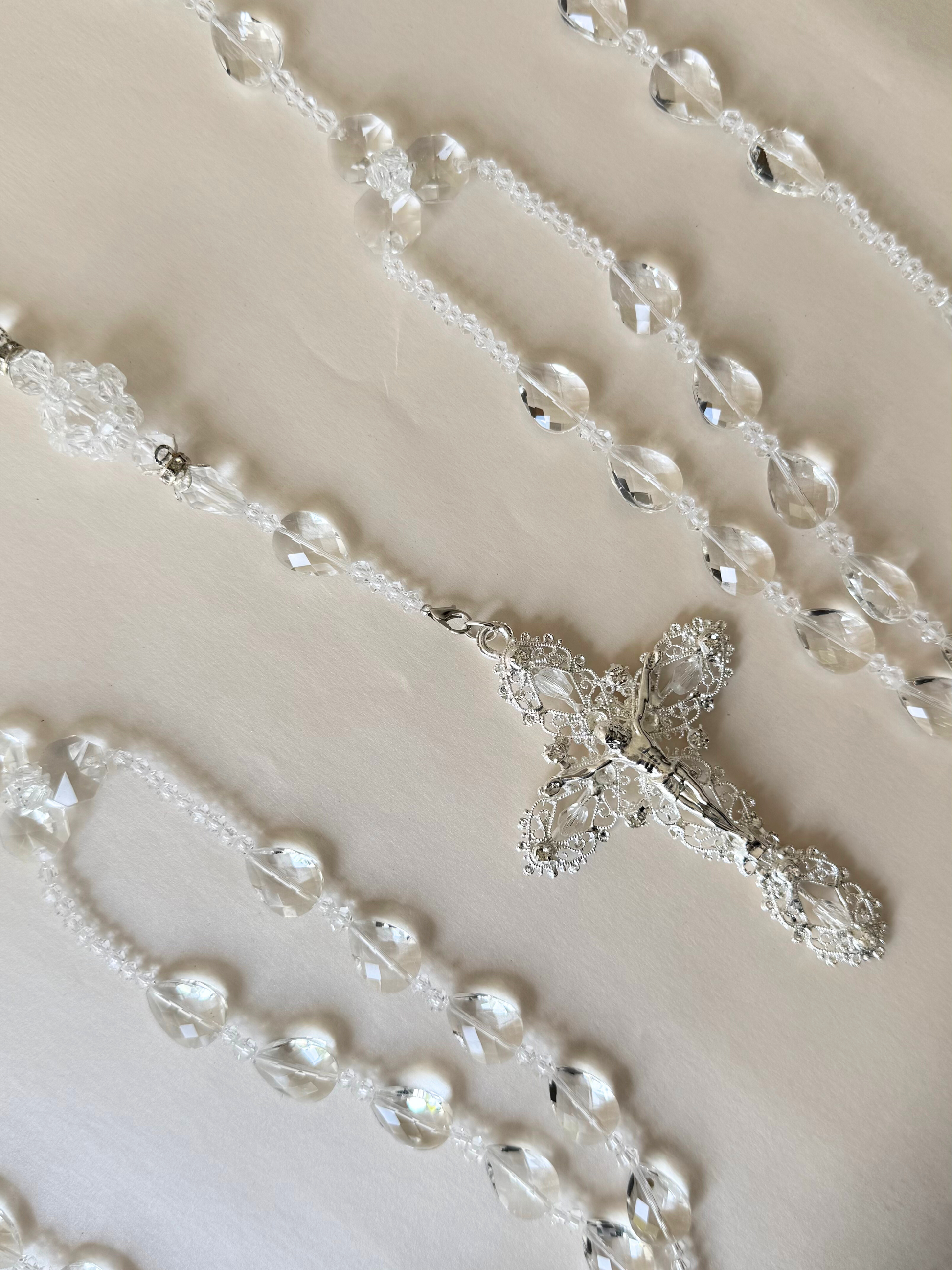Lazo matrimonial de cristal cortado de distintas formas con aros de pedrería en tono plateado y crucifijo mediano de metal