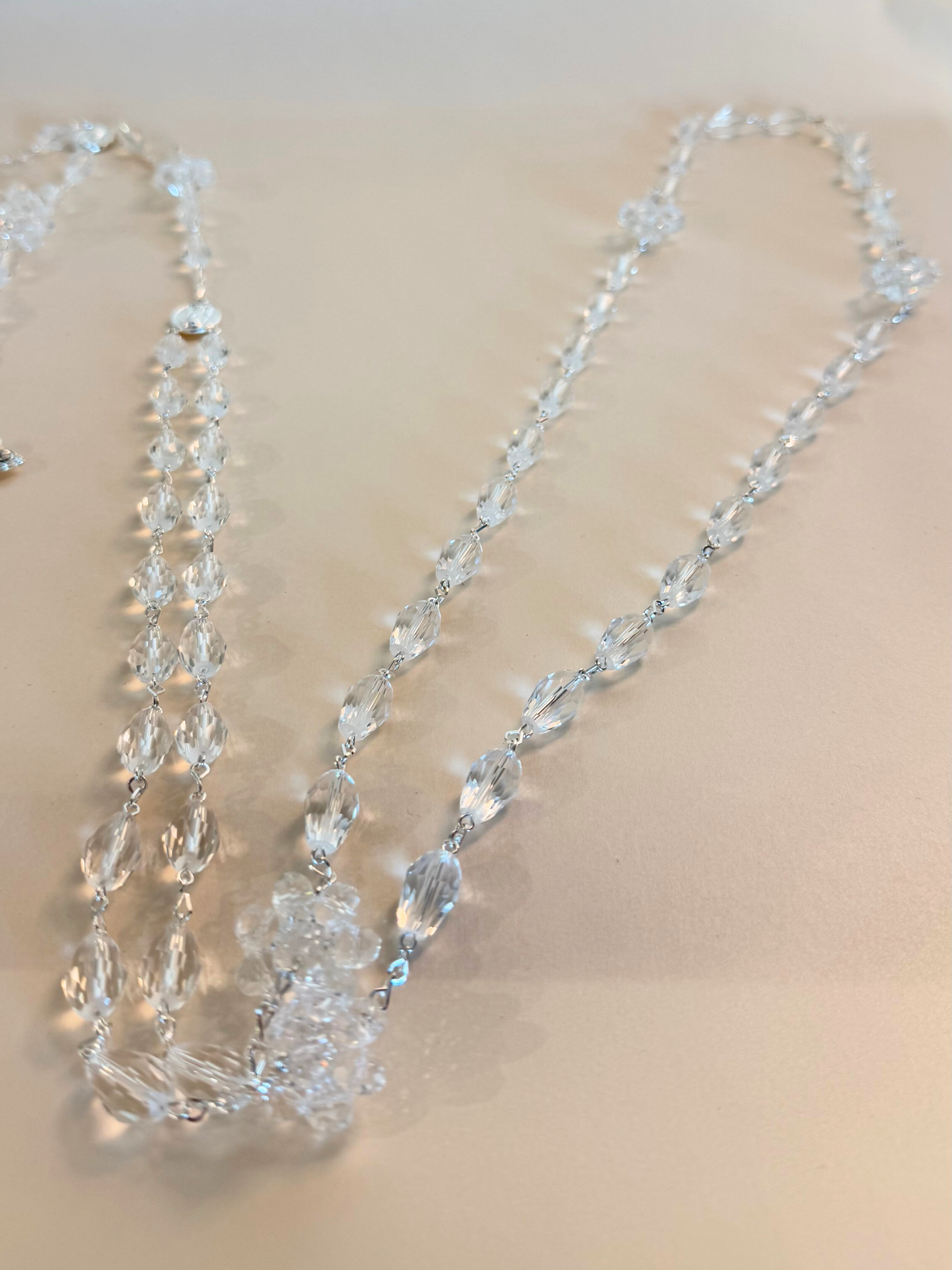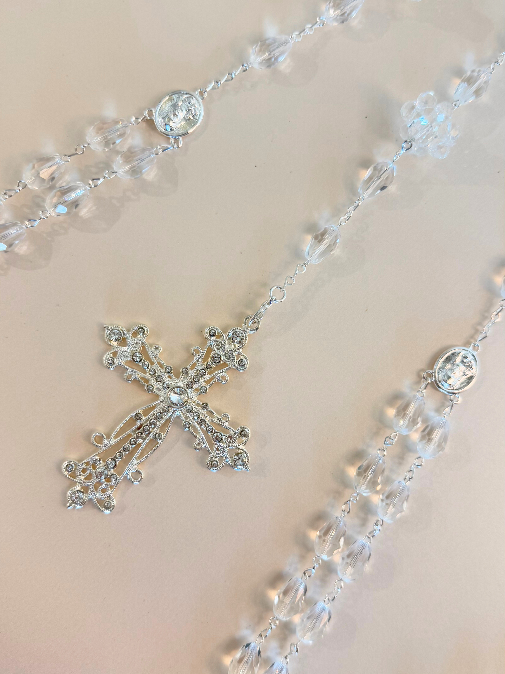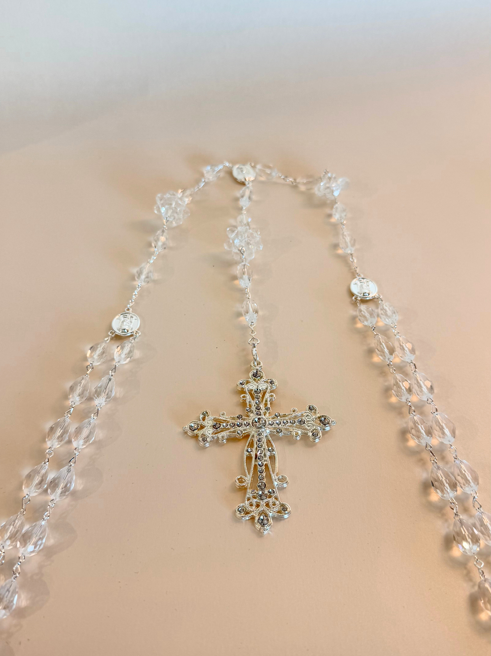Lazo de cristal cortado con medallas de cristo y la virgen y crucifijo con circonias