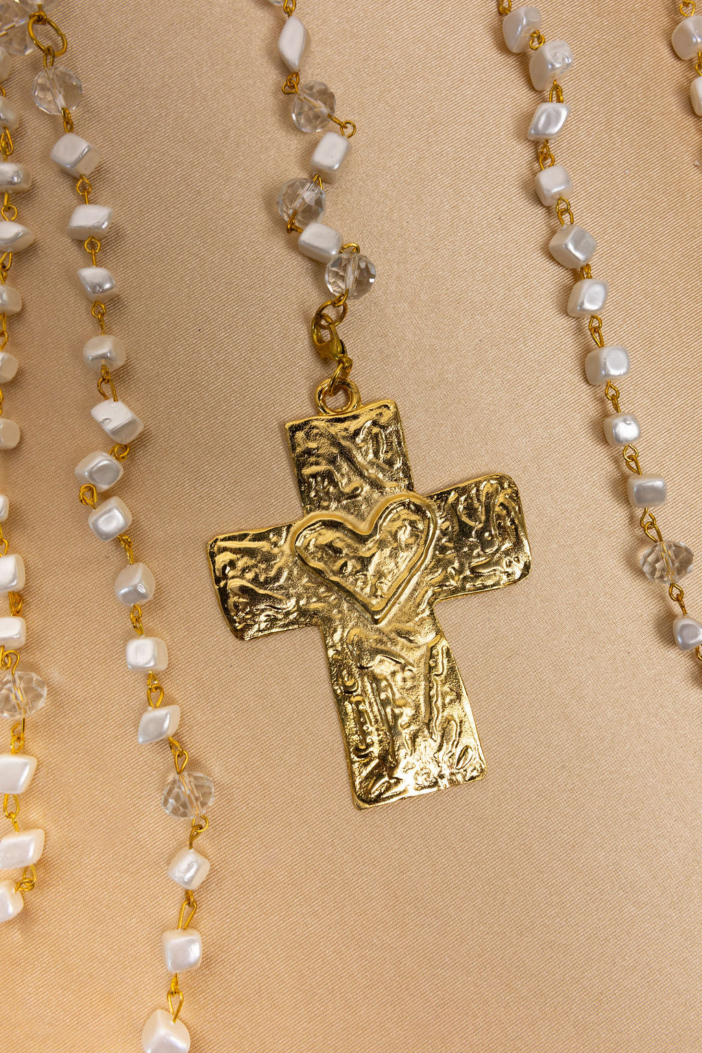 Lazo matrimonial de perlas cultivadas con crucifijo de metal dorado