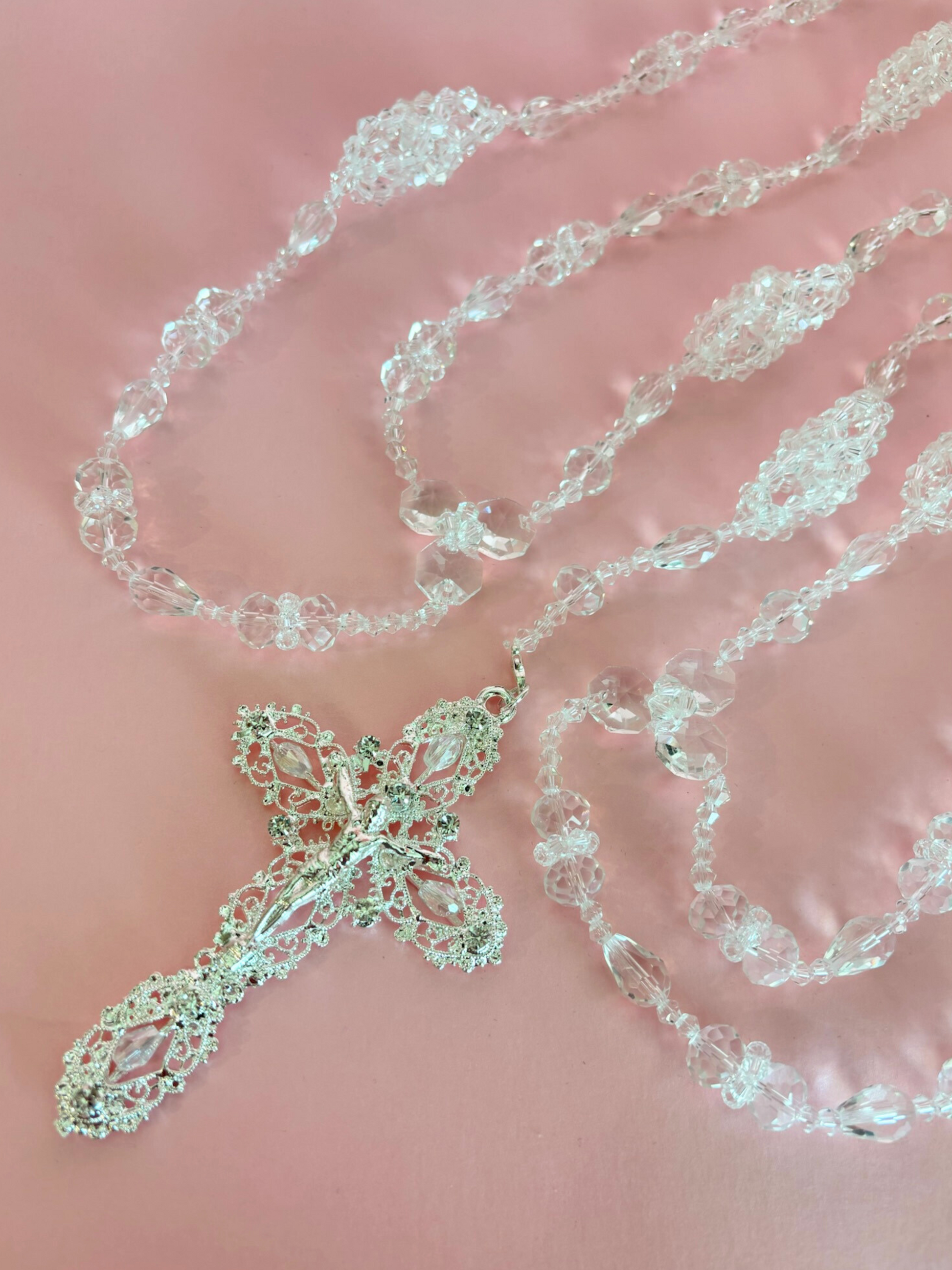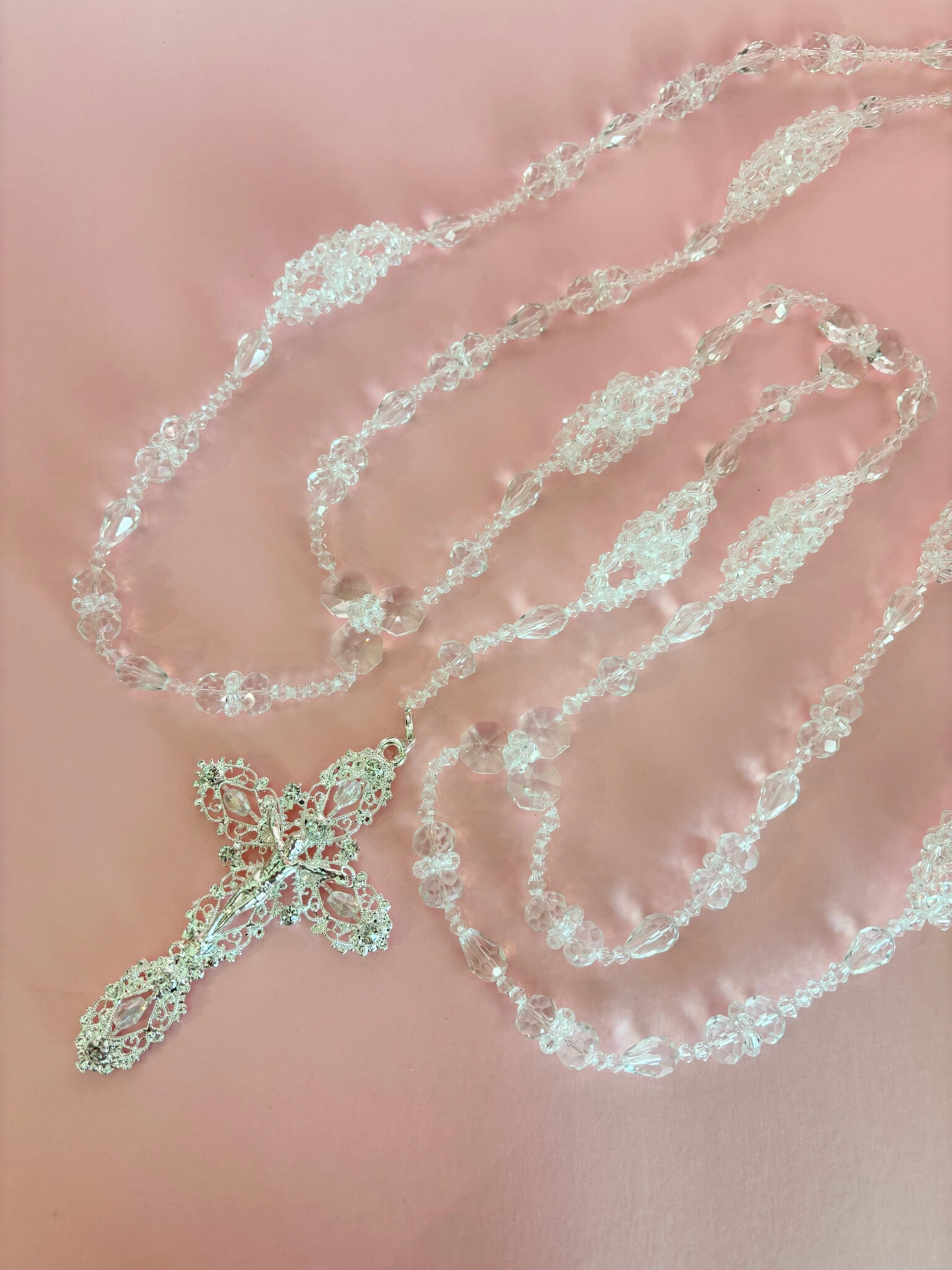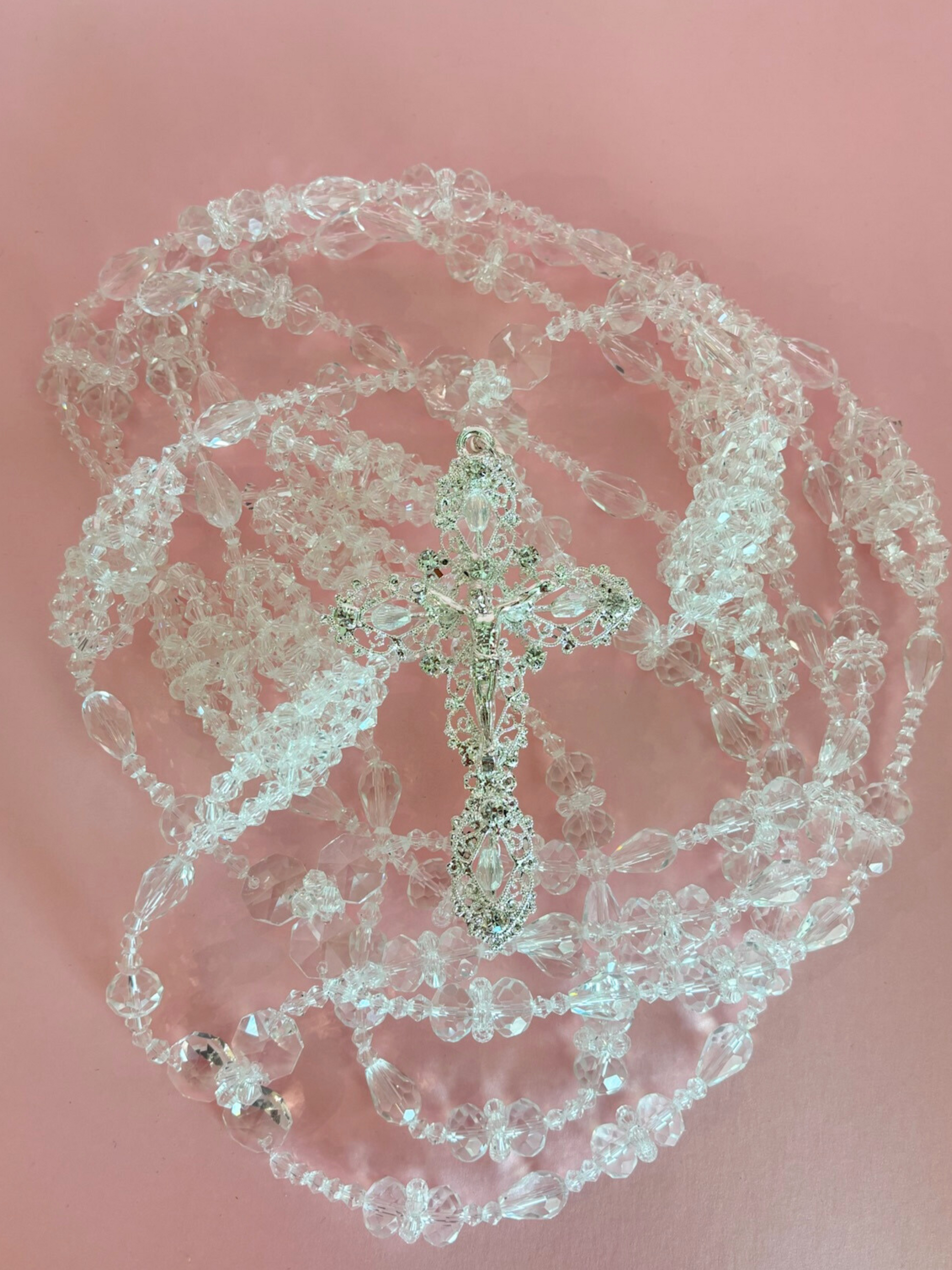 Lazo matrimonial de cristales de distintos tamaños ramificados con crucifijo de metal plateado