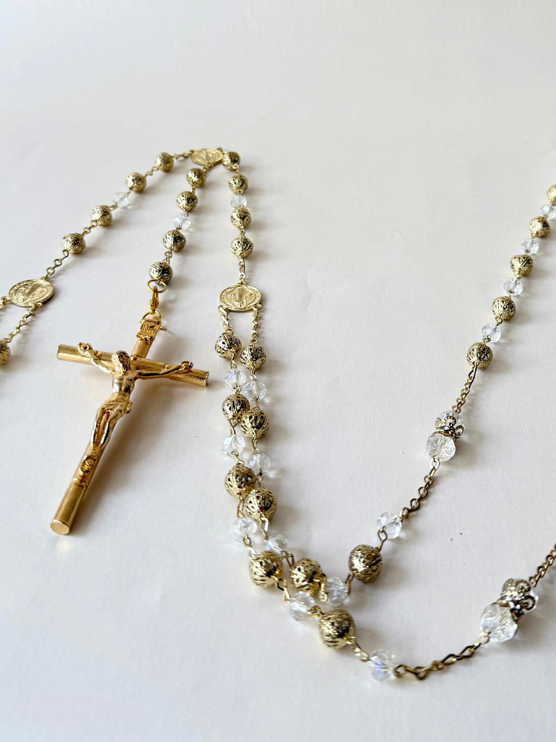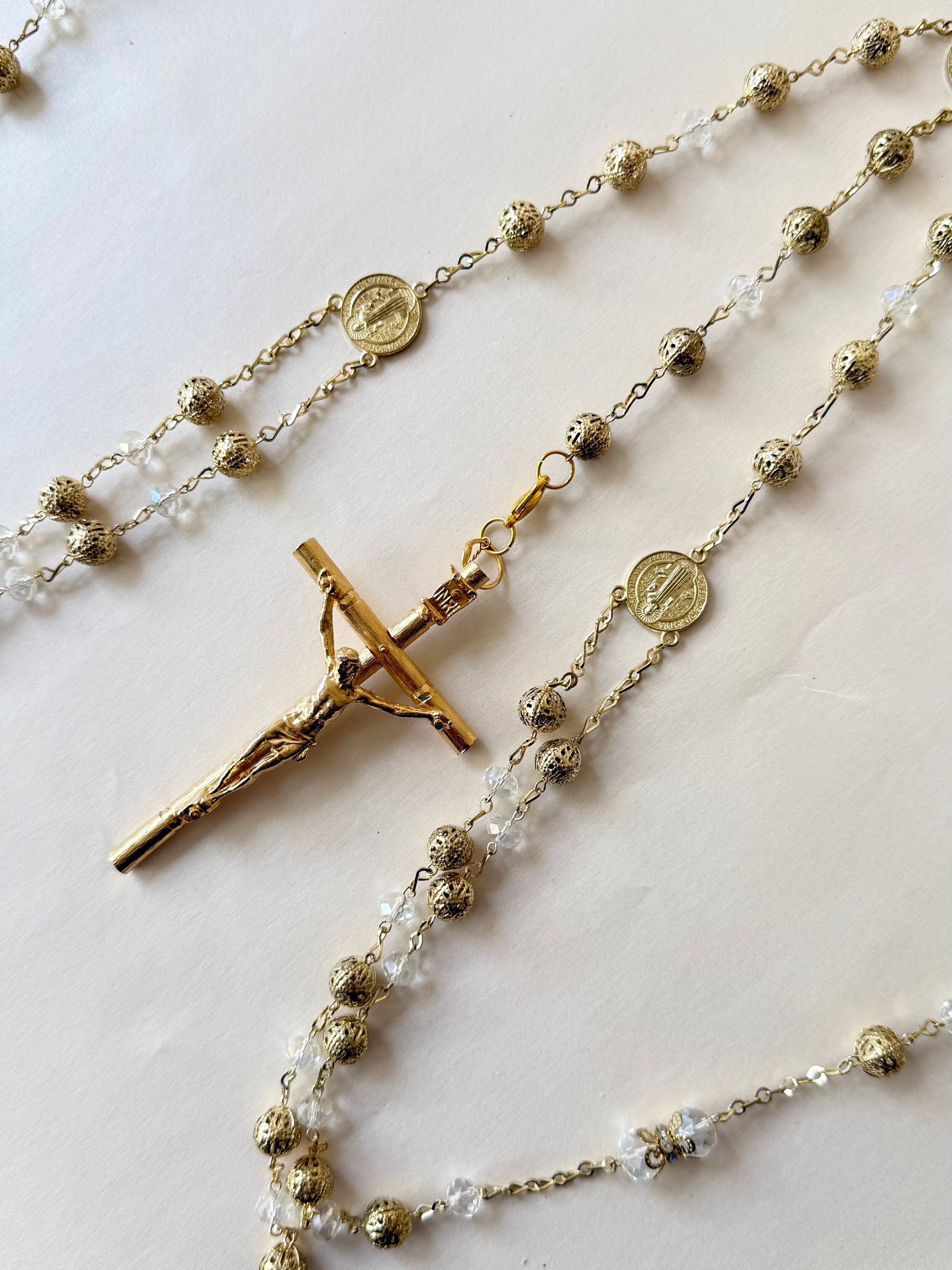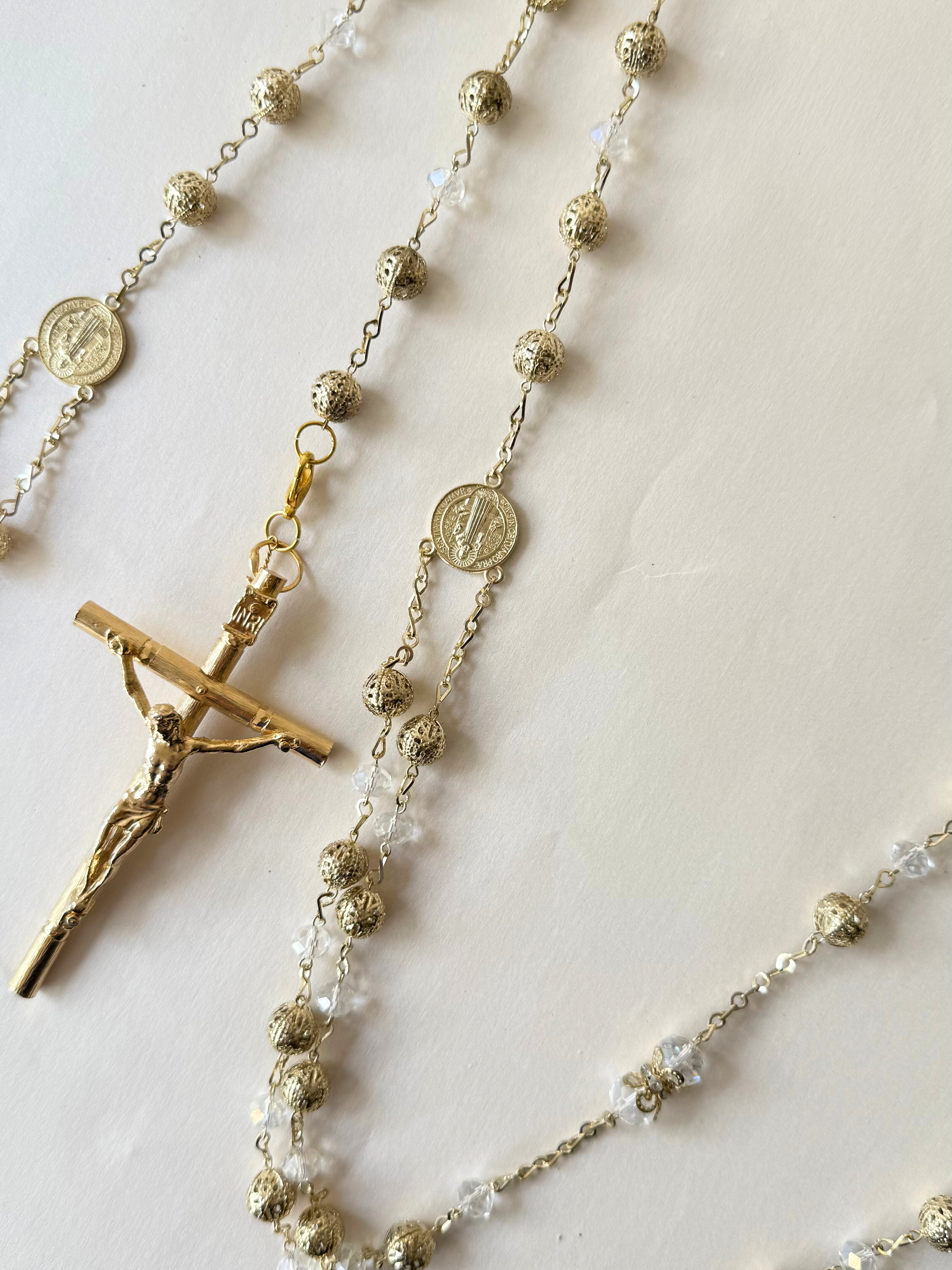 Lazo con cuentas de pedrería transparente y cuentas doradas caladas, con cruz de pedrería y crucifijo dorado