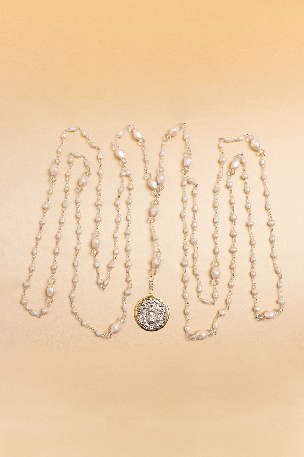Lazo matrimonial de perlas cultivadas de distintos tamaños y dije con la figura de la virgen de guadalupe