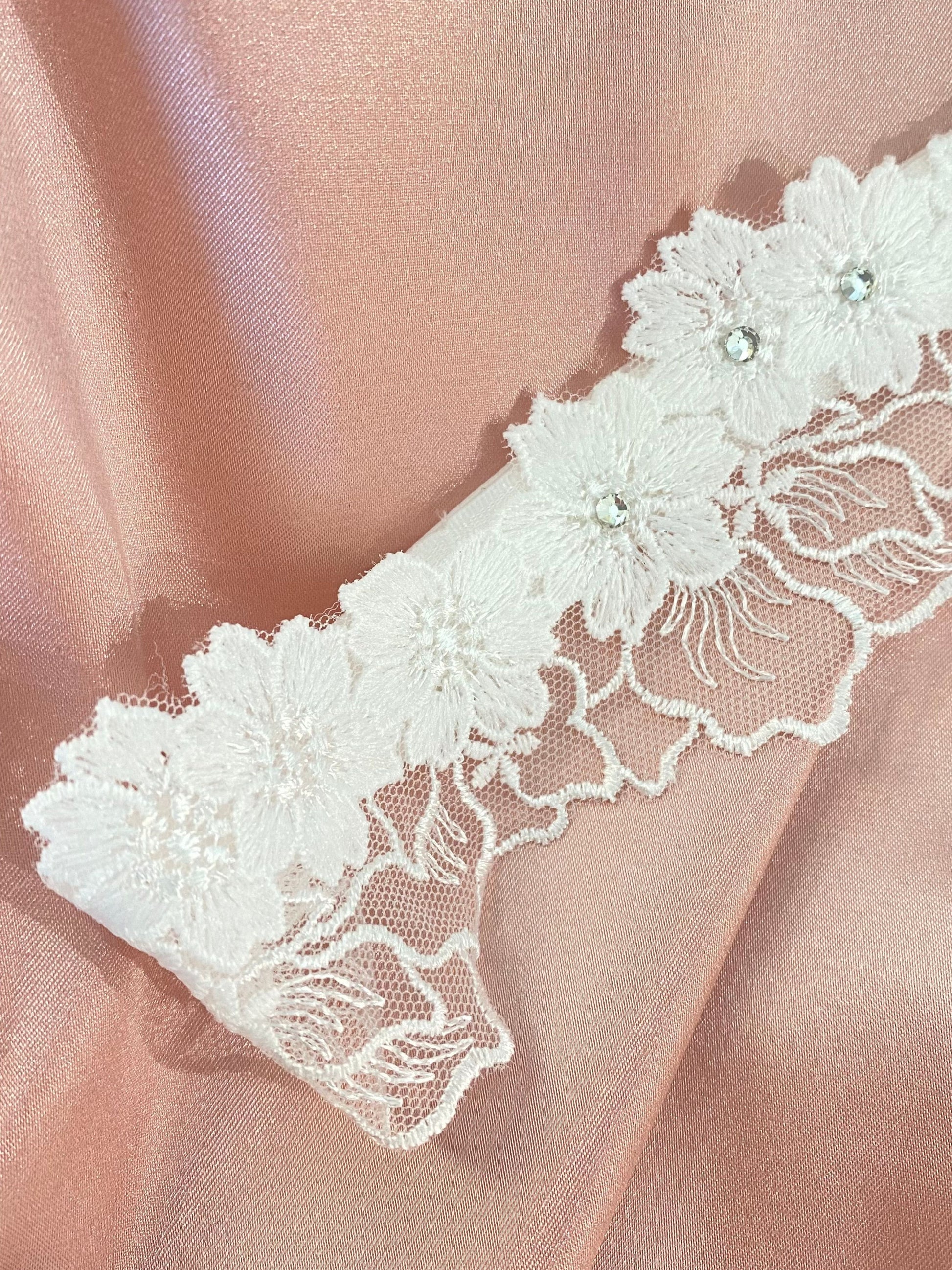 Liguero ajustable de aplicaciones de flores y hojas, con pequeños detalles de pedrería en el centro.