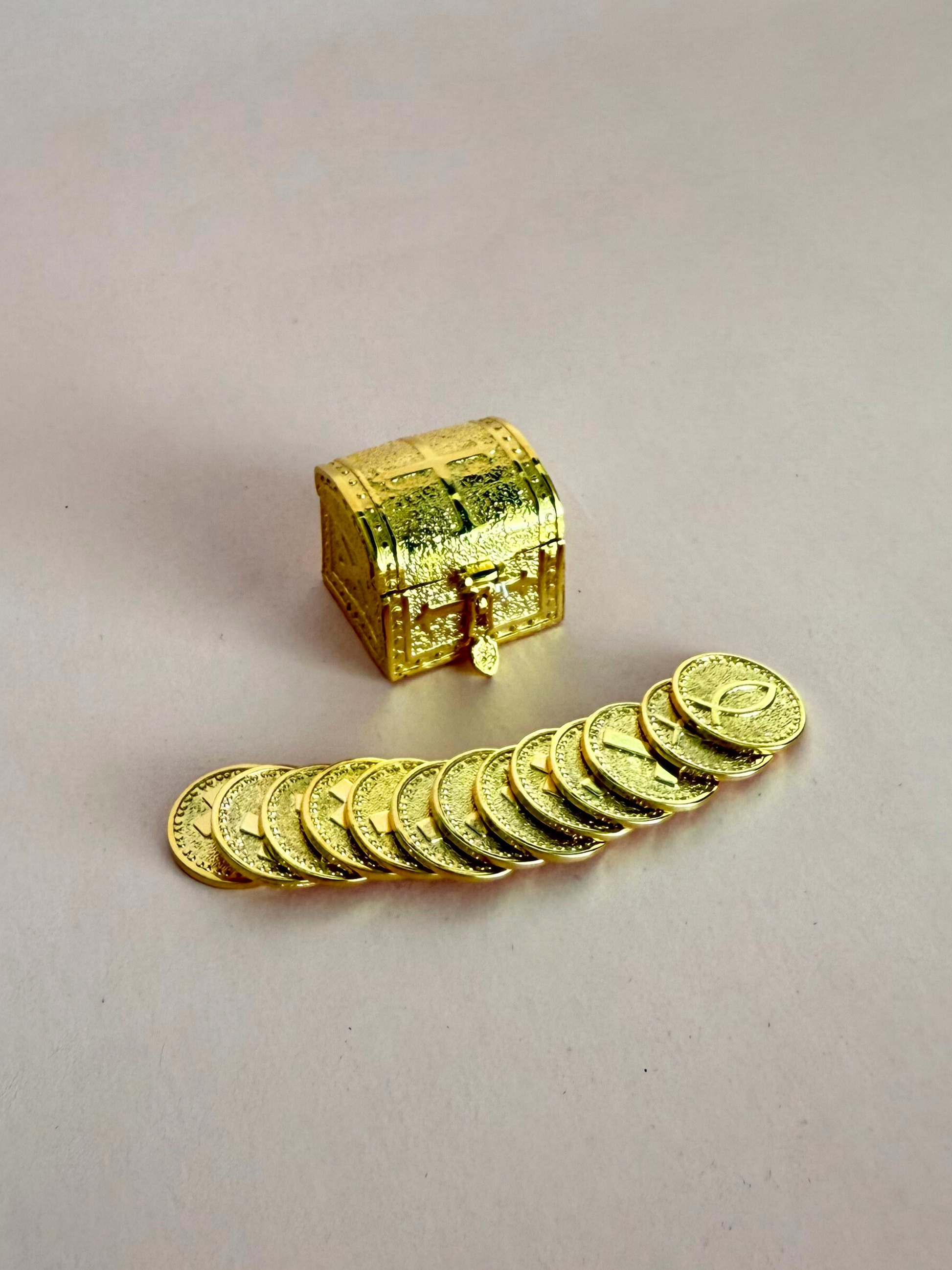 Cofre de metal en tono dorado con 13 monedas con chapa de oro