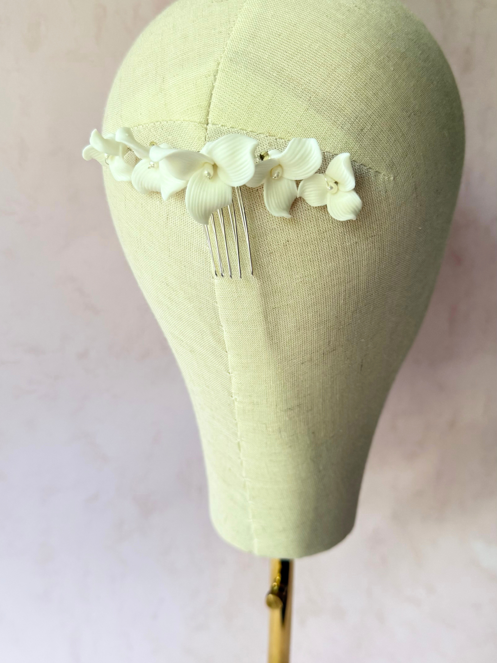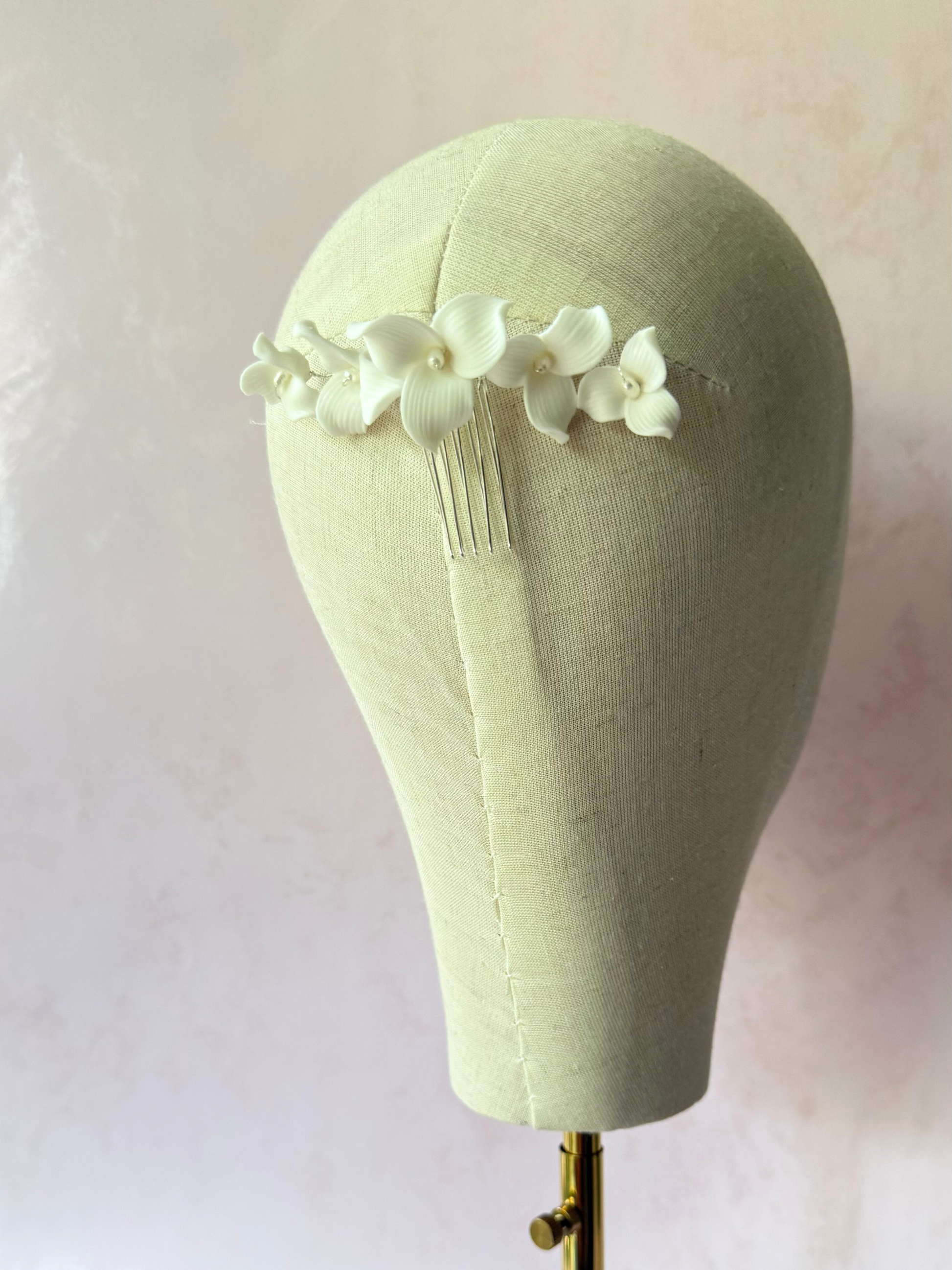 Peineta de metal para novia con 5 flores de porcelana chicas