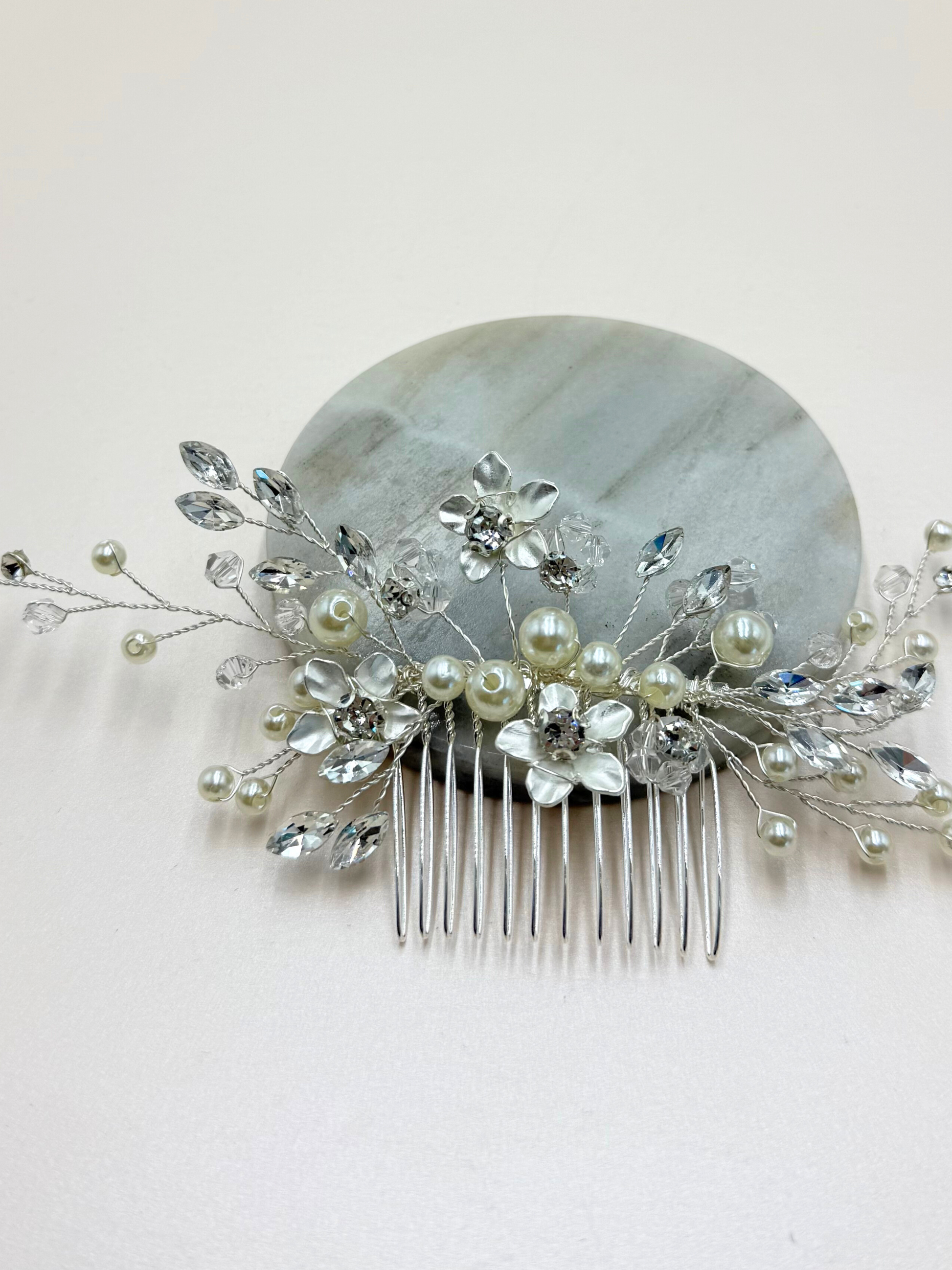 Peineta de metal en tono plateado con cristales y perlas