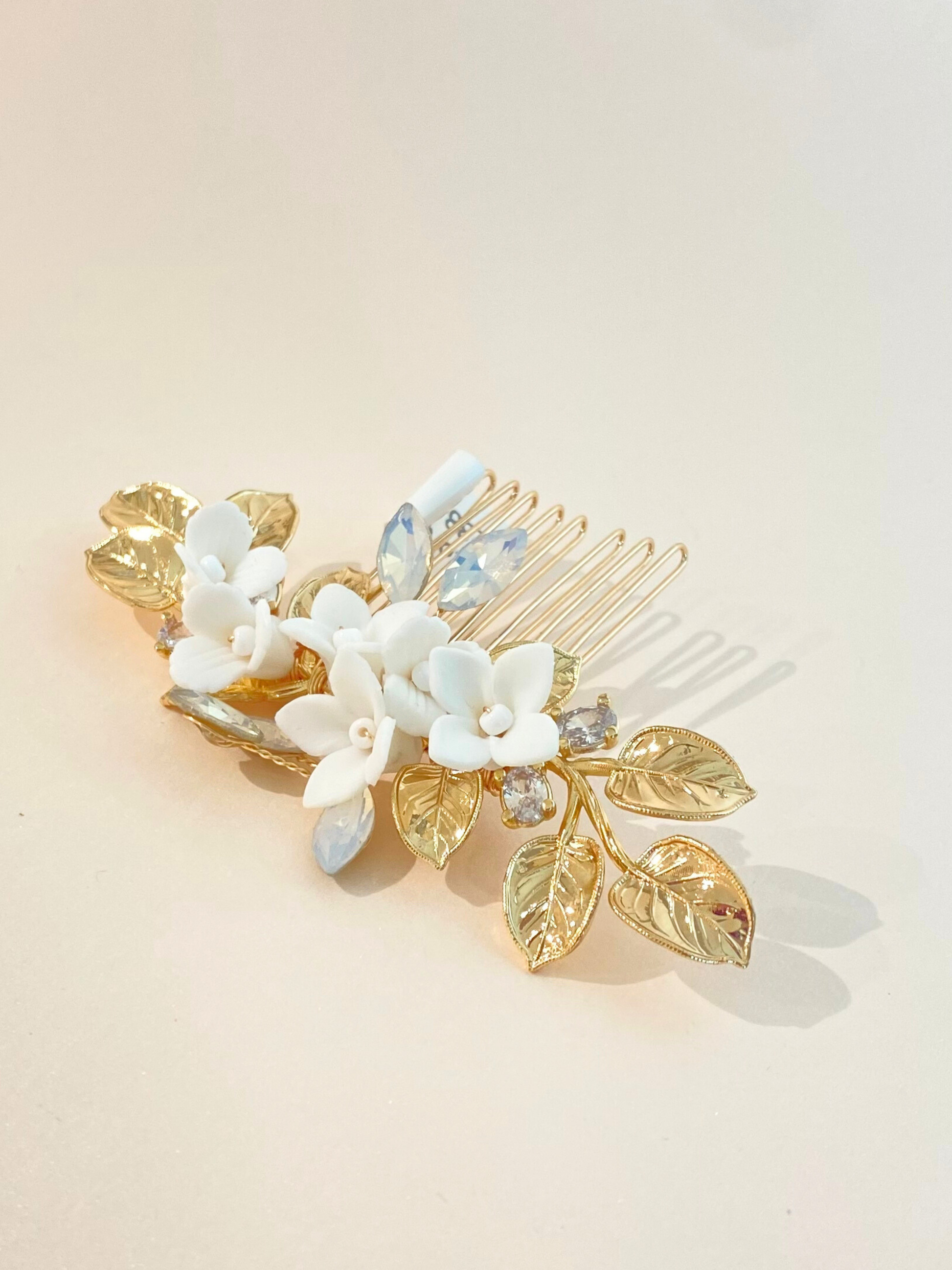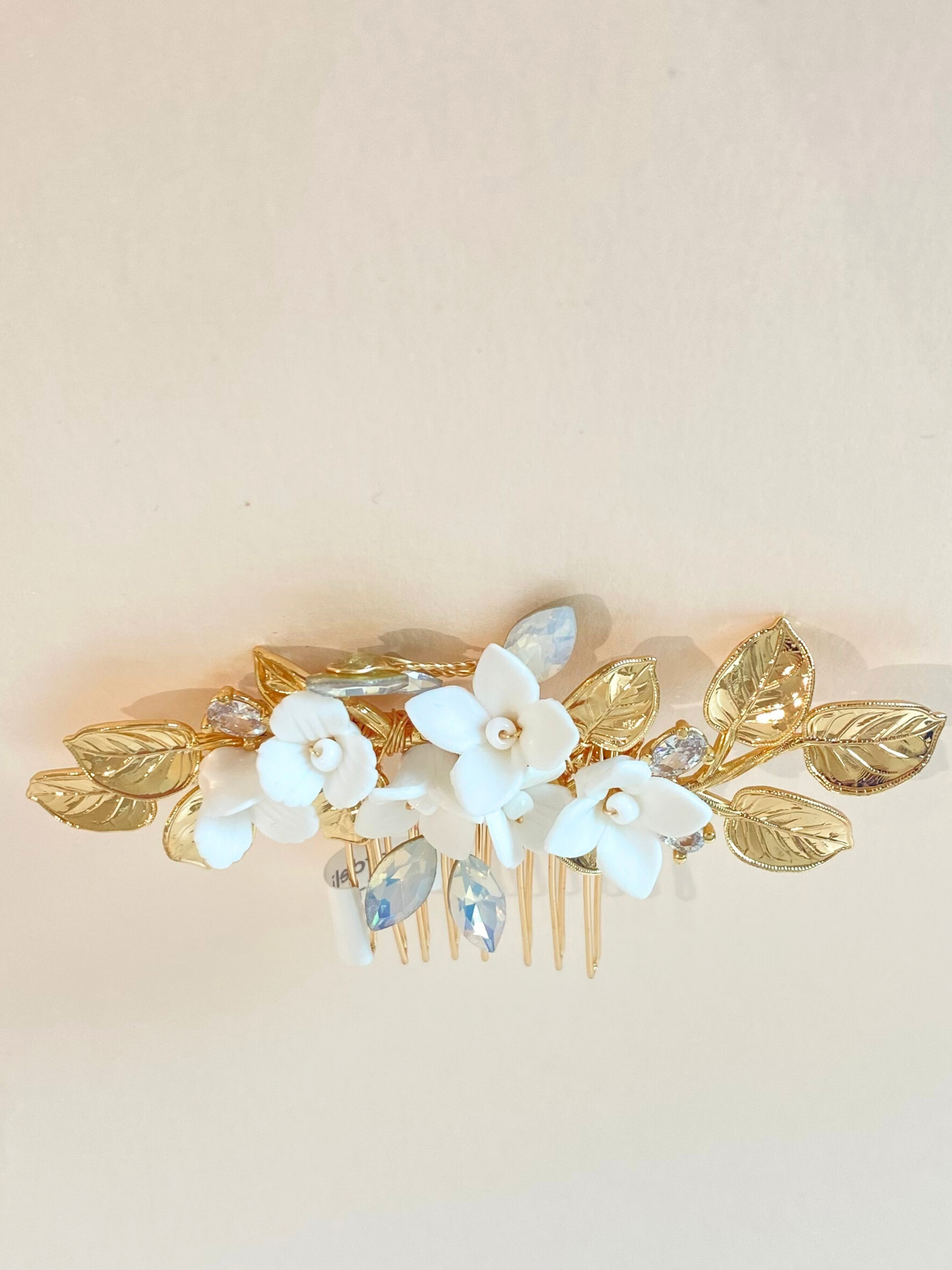 Peineta metálica tono dorado con aplicaciones de flores de porcelana