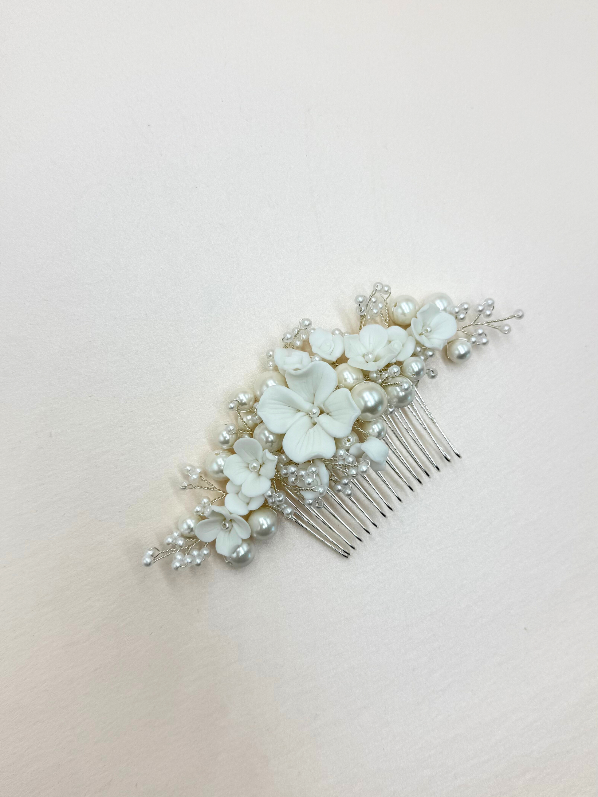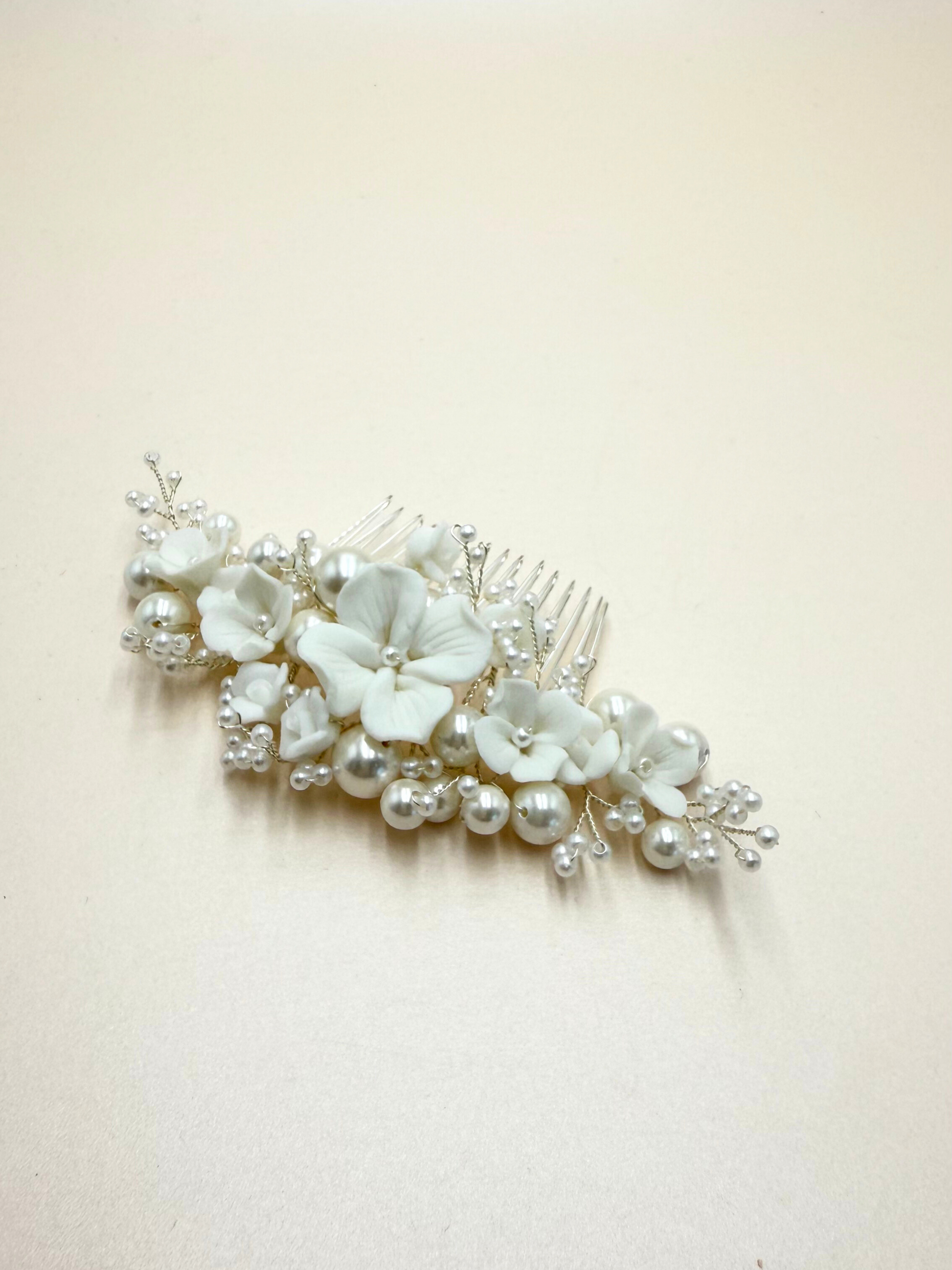 Peineta de metal en tono plateado con flores de porcelana en distintos tamaños , perlas y cuentas blancas