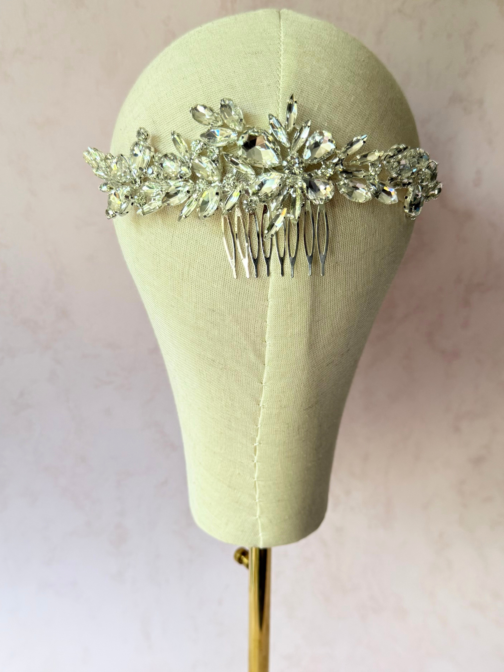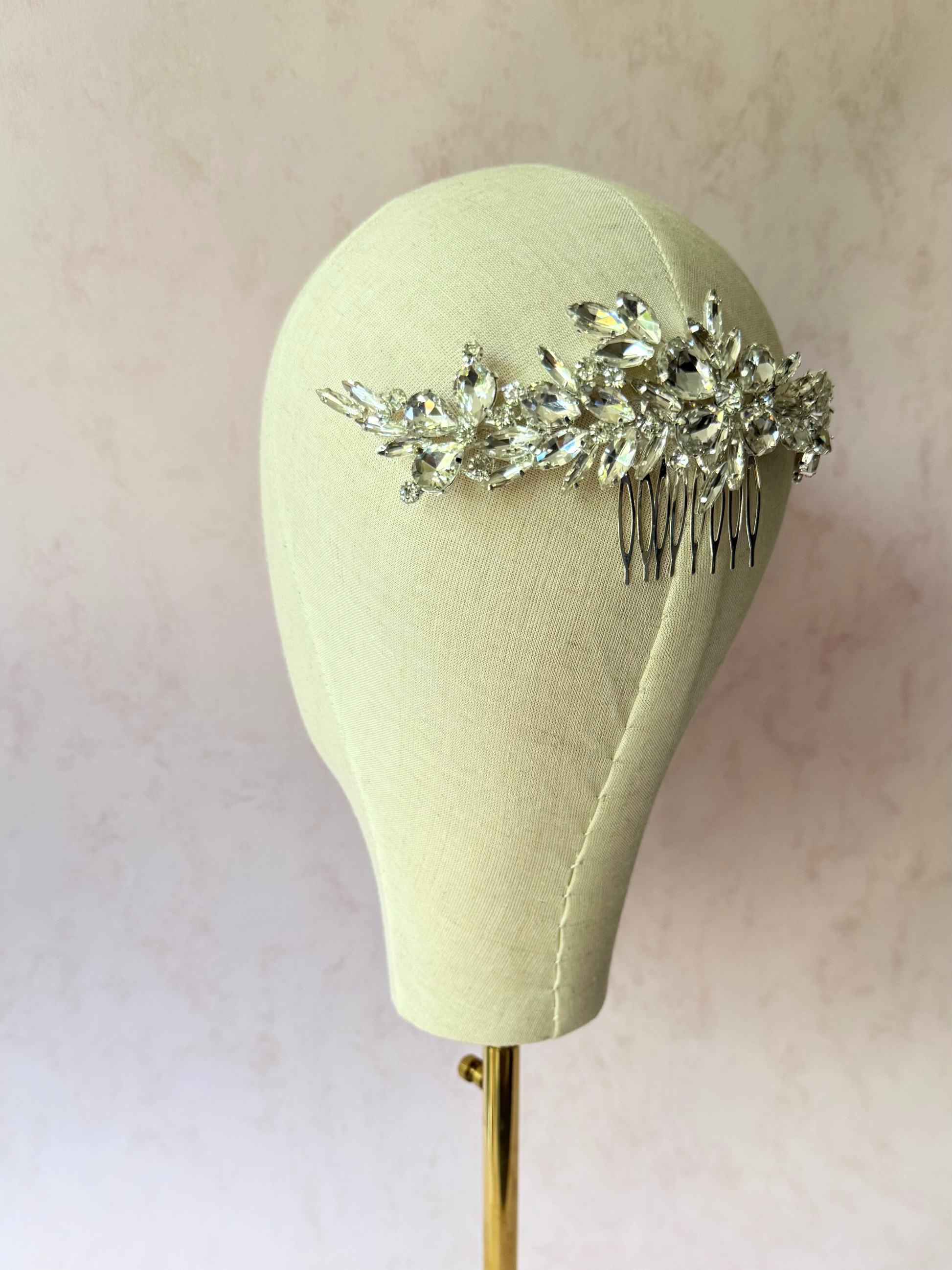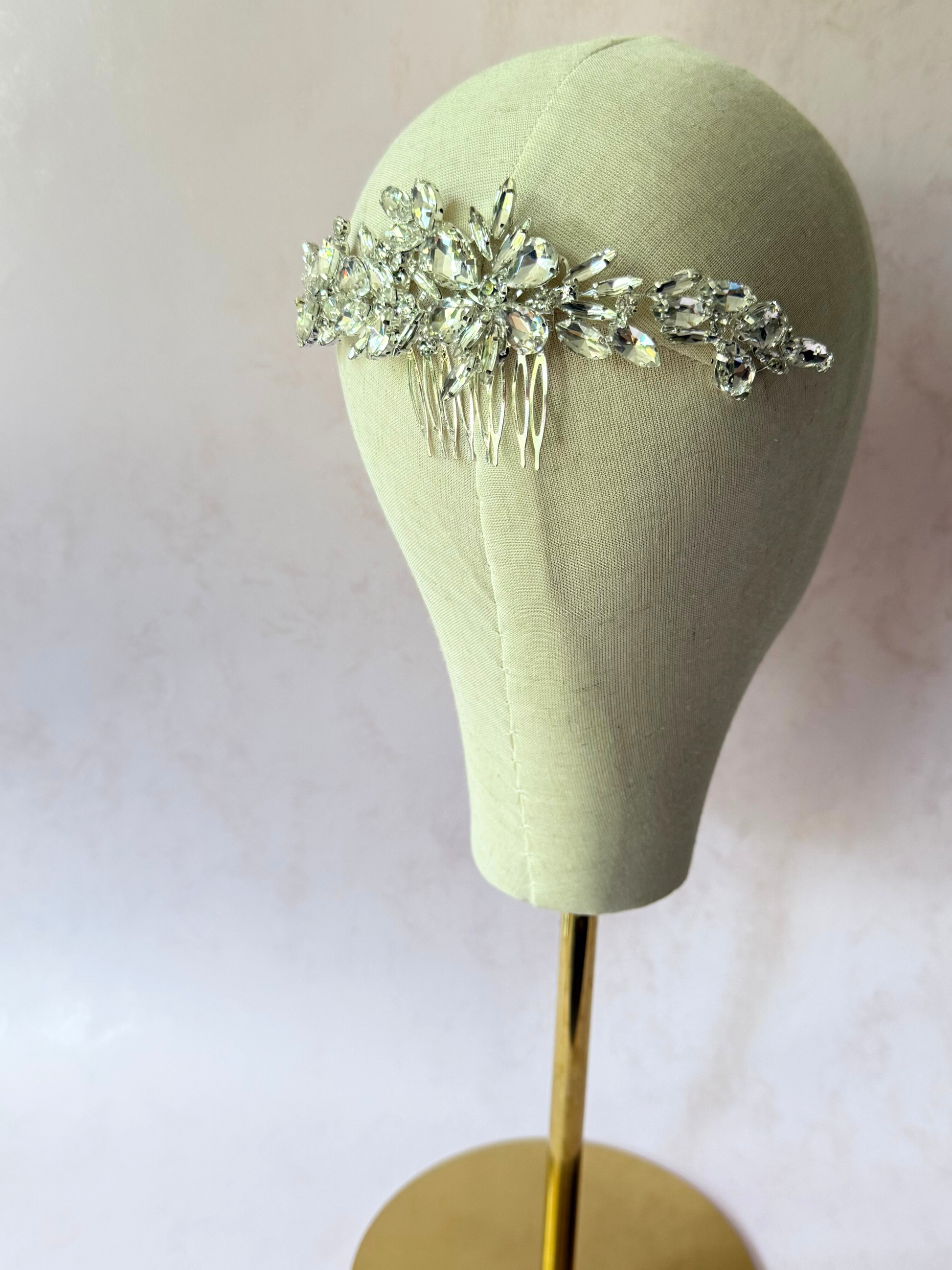 Peineta de metal en tono plata con cristales
