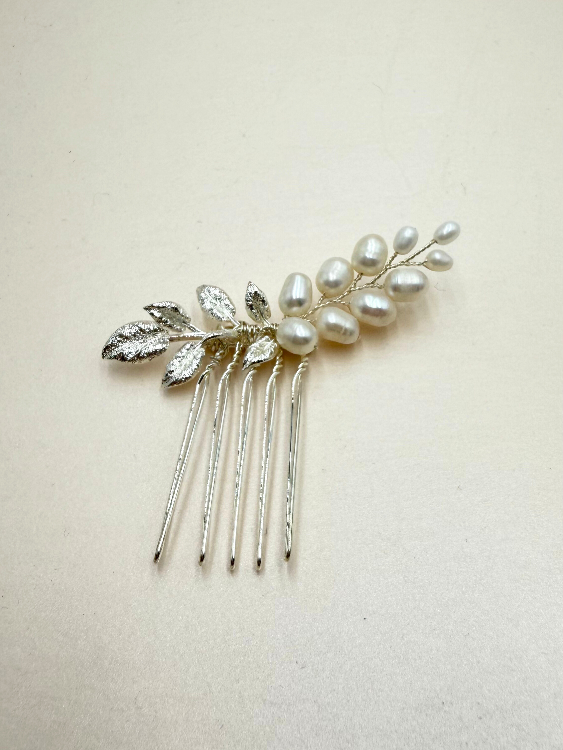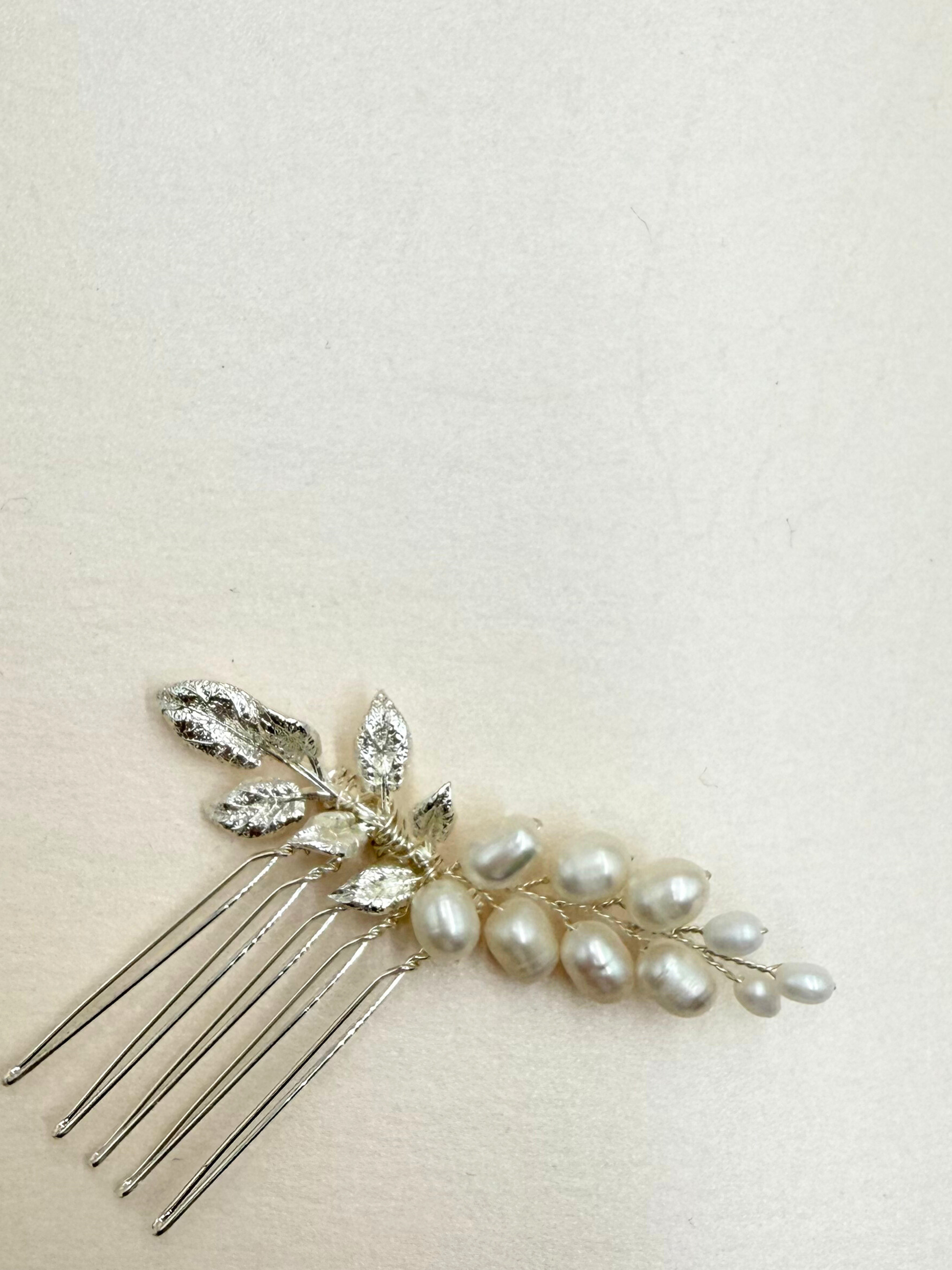 Peineta de metal en tono plateado con hojas plateadas y perlas de distintos tamaños