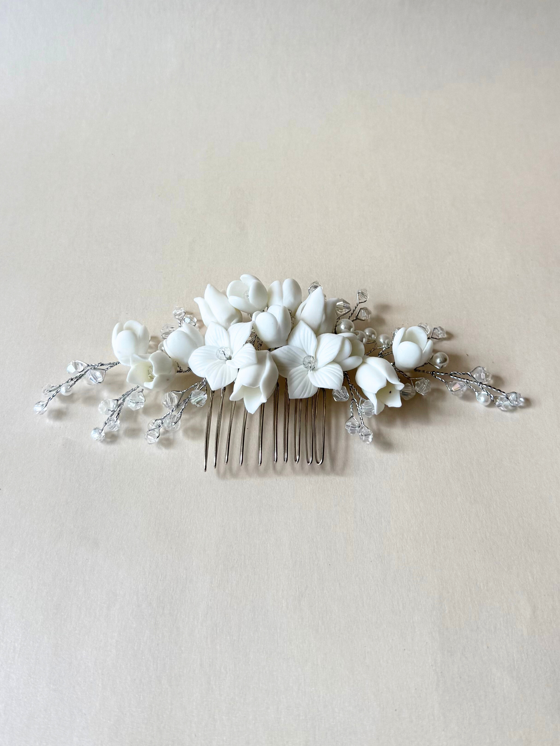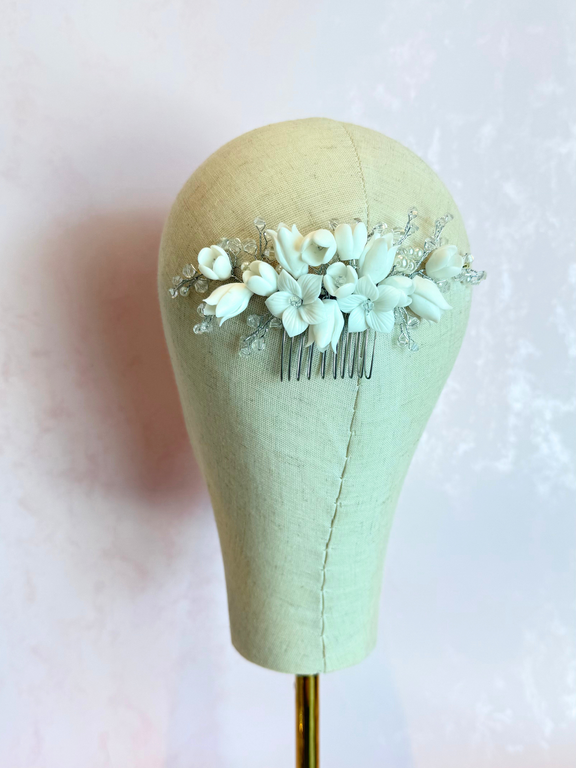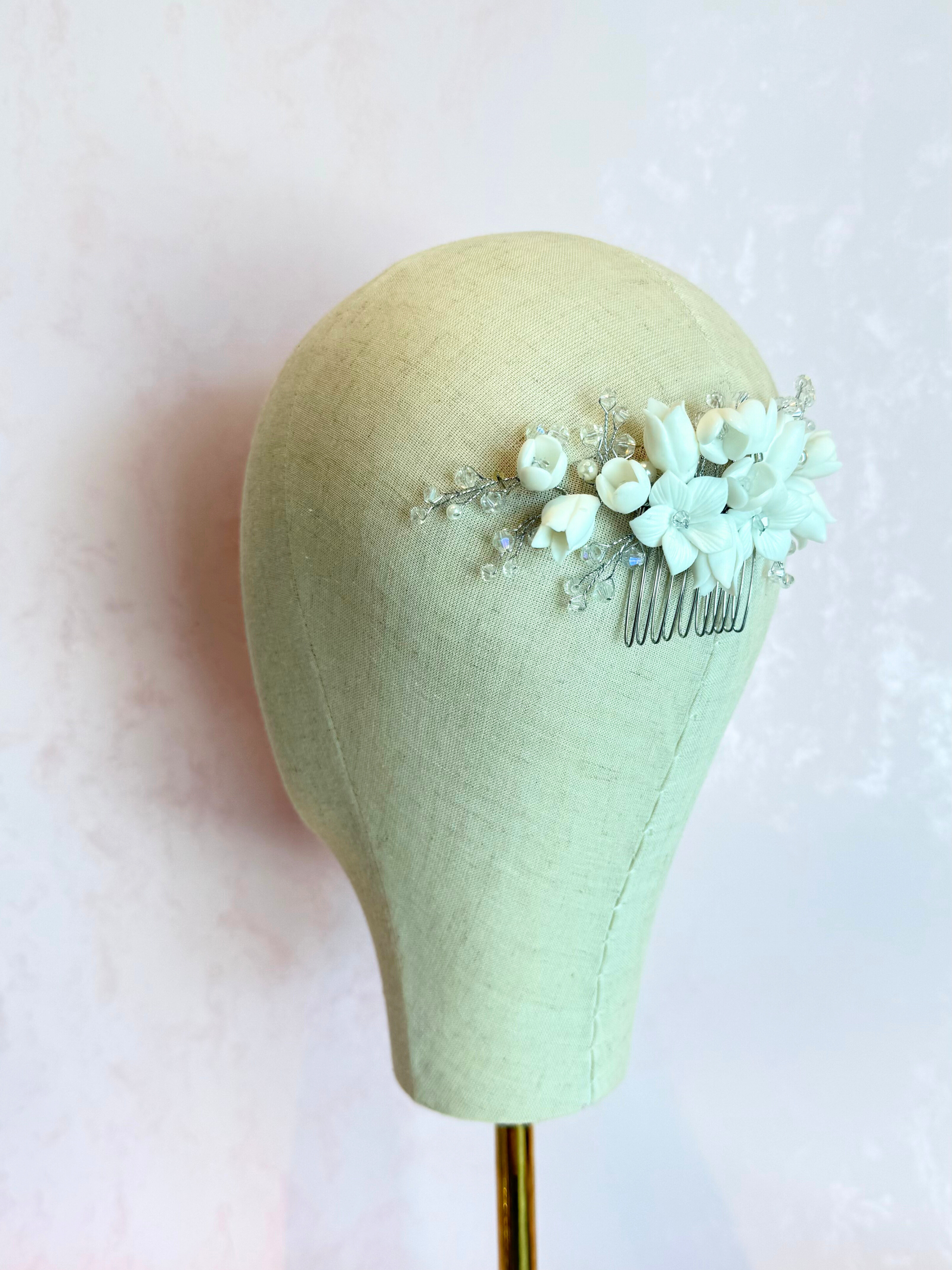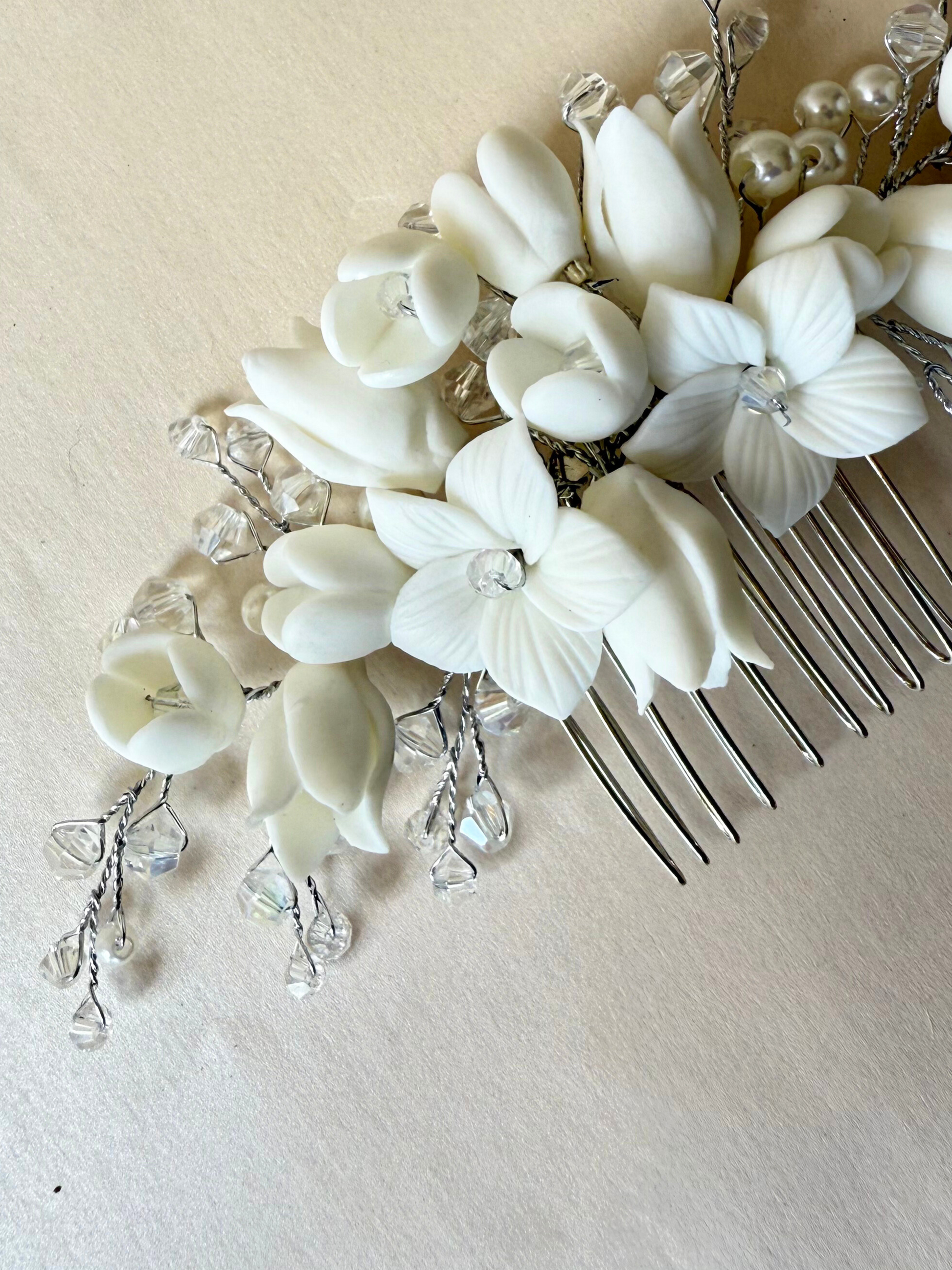 Peineta de metal con flores de porcelana blanca de distintos tamaños , perlas y cristales tornasol