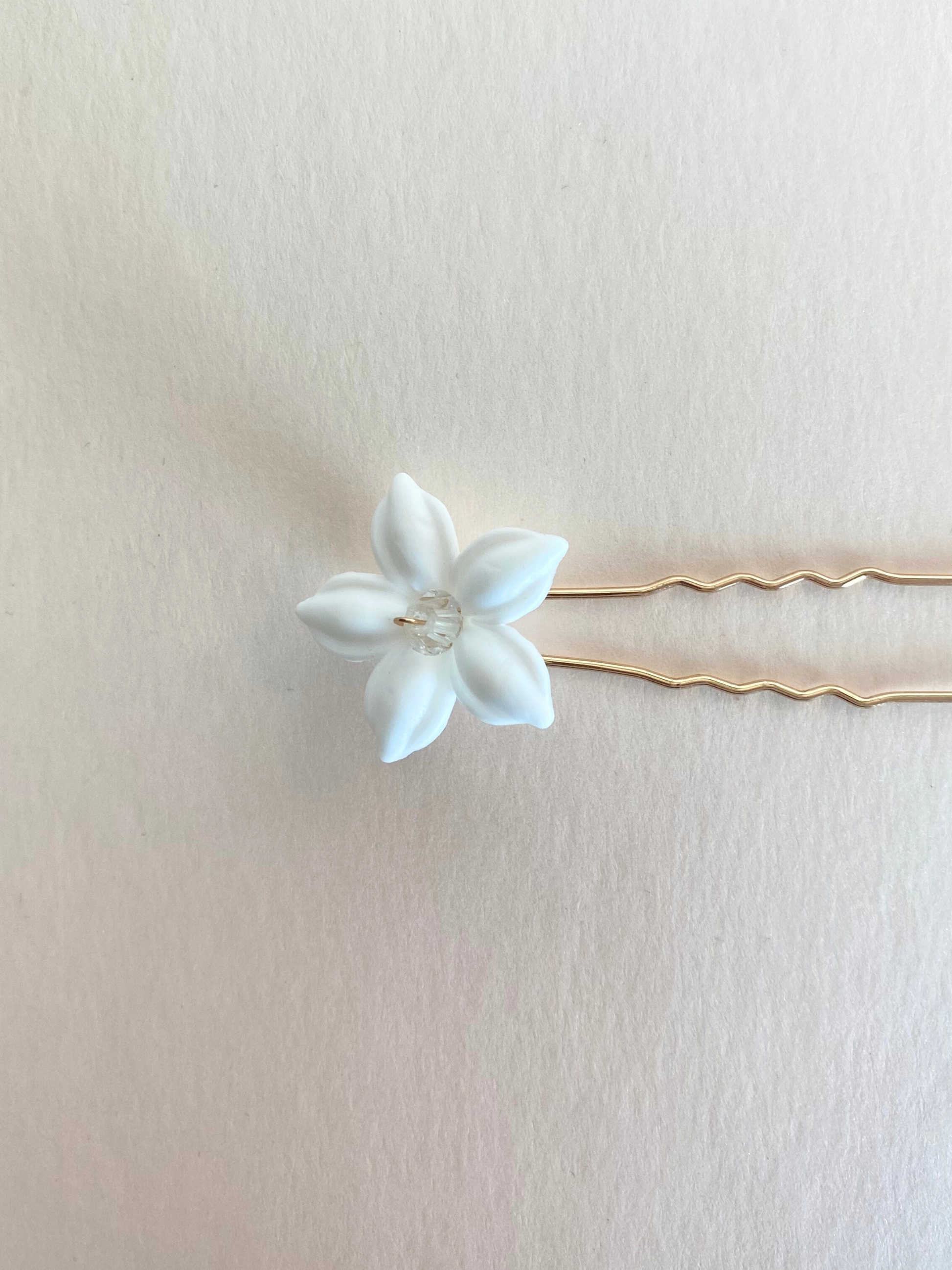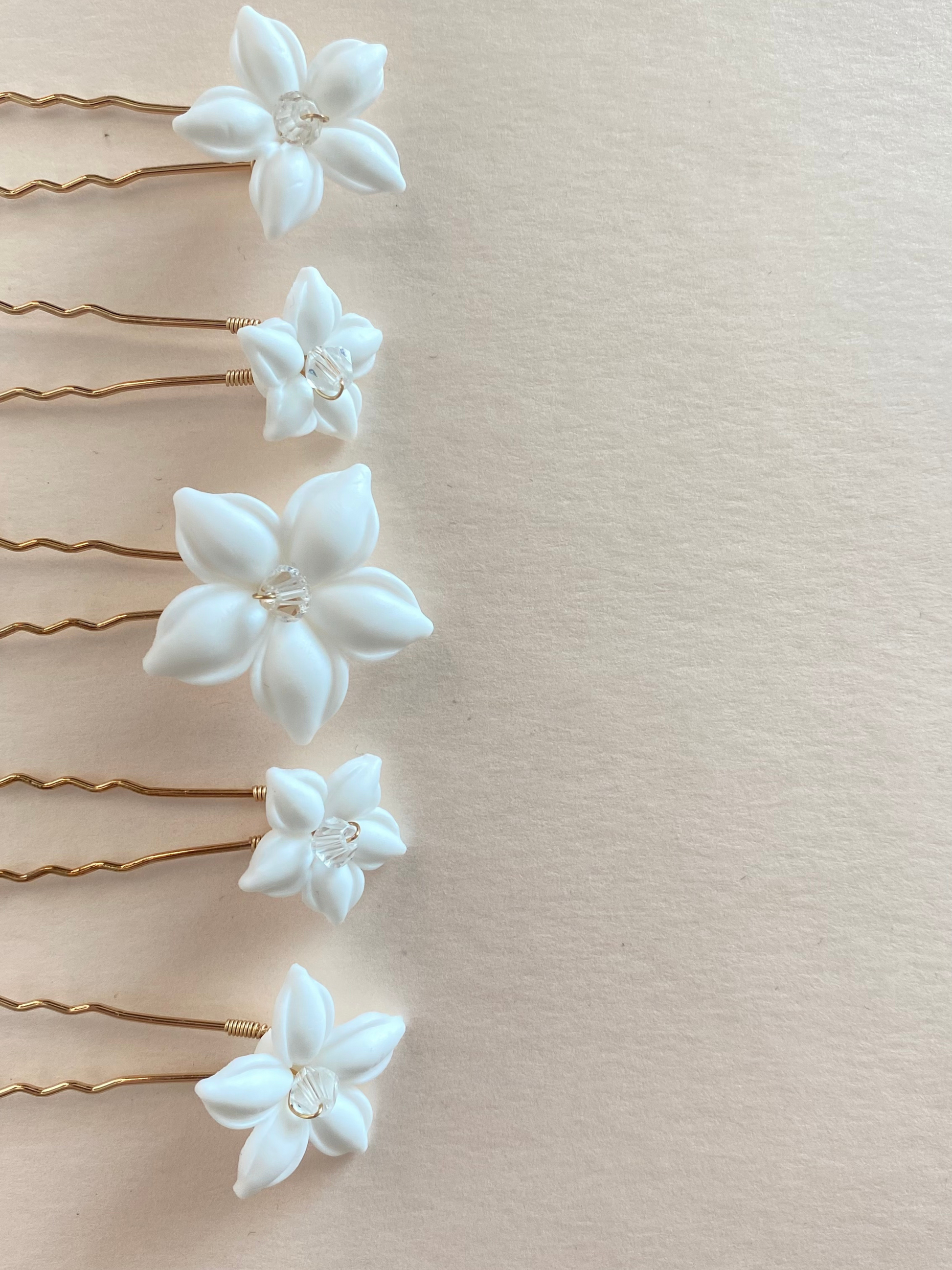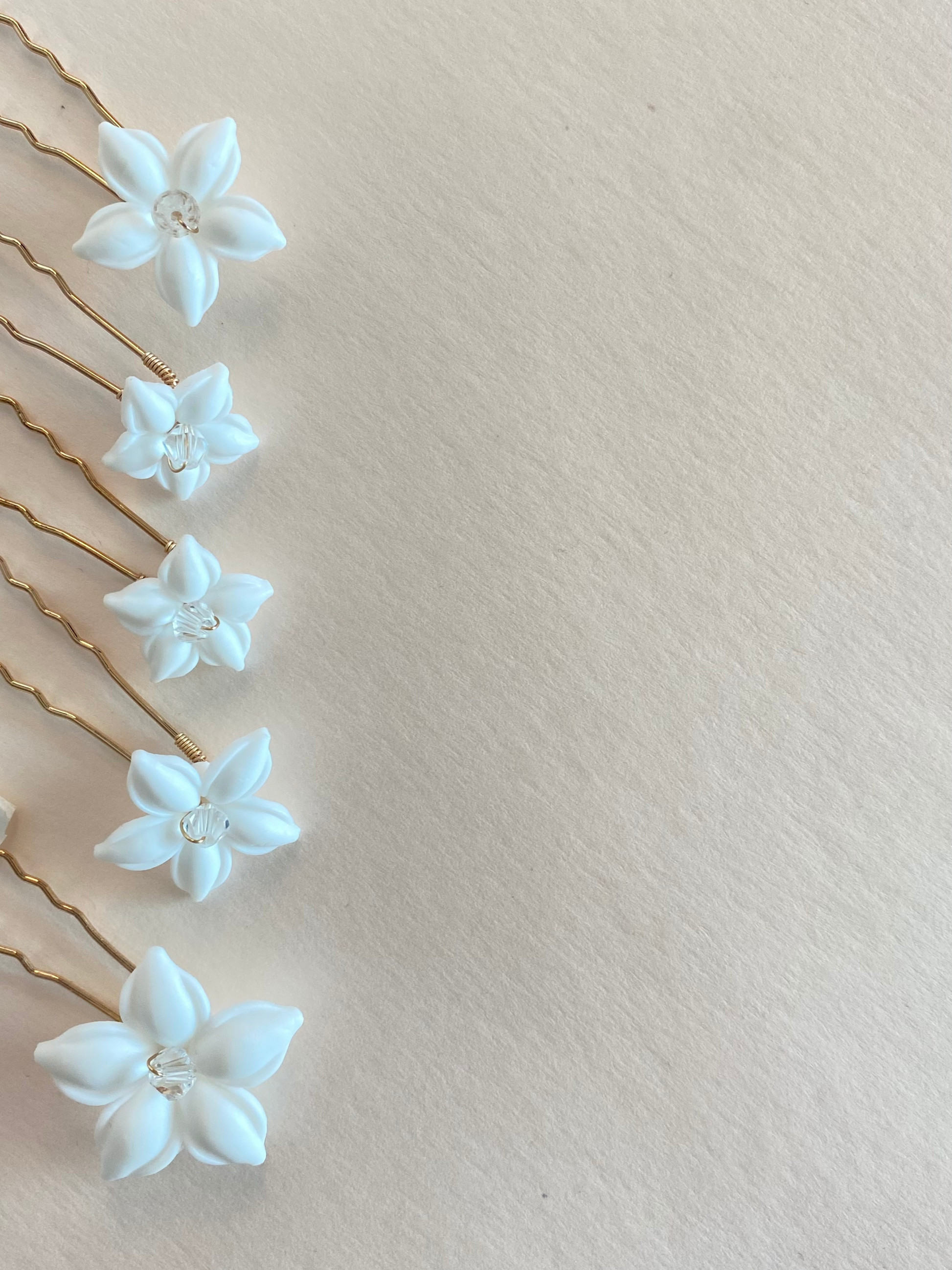 El paquete incluye 5 pines de porcelana blanca de distintas medidas con base de metal en tono dorado y con una piedra de pedrería transparente en medio de la flor