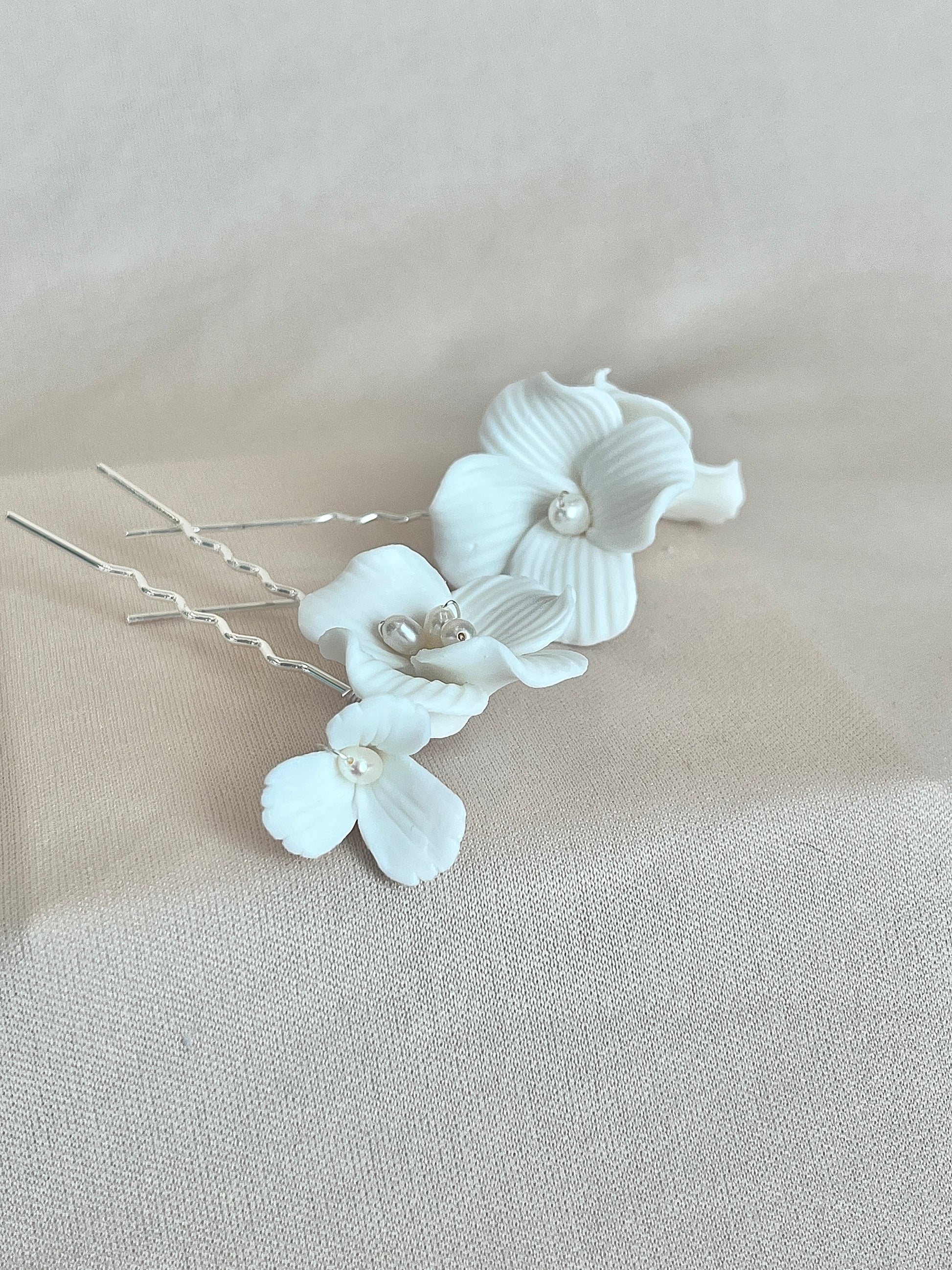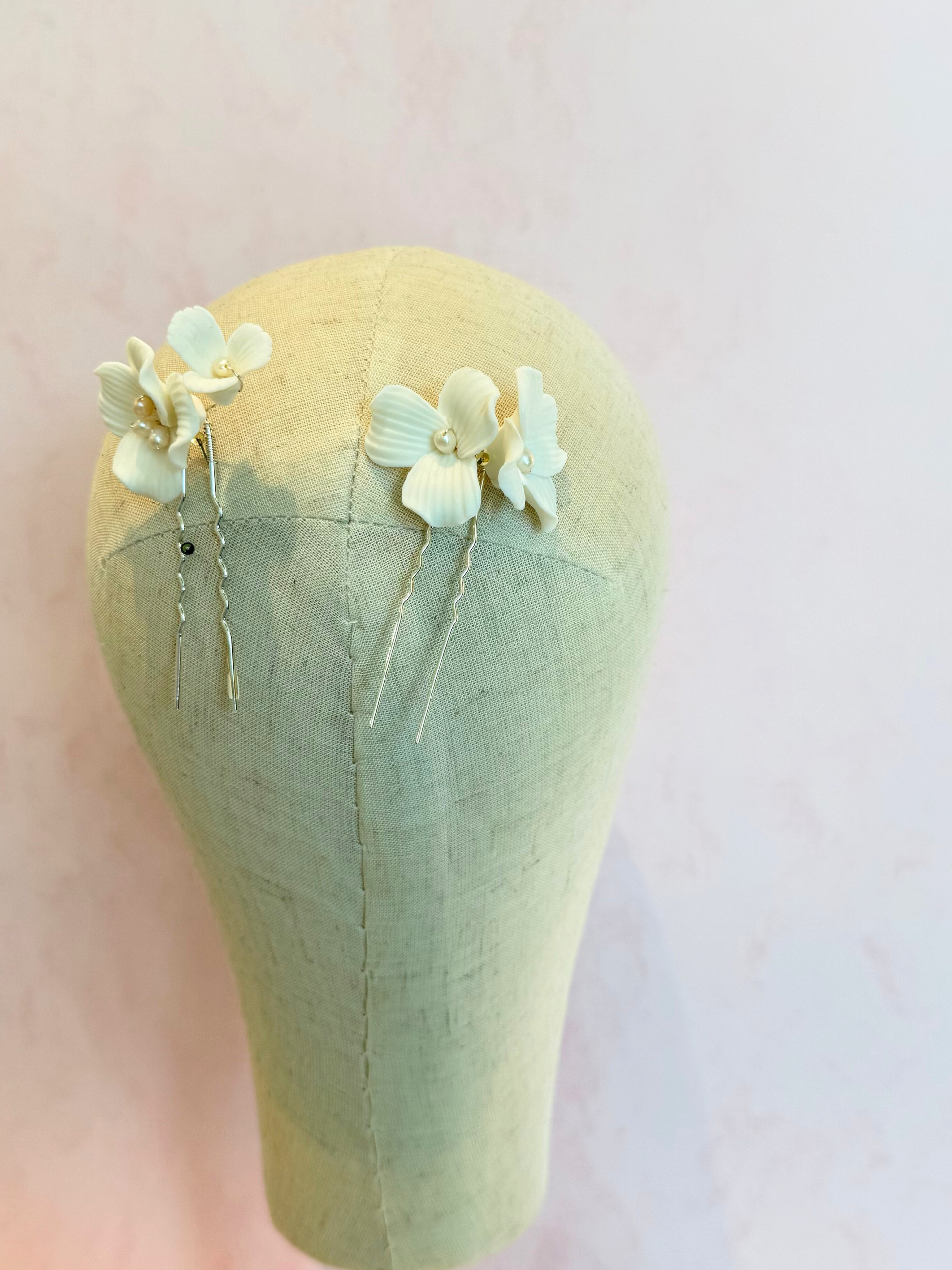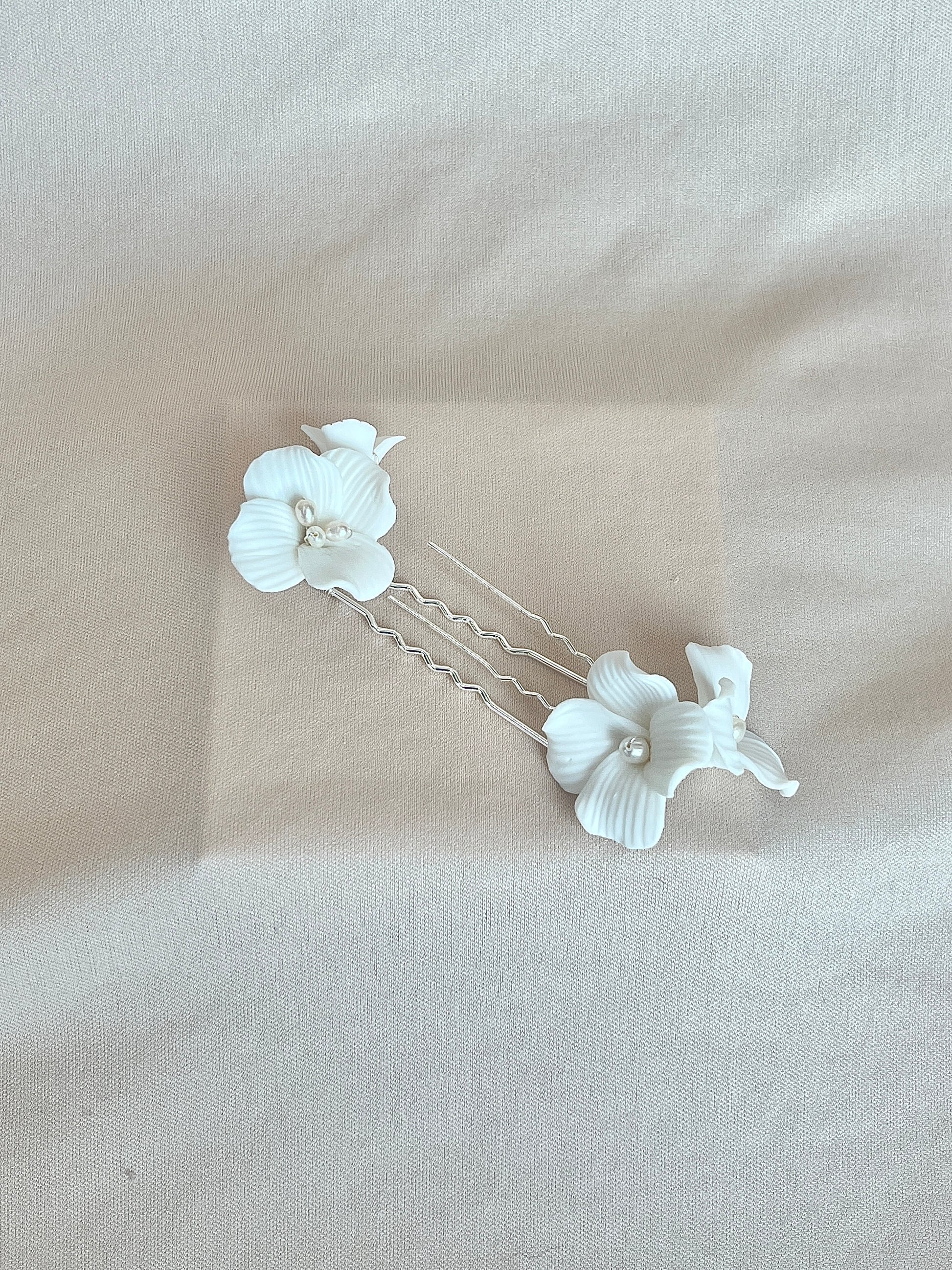 Par de horquillas de metal en tono plateado con 4 flores de porcelana blanca con